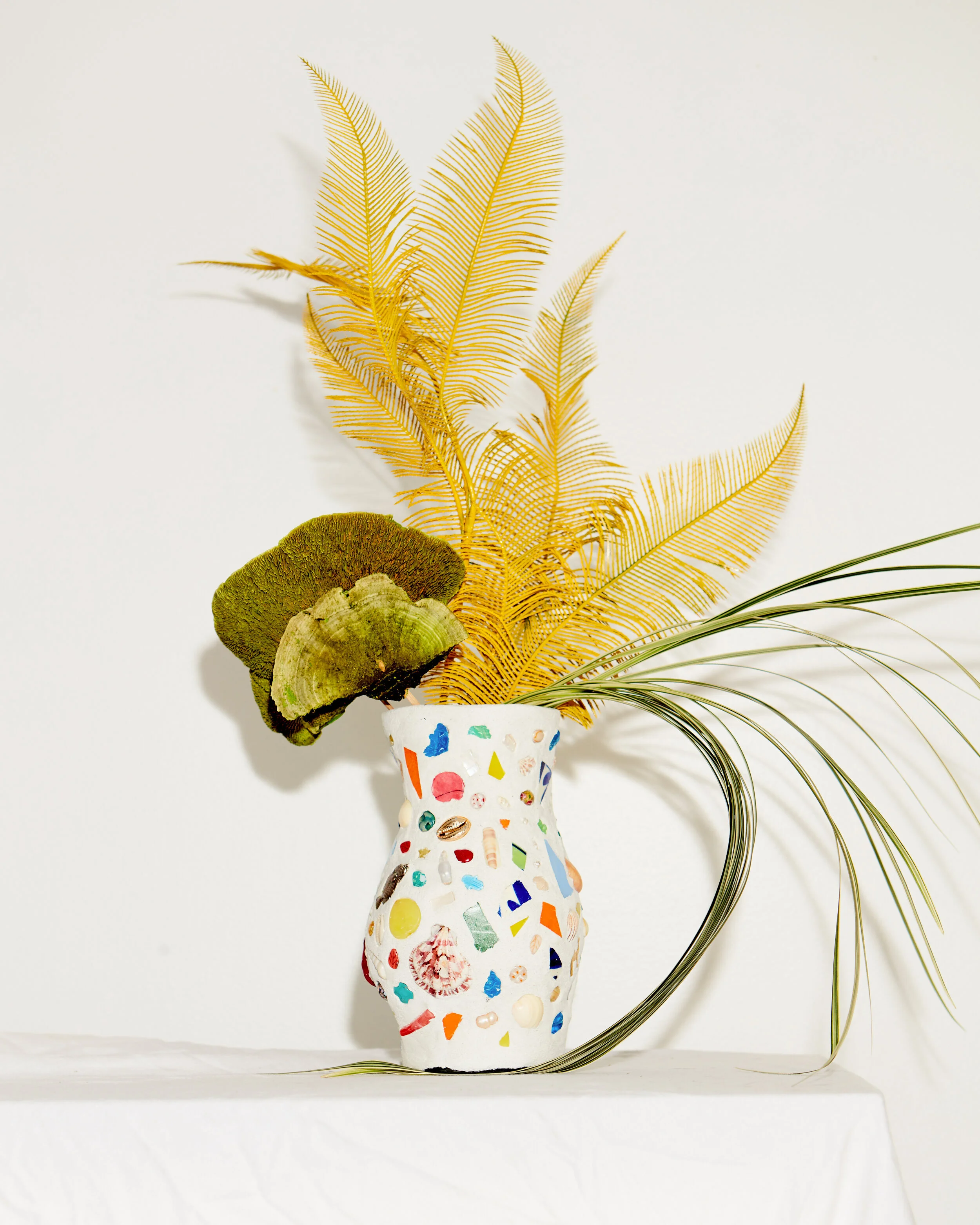 I’ve always been drawn to creating the three-dimensional form. I took ceramic classes in school but found it to be hard to continue without access to expensive materials and facilities. I shifted my focus to textile and fiber sculpture. My process now most closely resembles mosaic work.