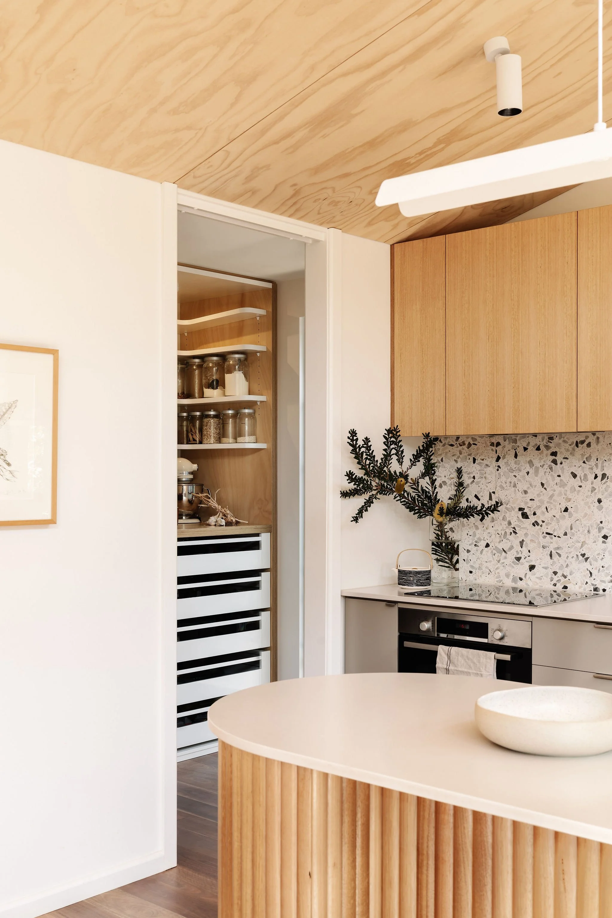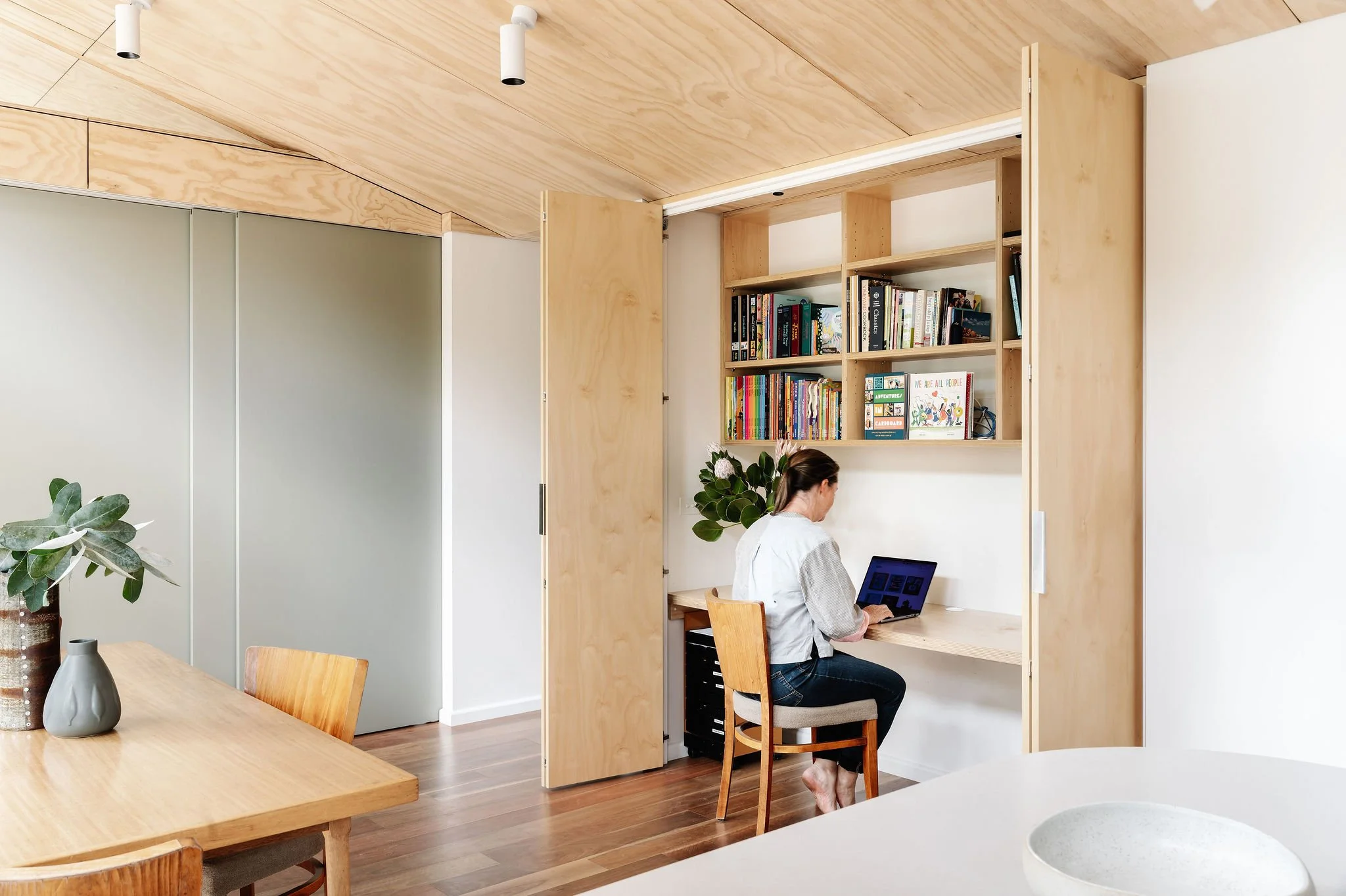 ‘Internal ply lining for walls, ceiling and joinery gave a coherent soft, warm backdrop to the living spaces and allowed the bi-fold doors of the WFH nook to disappear when the doors were closed,’ says Nicola Dovey. Photo: Marnie Hawson I Editorial Styling: Belle Hemming Bright