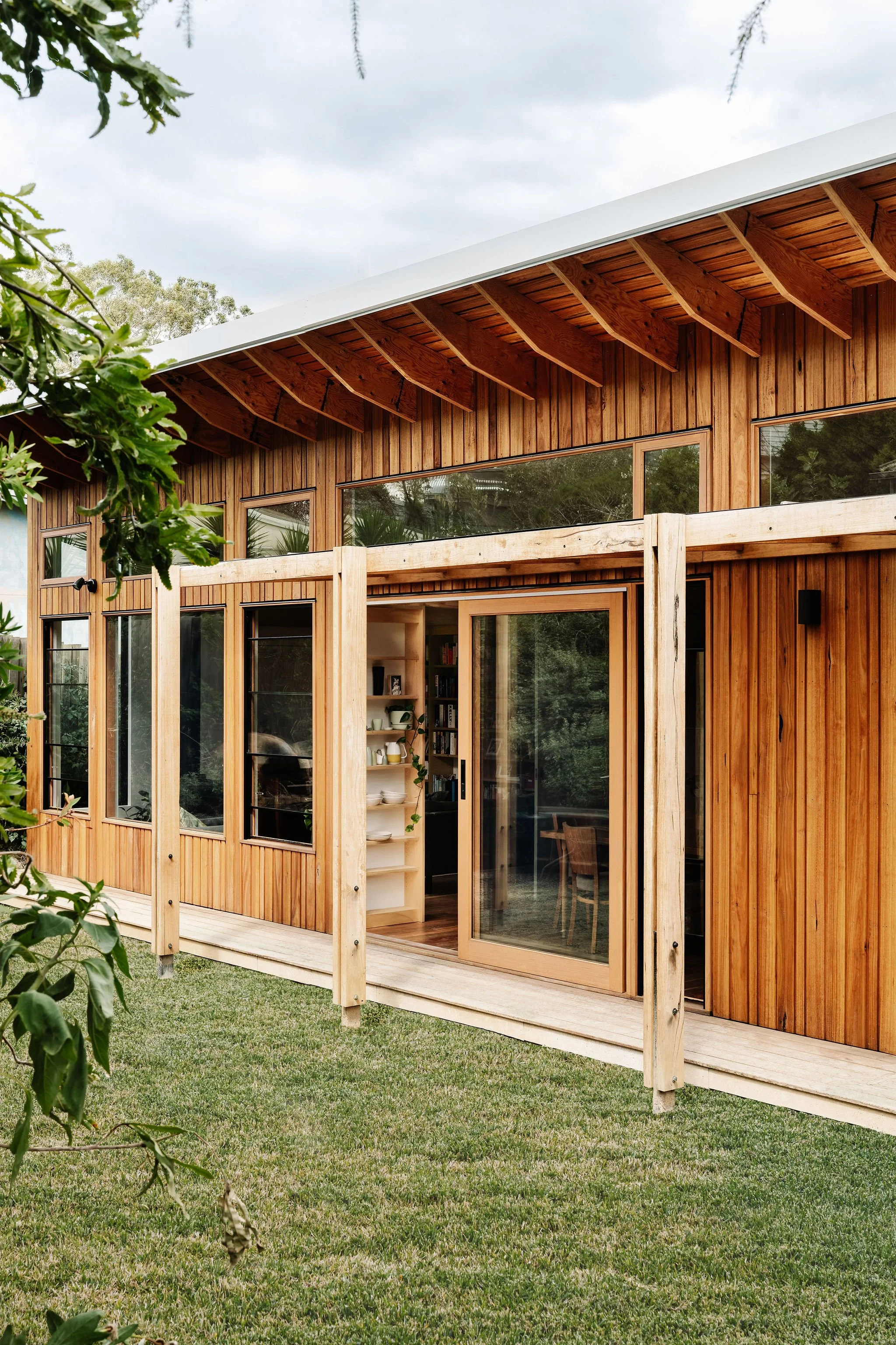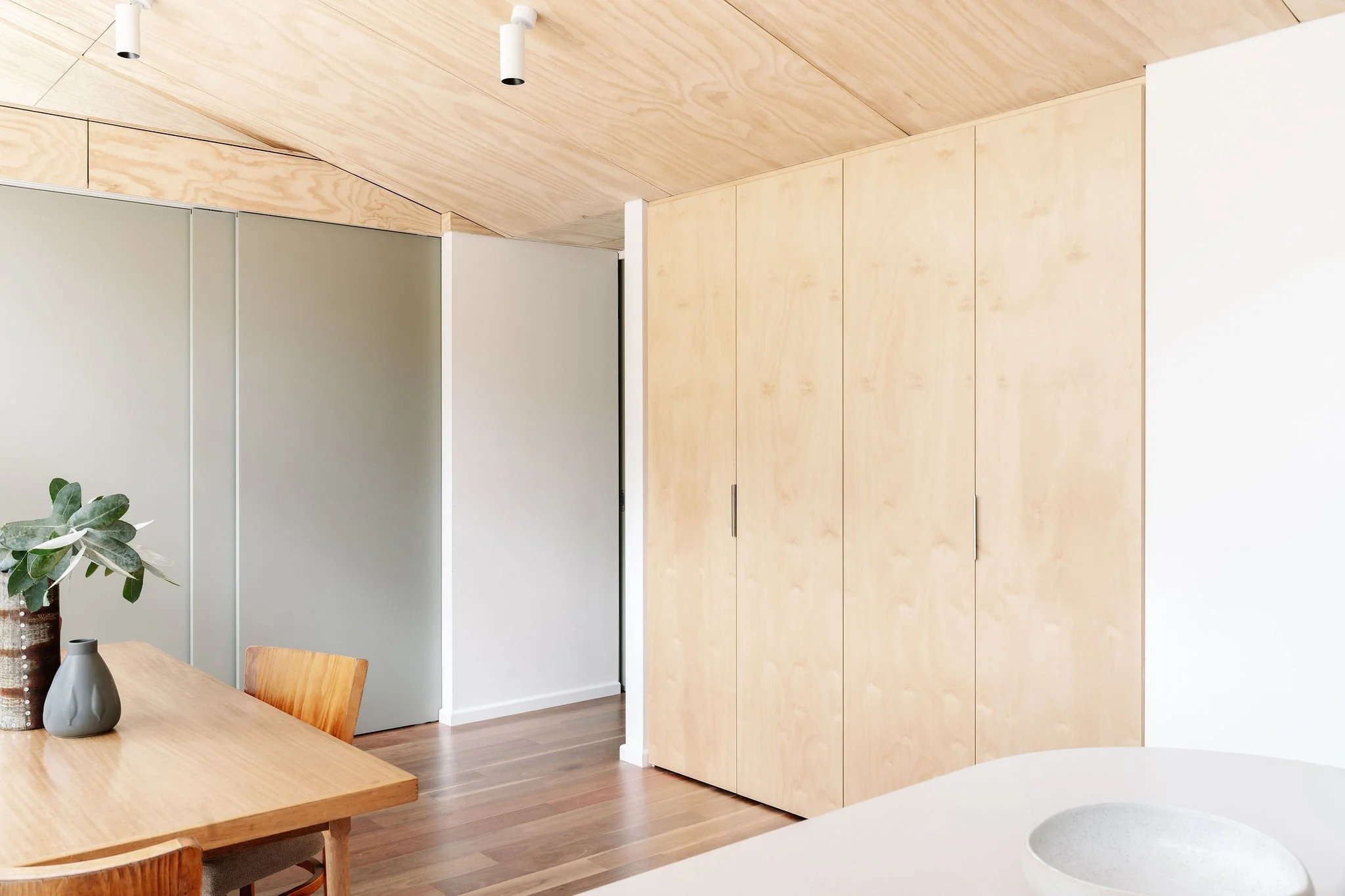 The interior spaces are warm and inviting, internal ply lining was used for the walls, ceiling and joinery to give the interior a coherent and soft backdrop – the spaces can also be shut off for privacy or to conceal mess – the addition of plywood bi-fold doors for the WFH nook allows it to be completely hidden when the doors are closed.