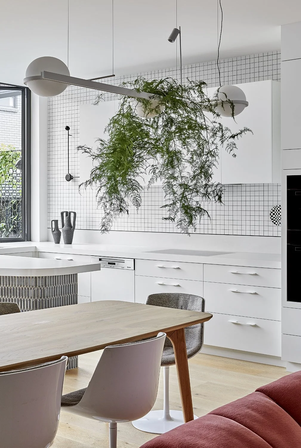 ‘A feature of the project is the curved, organic kitchen island bench, which carved out an intimate pocket within an open planned space. The diamond-shaped handmade finger tiles add texture and character to the space,’ says Anthony Chan. Styling: Bea Lambos. Photo: Dave Kulesza