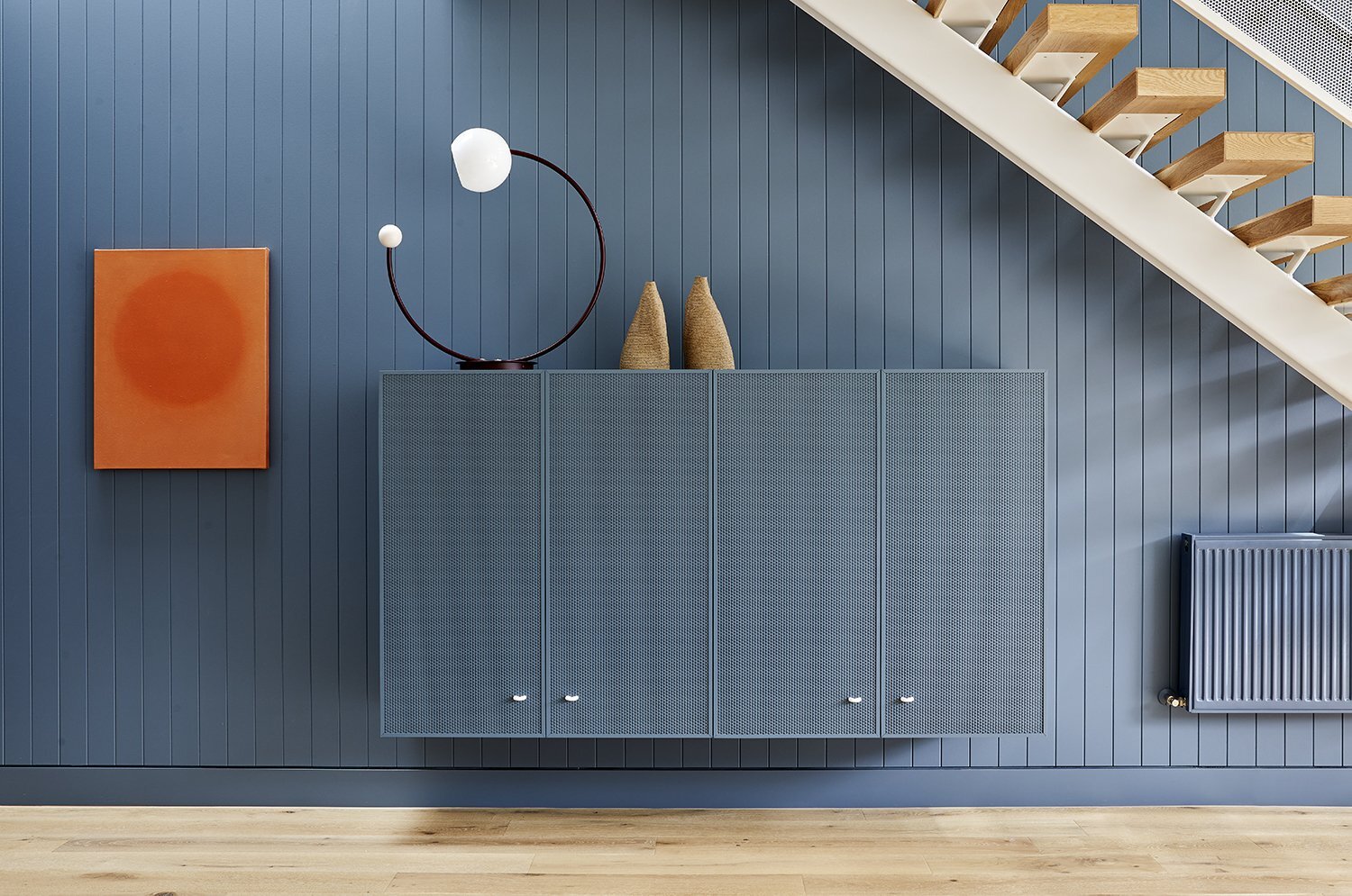 The space beneath the stairs houses a custom wall-mounted unit with perforated metal doors. Photo: Dave Kulesza