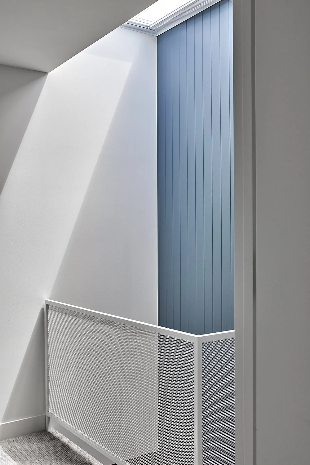 ‘A palette of durable and tactile materials runs consistently throughout the home, with pops of steely blues in the kitchen and living areas and soft greens in the bathrooms – the wall behind the staircase had a blue painted V-groove wall panelling that would encourage people to look up, thus punctuating the connection between the ground and first floors,’ says Anthony.