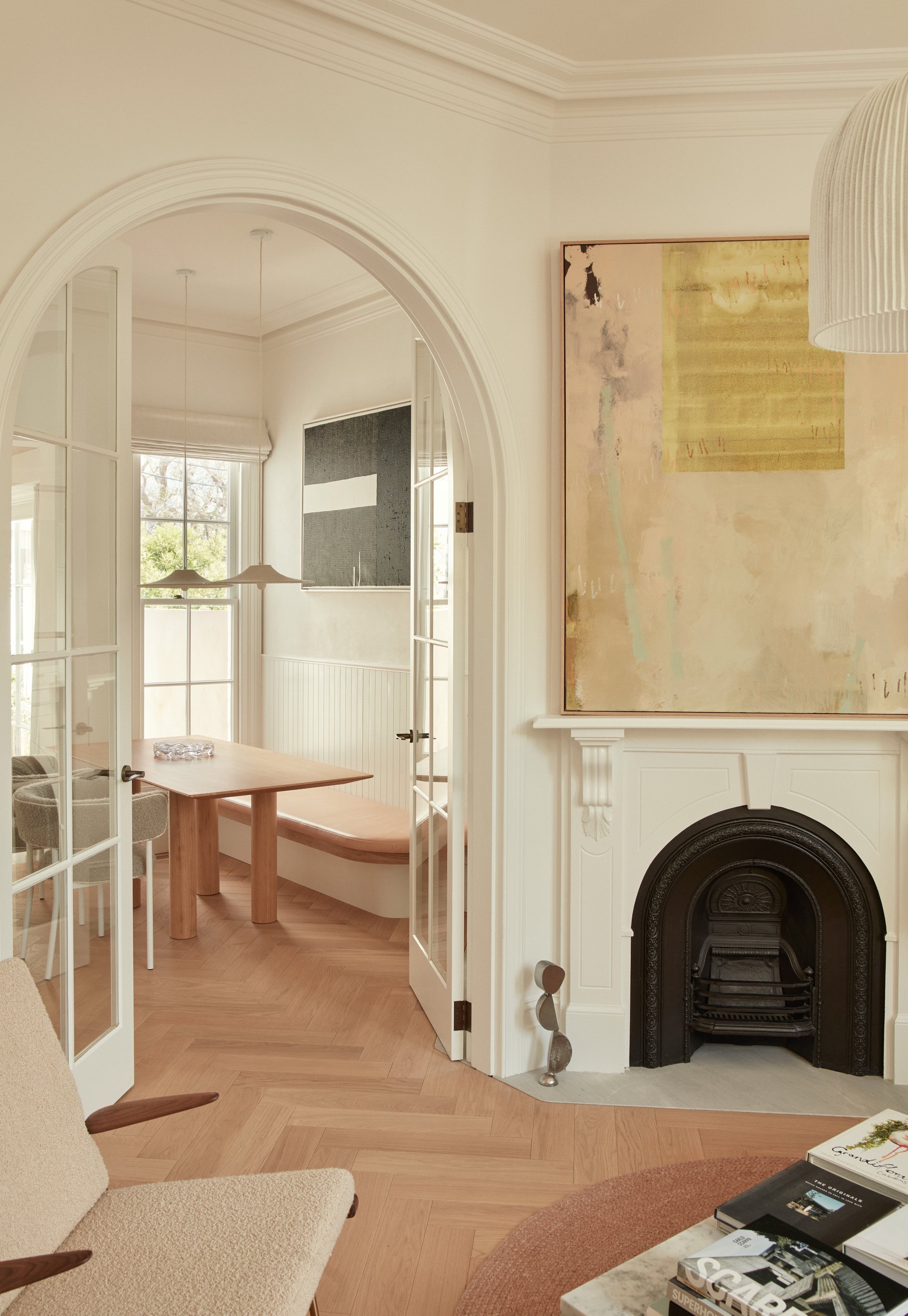 Herringbone timber flooring complements the original architecture. Photo: Sean Fennessy. Art direction: Marsha Golemac. Styling: Rikke Harker