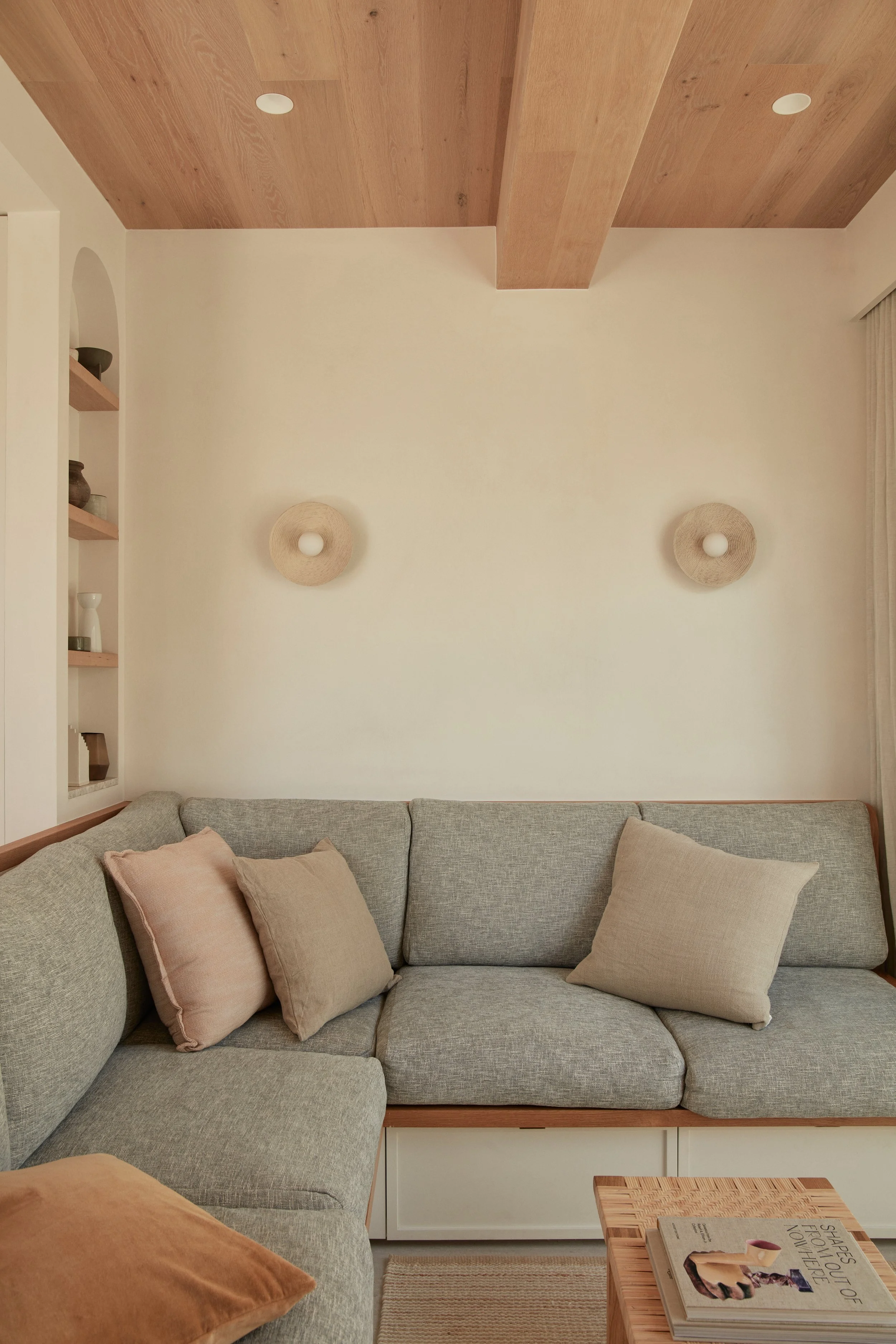 The material palette leans heavily into soft tones with hints of blush in the spaces. Although the home embodies feminine tones, there’s a complementary balance of strong feature materials such as nude coloured terrazzo and a timber panelled ceiling in the kitchen. There’s also a blush leather dining banquette upholstery, and creamy travertine in the bathroom – this gentle play of the feminine against the masculine, is balanced perfectly throughout the interior.