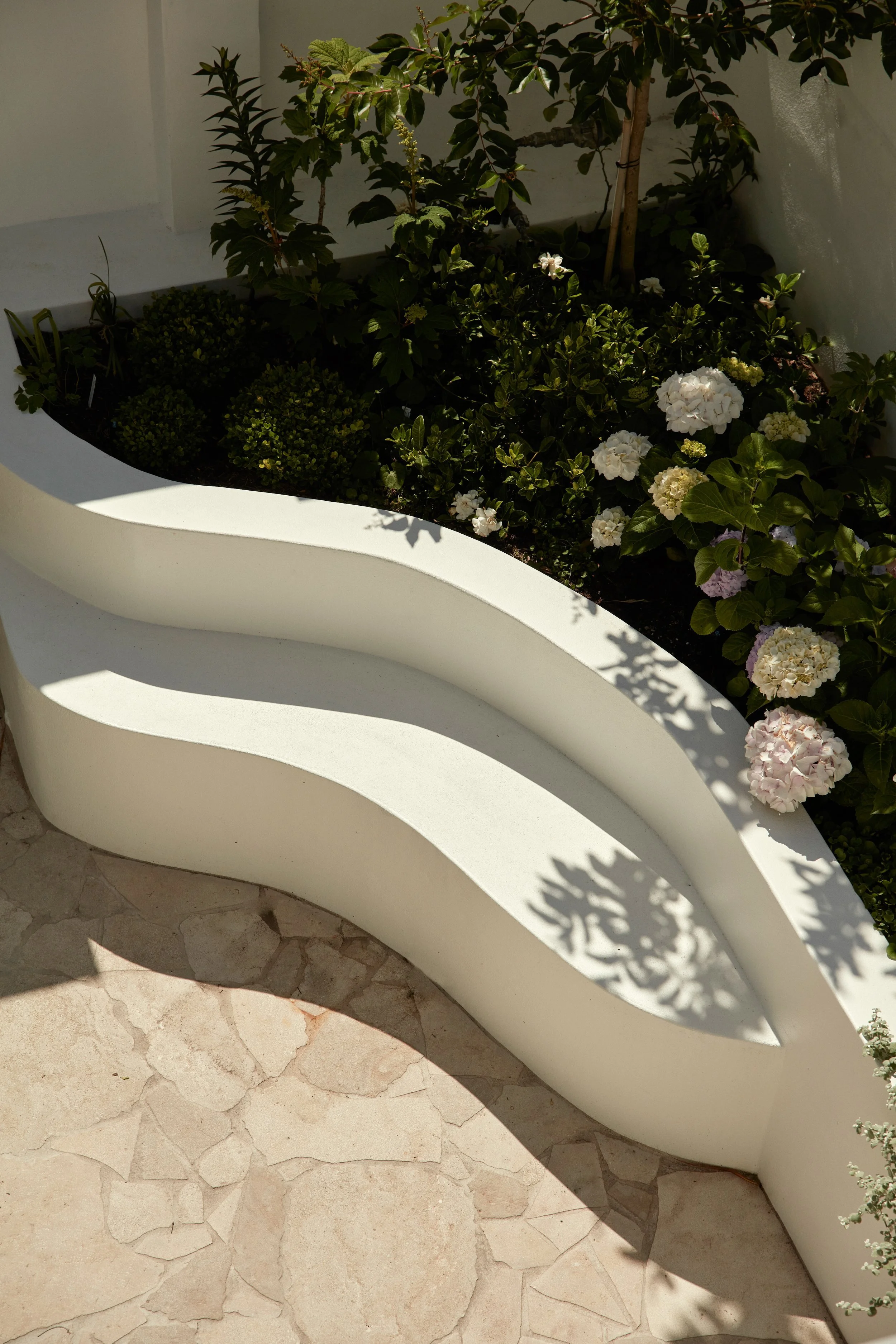 A curved built-in courtyard seat. Photo: Sean Fennessy. Art direction: Marsha Golemac. Styling: Rikke Harker