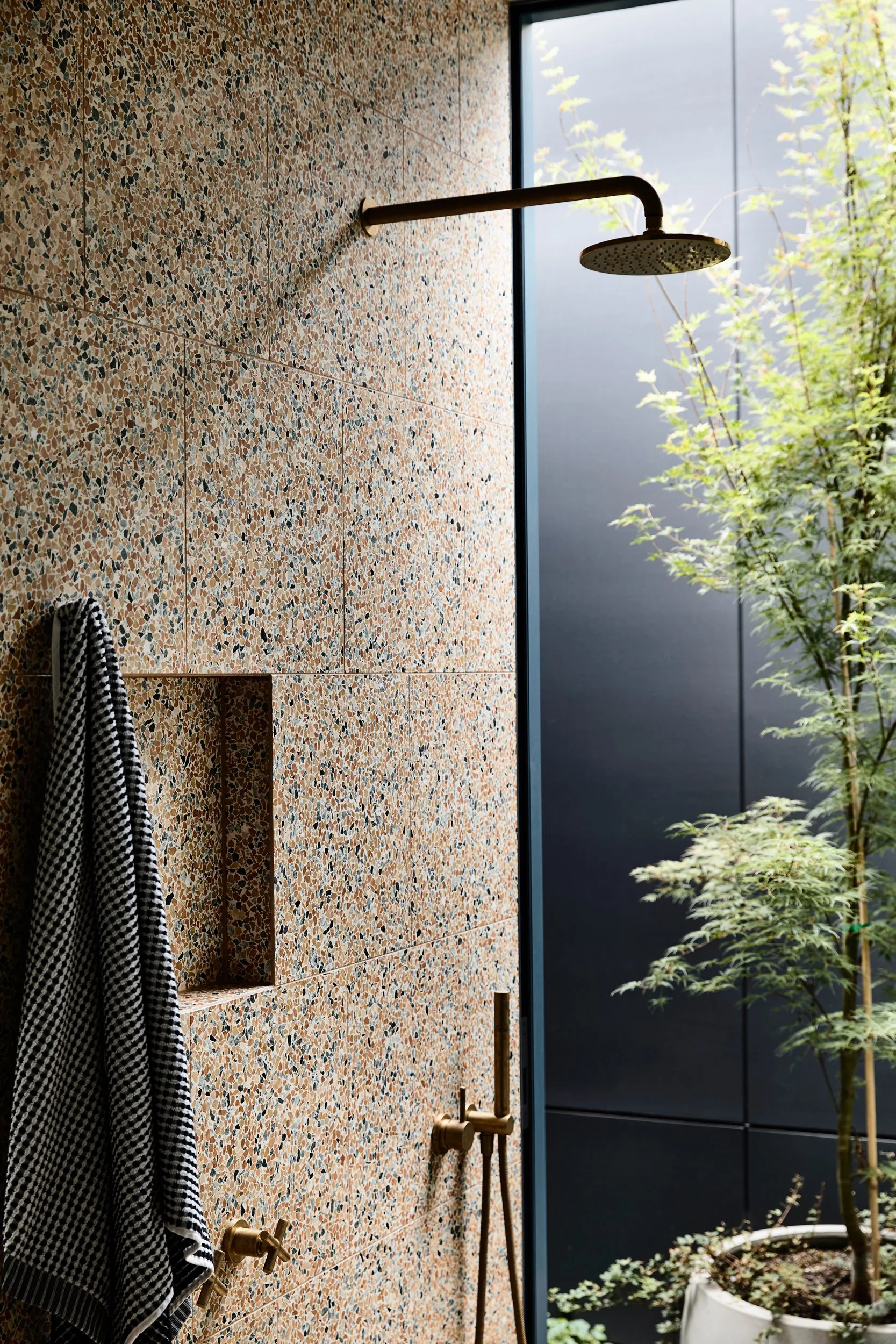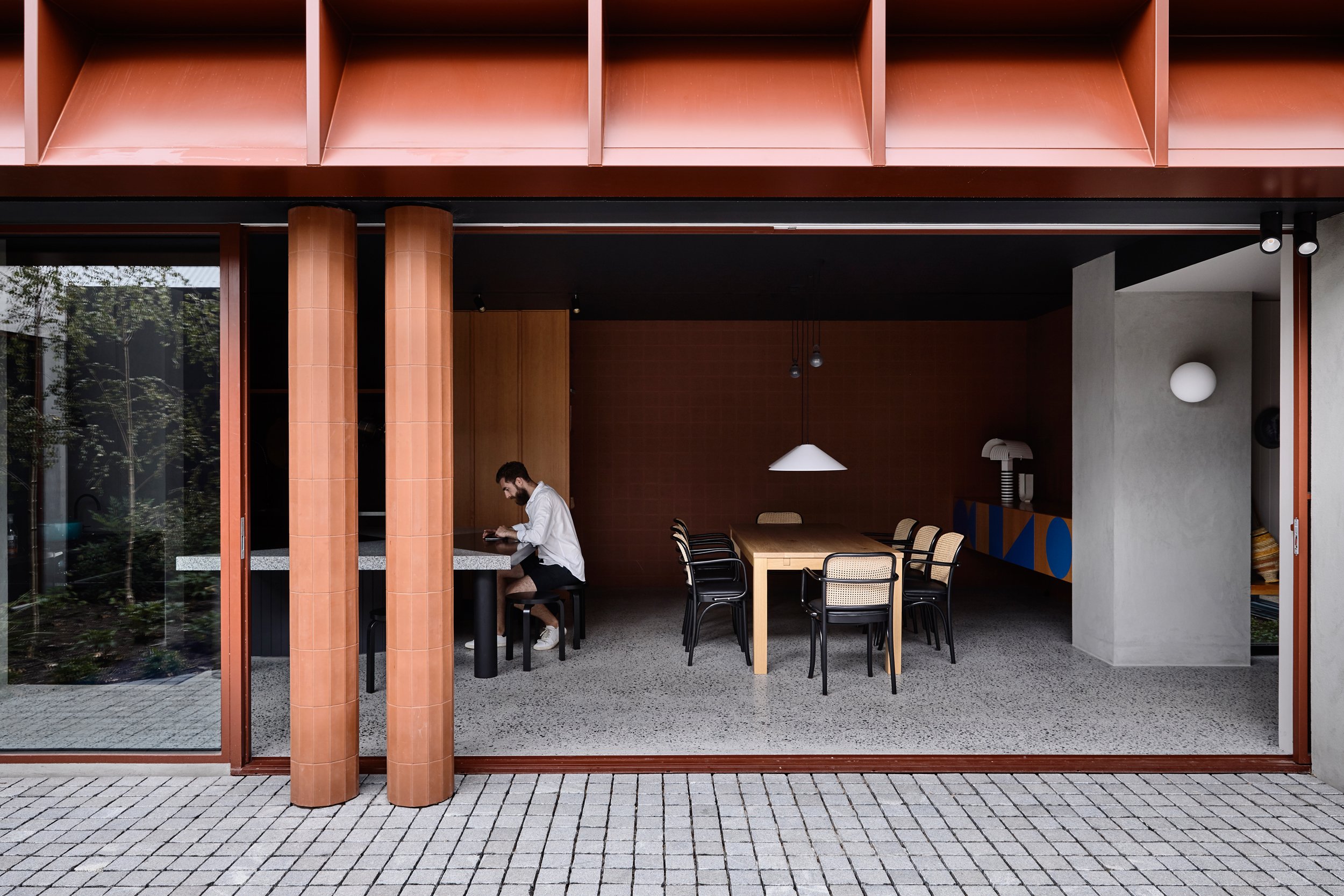 ‘We chose an oxidised red colour for the steel elements, including the large format sliding doors and fixed glazing, accompanying this are terracotta tiles and Douglas Fir, both of which complement the warm, earthy red of the steel,’ says Kennedy Nolan.