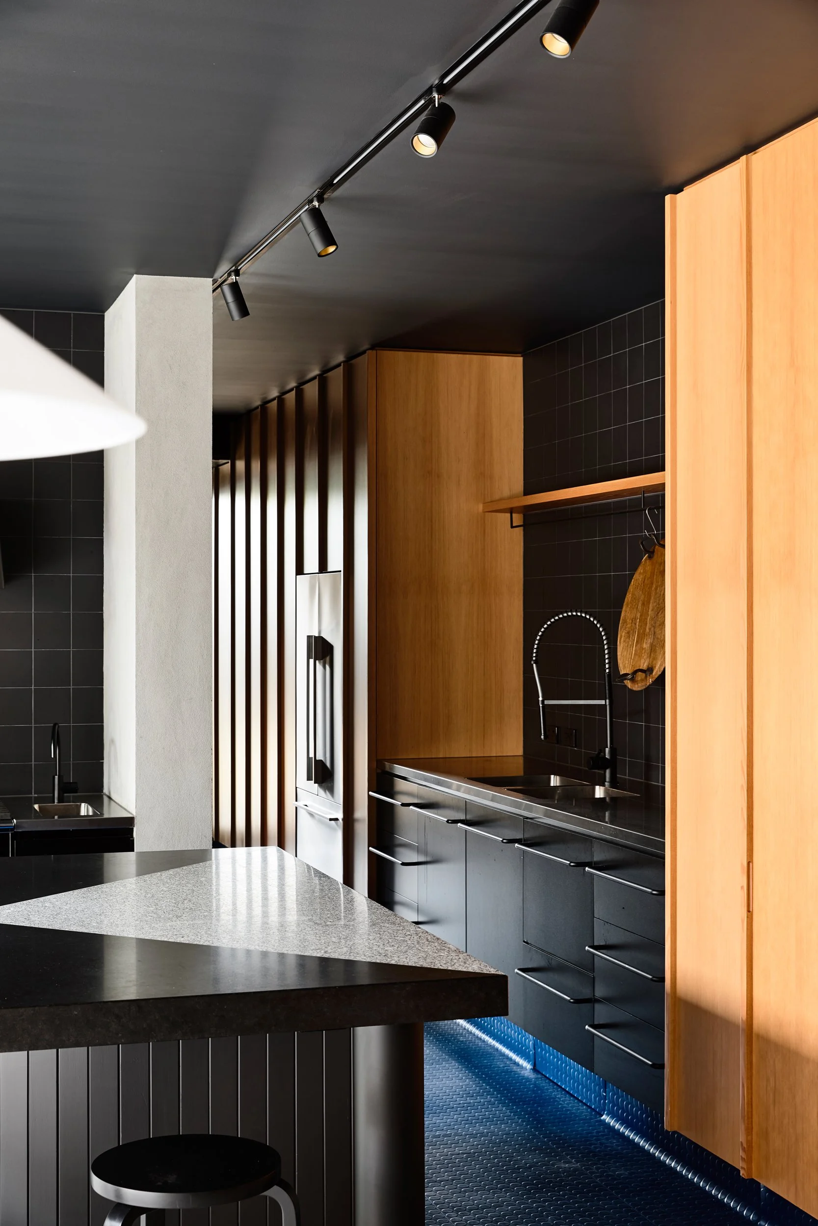 The dramatic kitchen features jet black joinery and benchtops. Photo: Derek Swalwell