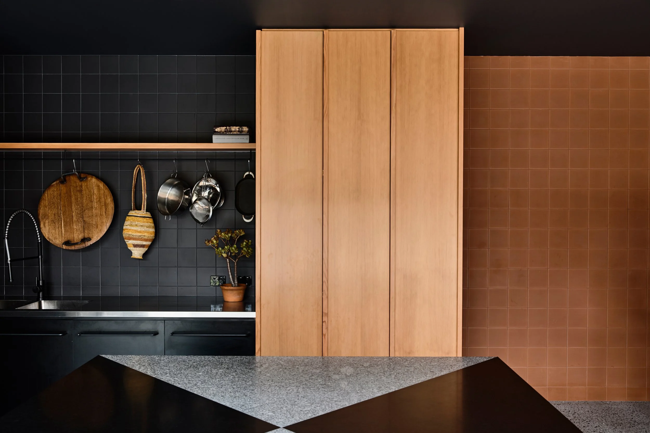 Jet black joinery and splashback tiles are a contrast against the oak cupboards and terracotta tiles. Photo: Derek Swalwell