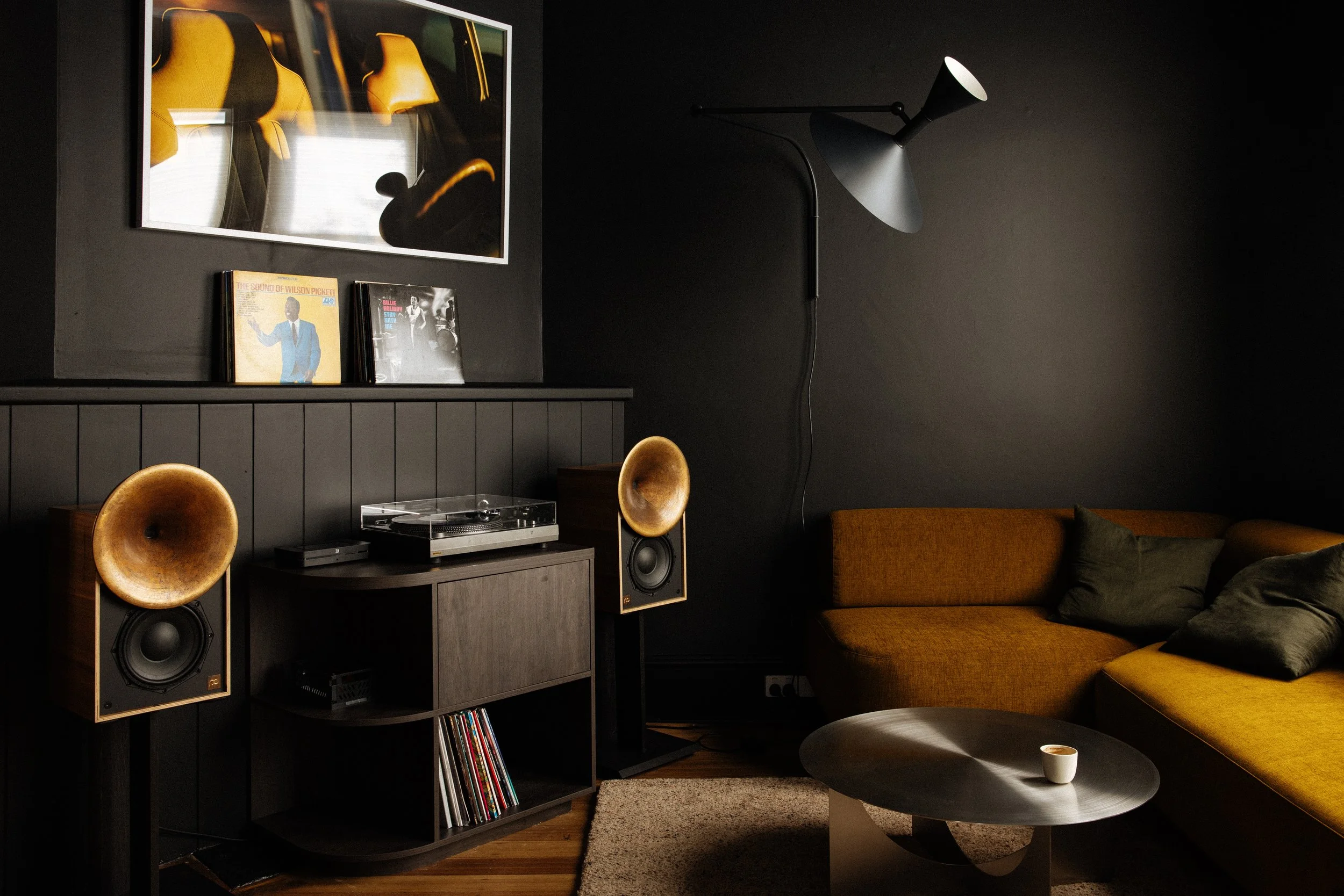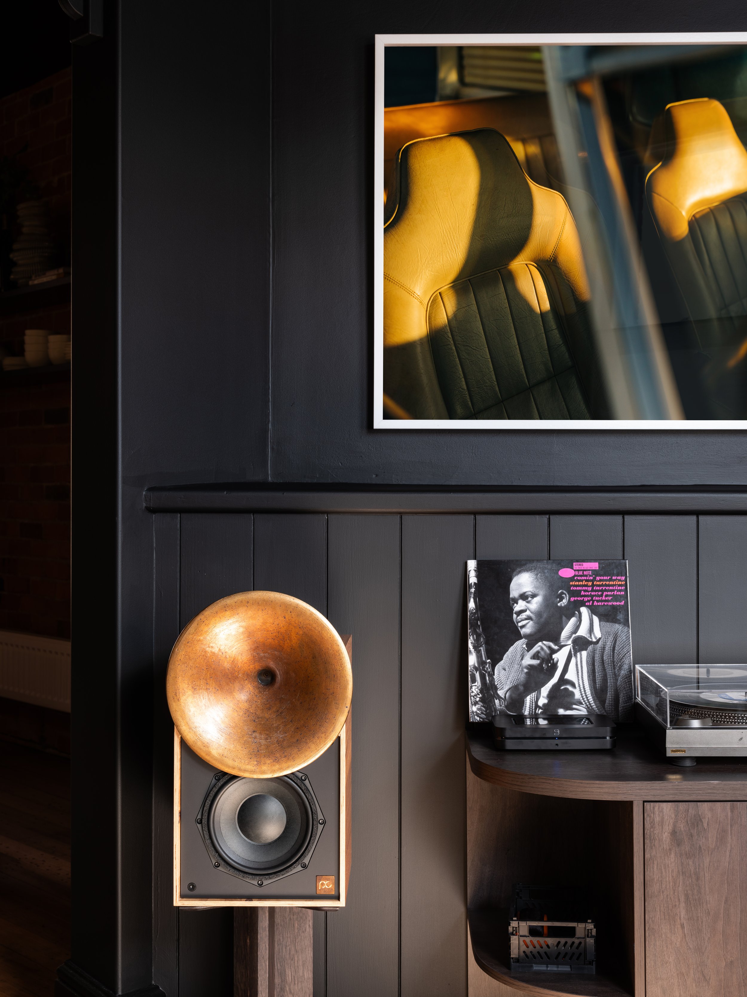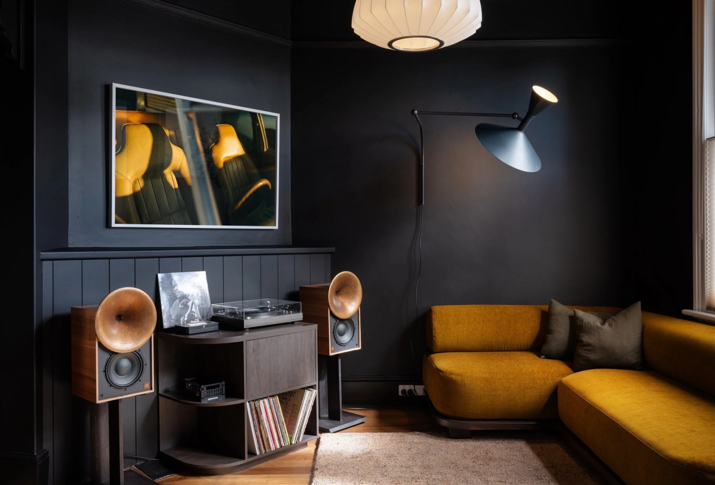 Warm timber, vintage vinyl and custom Pitt & Giblin speakers set the tone in the Guesthouse. Photo: Adam Gibson