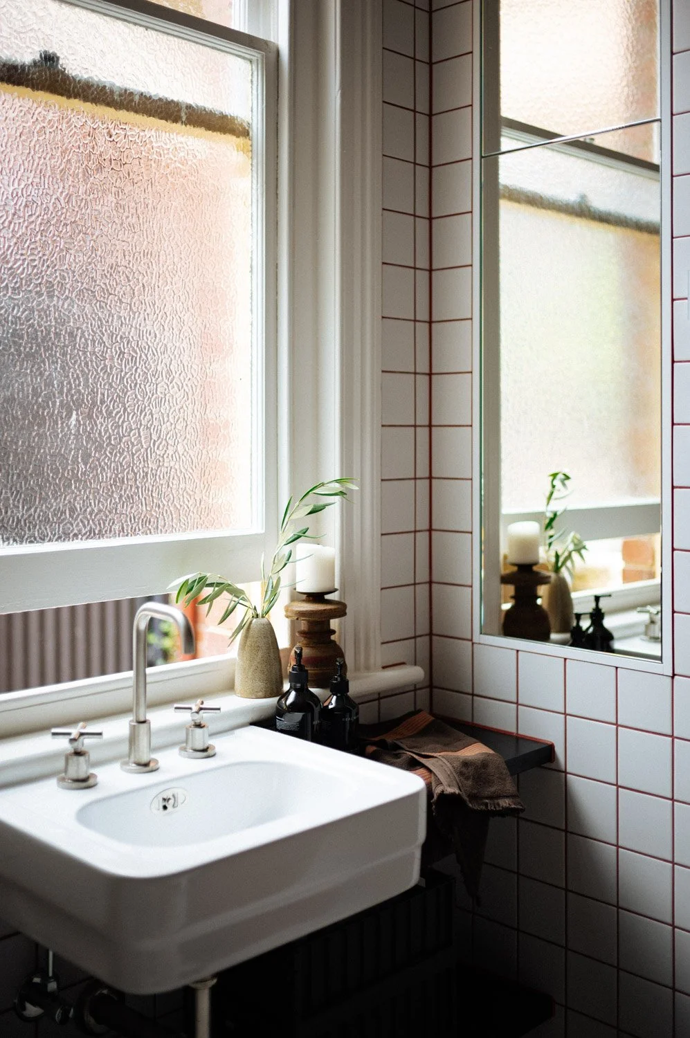 A softer take on utility, the bathroom pairs classic square tiling with a bold red grout. Photo: Lean Timms