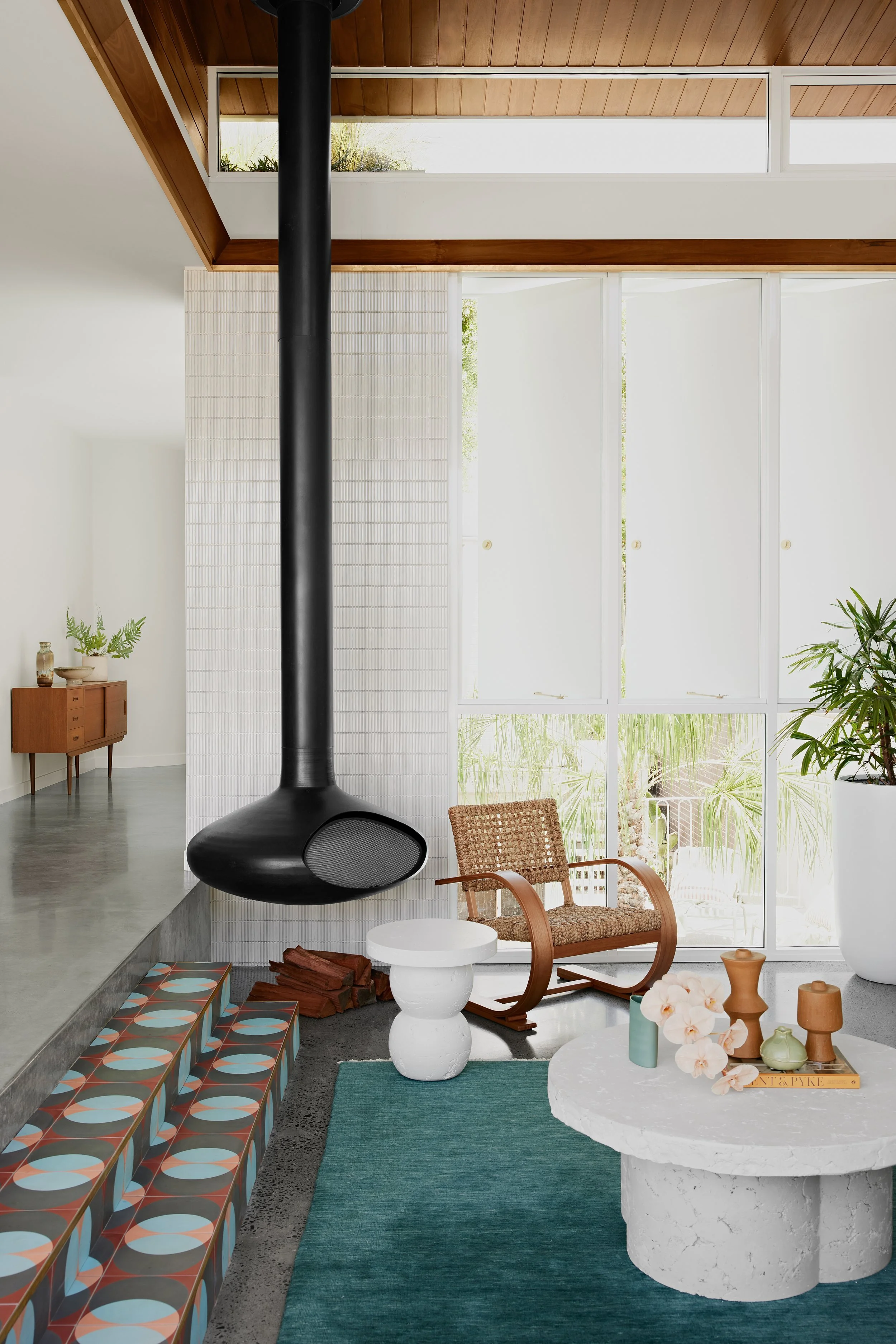 The communal areas of the house are adorned with vibrant, retro-style tiles that serve as the foundation of the colour scheme. The colours used in the tiles - blue, orange, and brown - are echoed in other areas of the house, such as the kitchen cabinets, rugs, and soft furnishings.