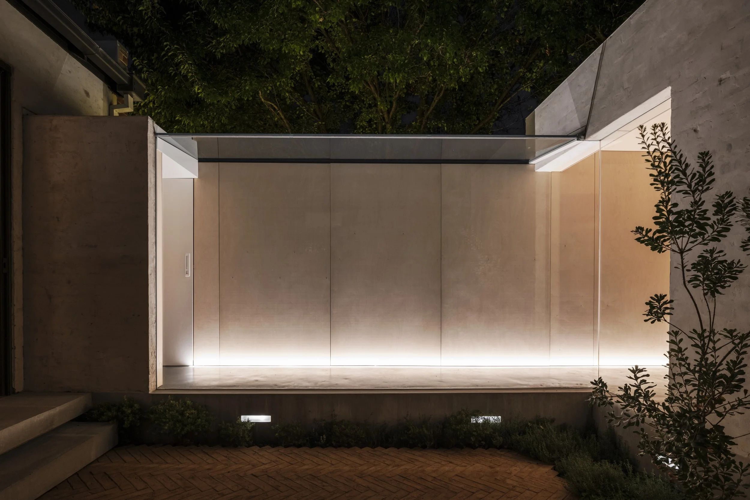 The design leans on materiality and craftsmanship, exposing the raw qualities of materials. This tactile approach starts in the interior detailing and extends to the exterior, with burnished concrete floors, plywood lined walls and a hand applied micro cement exterior wall finish and handmade terracotta pavers.