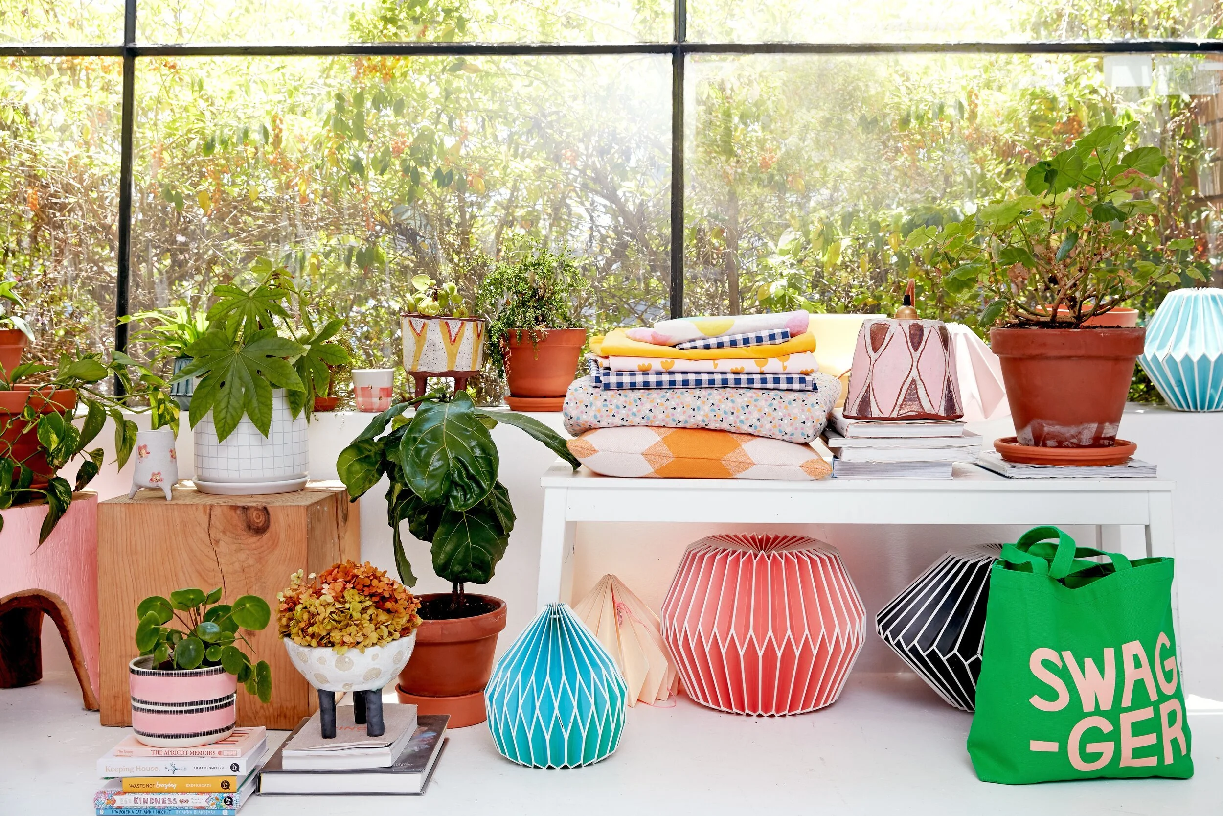CASTLE can be summed up in three easy words: colour, shape, and fun. However, Rachel Castle’s new studio reveals it’s not just the collections that is a horde of art, texture, and her distinctive geometric designs. After moving from a mini studio, finally, the CASTLE designs and Rachel’s art practice have room to breathe and grow in the expansive space. There is a spot for everything in the Aladdin's Cave of 1980's pop. Rainbows flow into flowers, with Rachel's distinct font type reminding you haven't slipped into a gumball machine.
