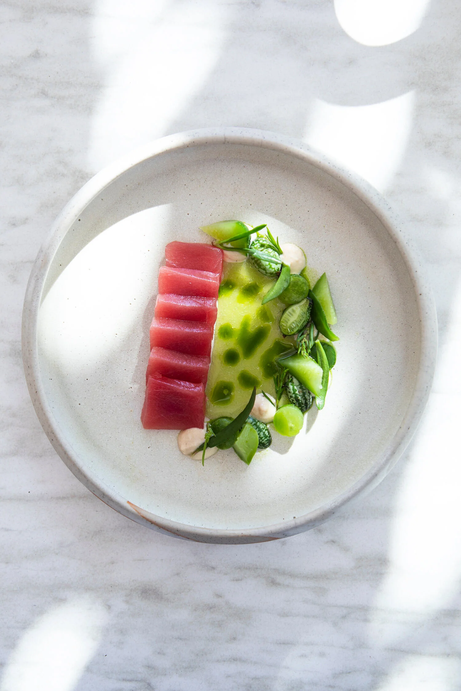 Local yellowfin tuna crudo, smoked mullet baccala, boon luck cucumbers, apple, lemon myrtle and verjus dressing, coastal greens. Photo - Madeline Johnson.