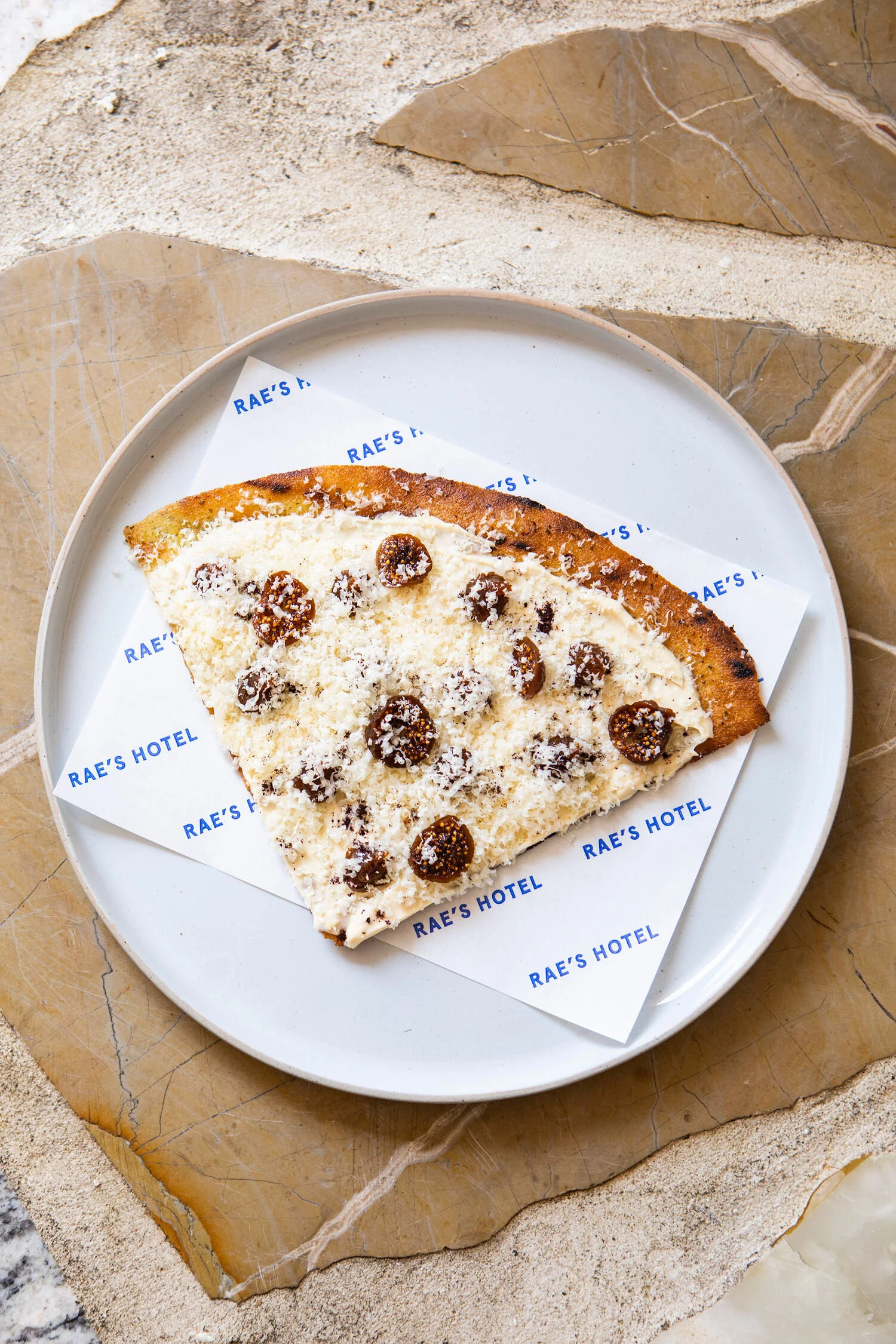 From the Dolci & Digestivi menu - Crostini inspired by pizza - a wedge of carasau bread cooked on the chargrill and topped with a cream made of pyengana cheddar, fig and native pepper jam, pickled baby figs and olive oil. Photo - Madeline Johnson.