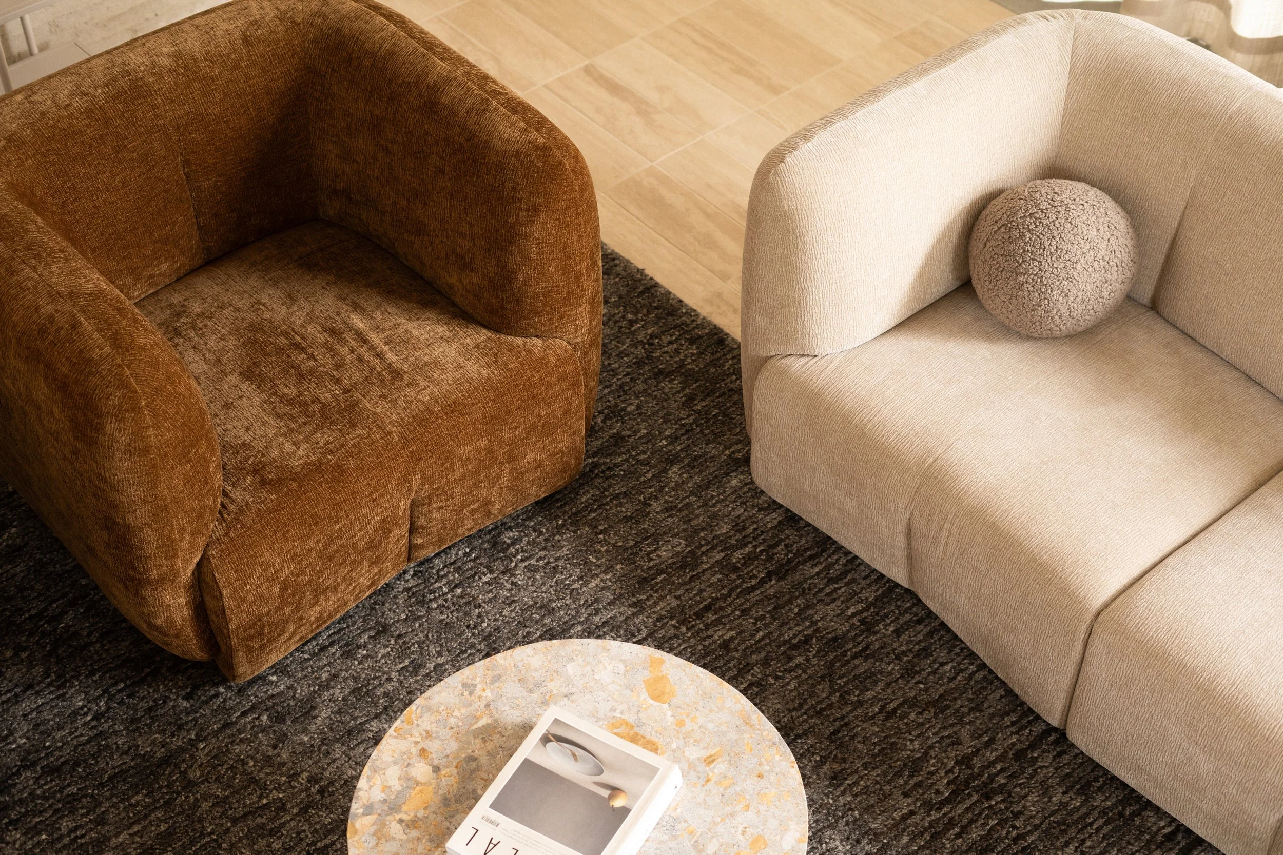 The design process for Adorned in Texture was created with a selection of new upholstery items, which were applied to pieces to showcase their unique characteristics. Head stylist at RJ Living, Jess Galtry, worked with a palette of earthy natural colours to awaken a sense of grounding within an interior. ‘The choice of an earthy and neutral palette reflects our desire to evoke a sense of harmony and natural beauty,’ shares Marcel.