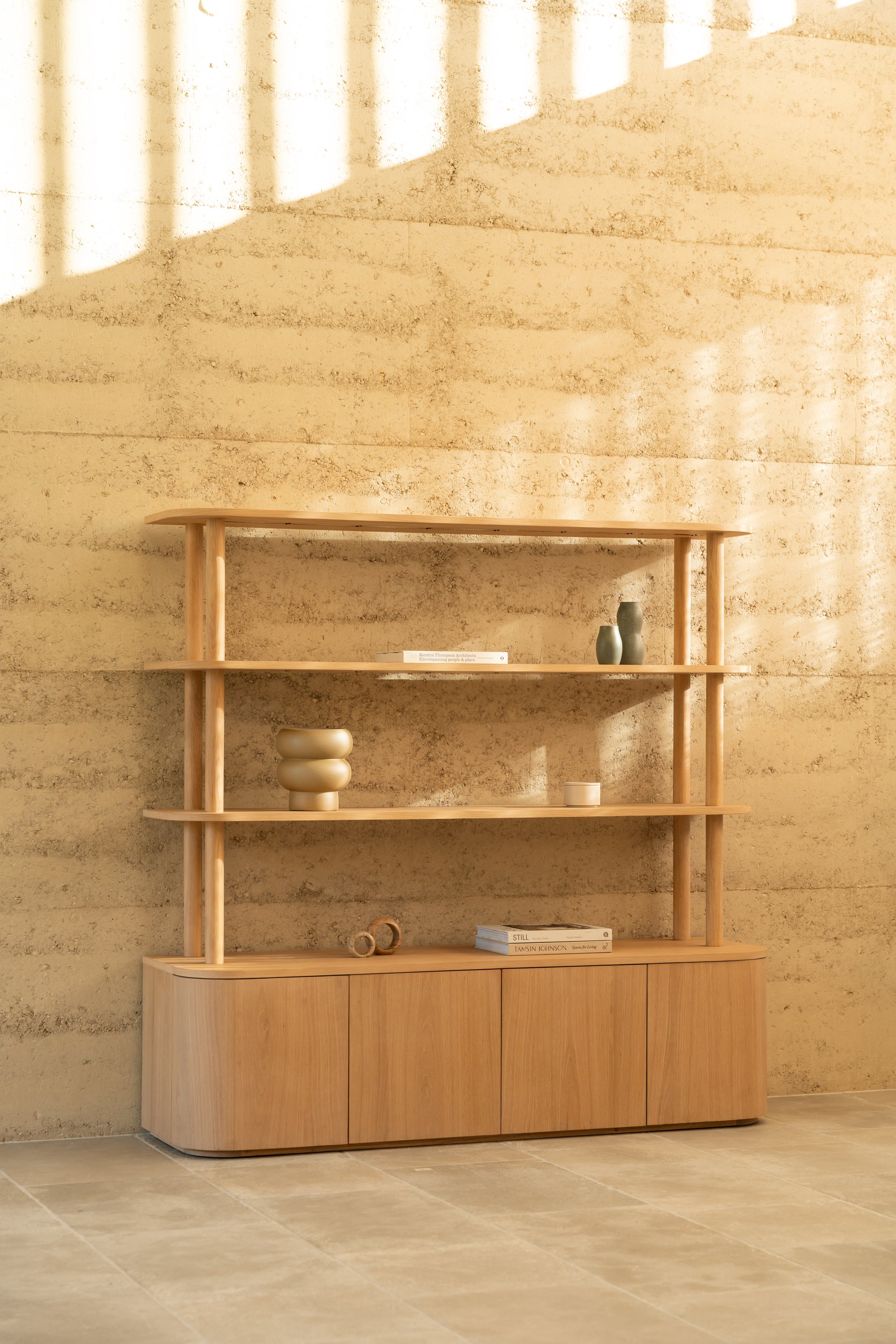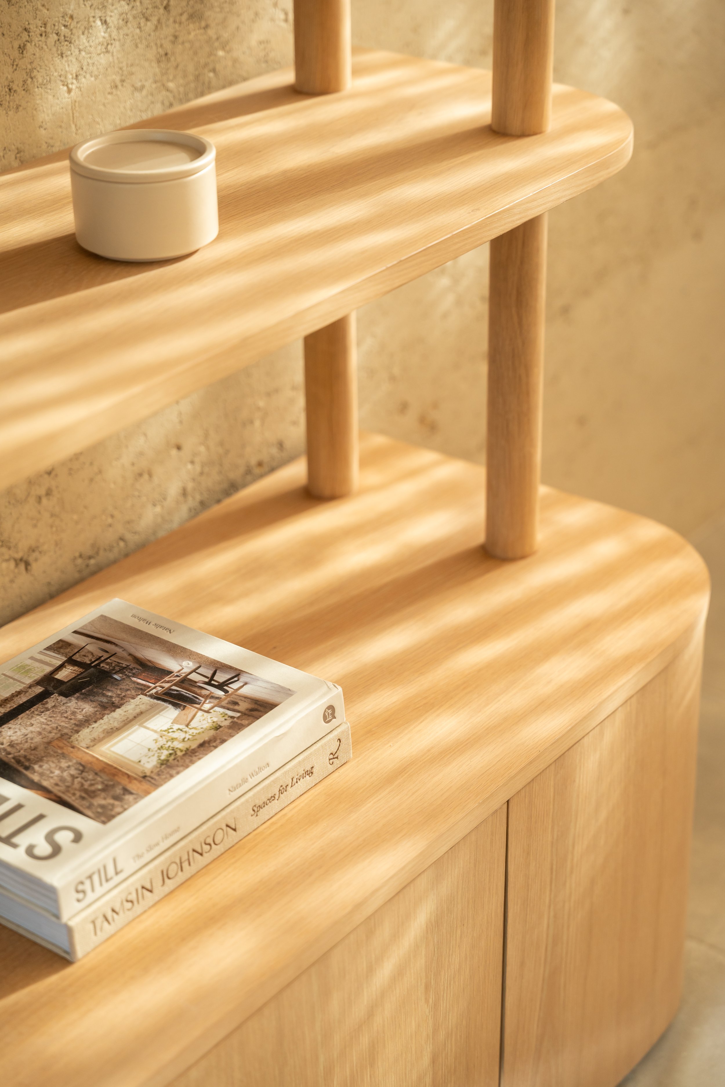 Storage follows the same language of softness and curve. Tide, named for the sinuous sweep of its doors, sets its rounded profiles against a boxier carcass, with a subtle gloss ‘Porcelain’ finish that reveals timber grain beneath: an 80s note, modernised with care.