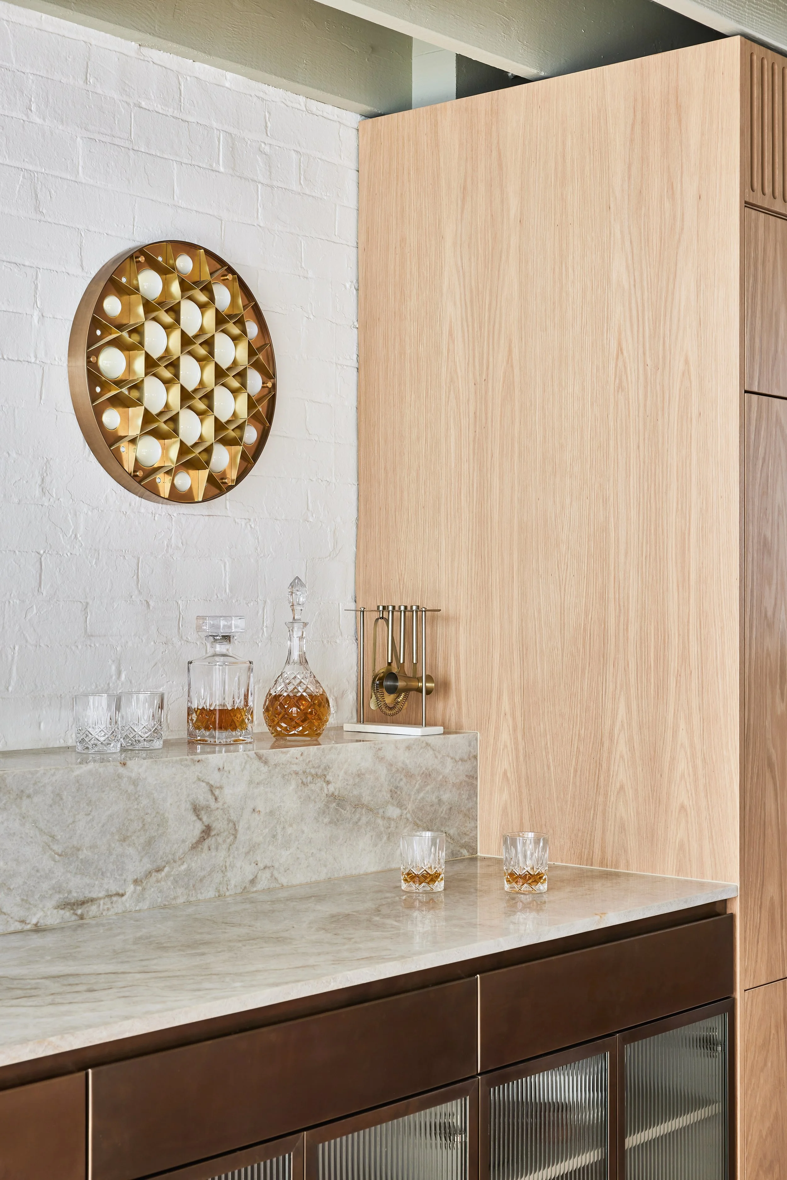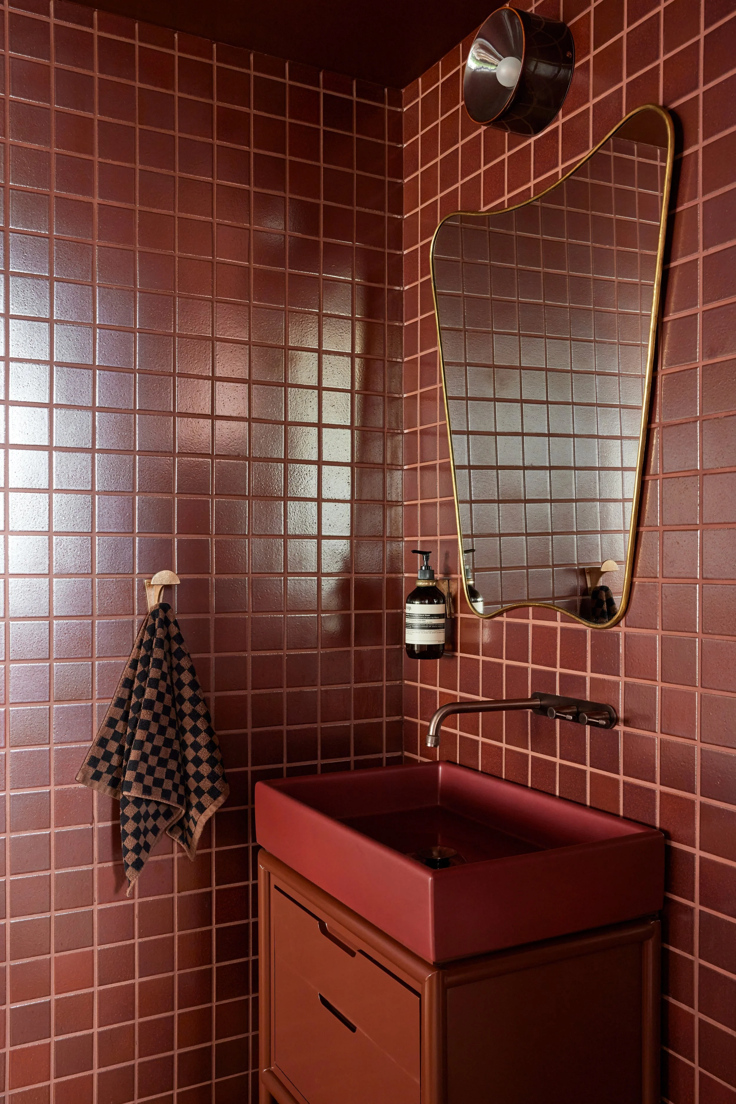 In the kitchen, burgundy and dusty pink Breccia Rosso marble makes a bold statement – the arched counter in perpendicular conversation with the void. The rich, earthy tones pair delicately with brass- hued curtains and the thriving greenery that provides the courtyard with its own sub-tropical canopy.