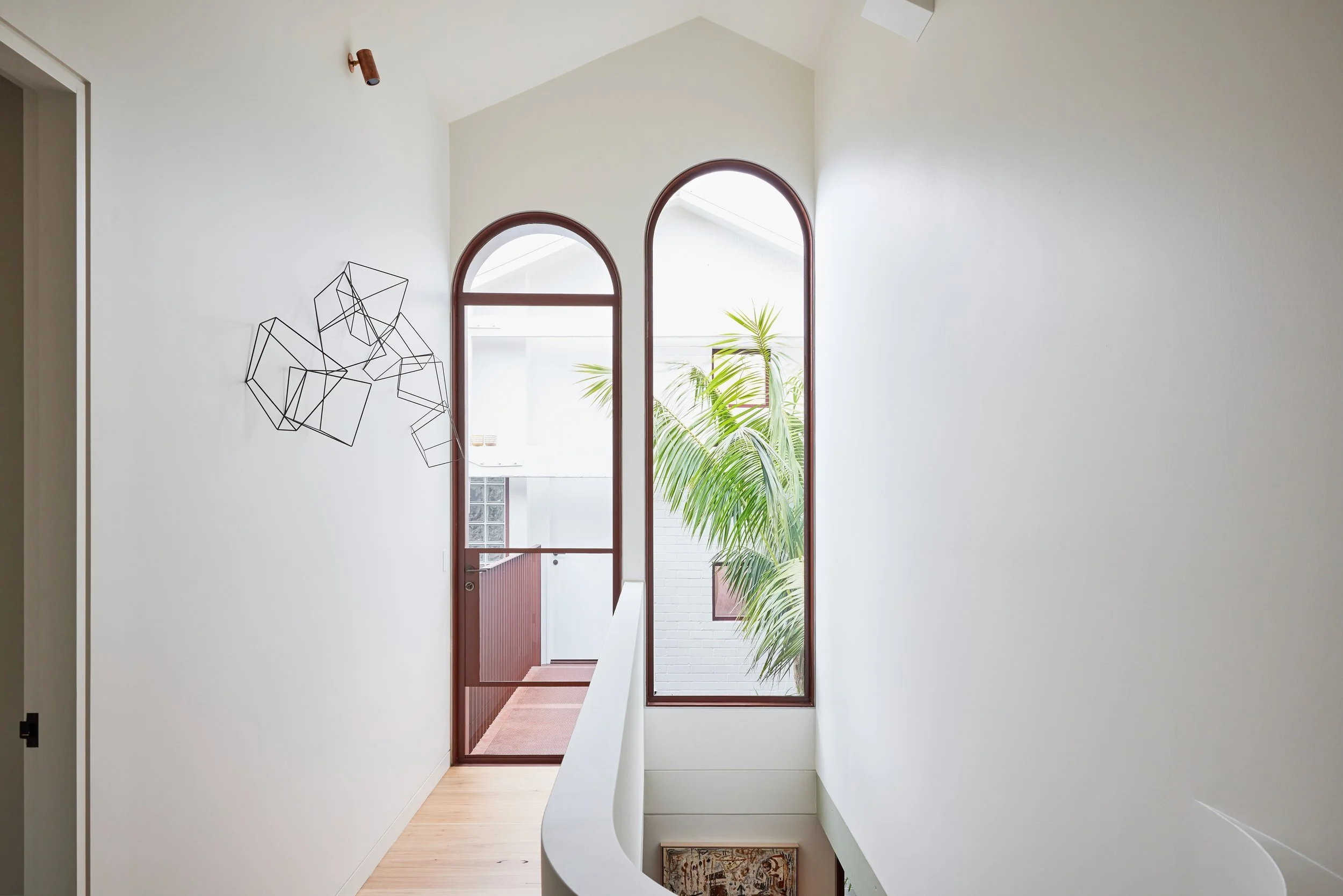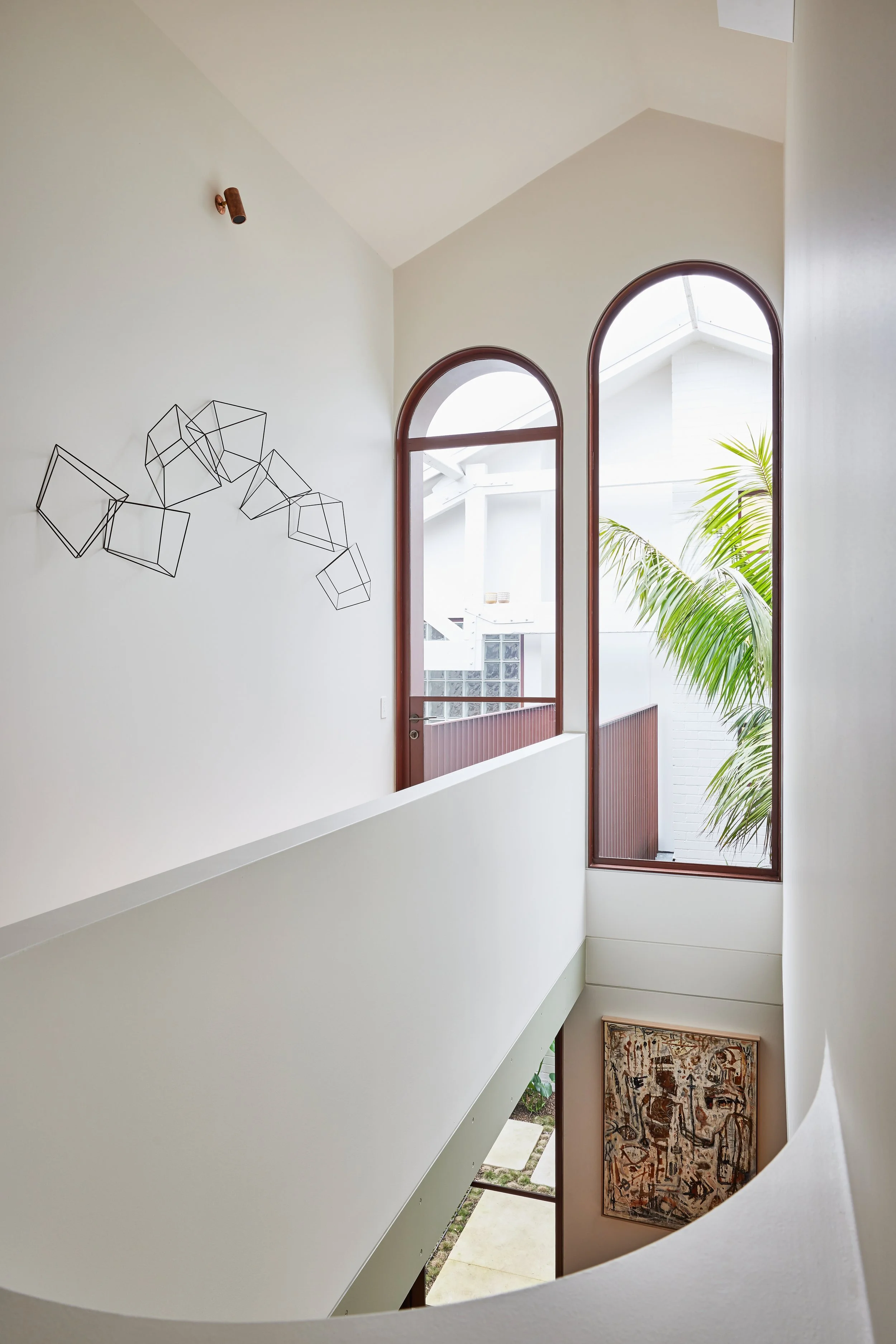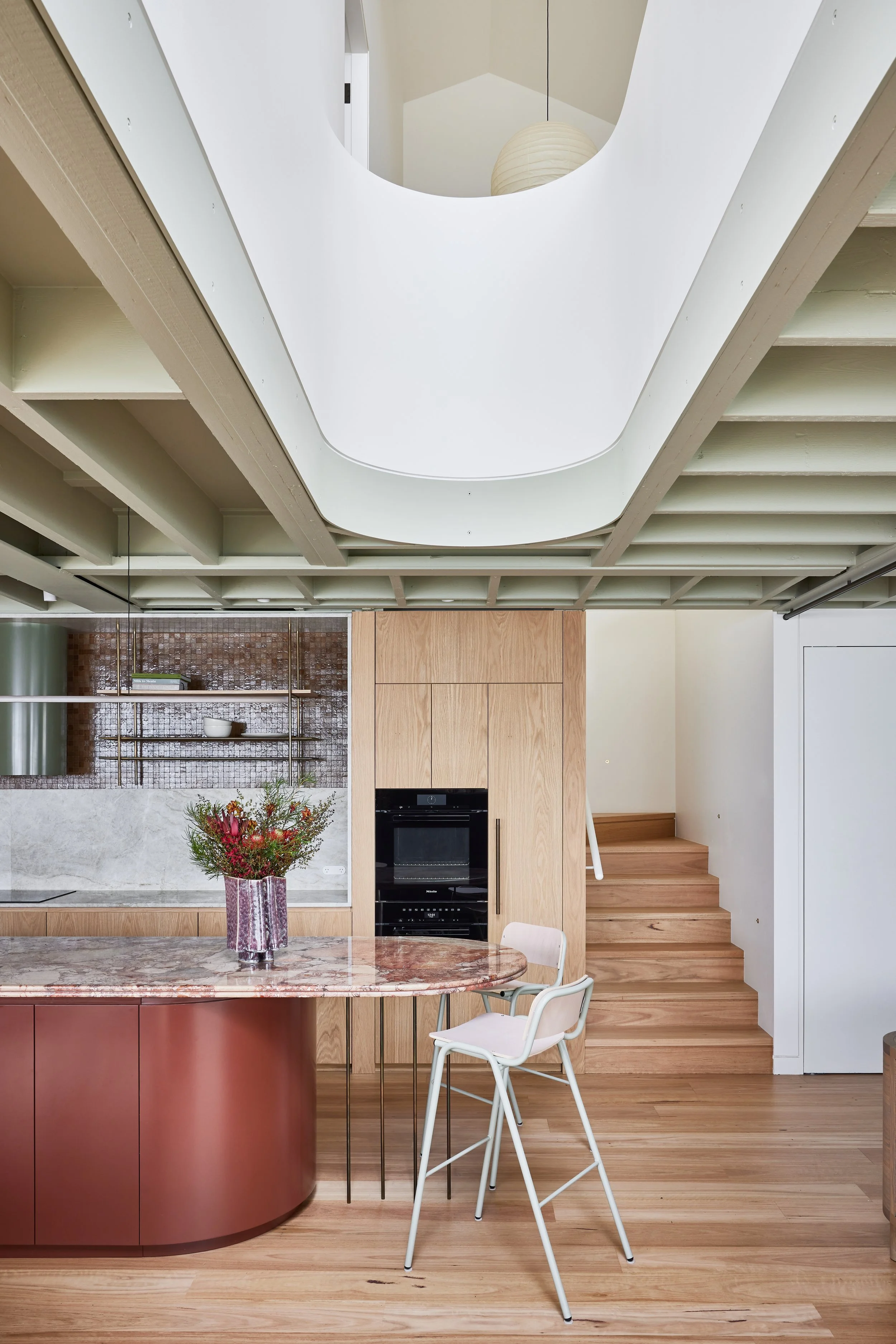 On the courtyard façade, expansive windows reach upwards, whilst the double-lipped marble benchtop running perpendicular to the void creates a playful conversation between two intersecting forms.