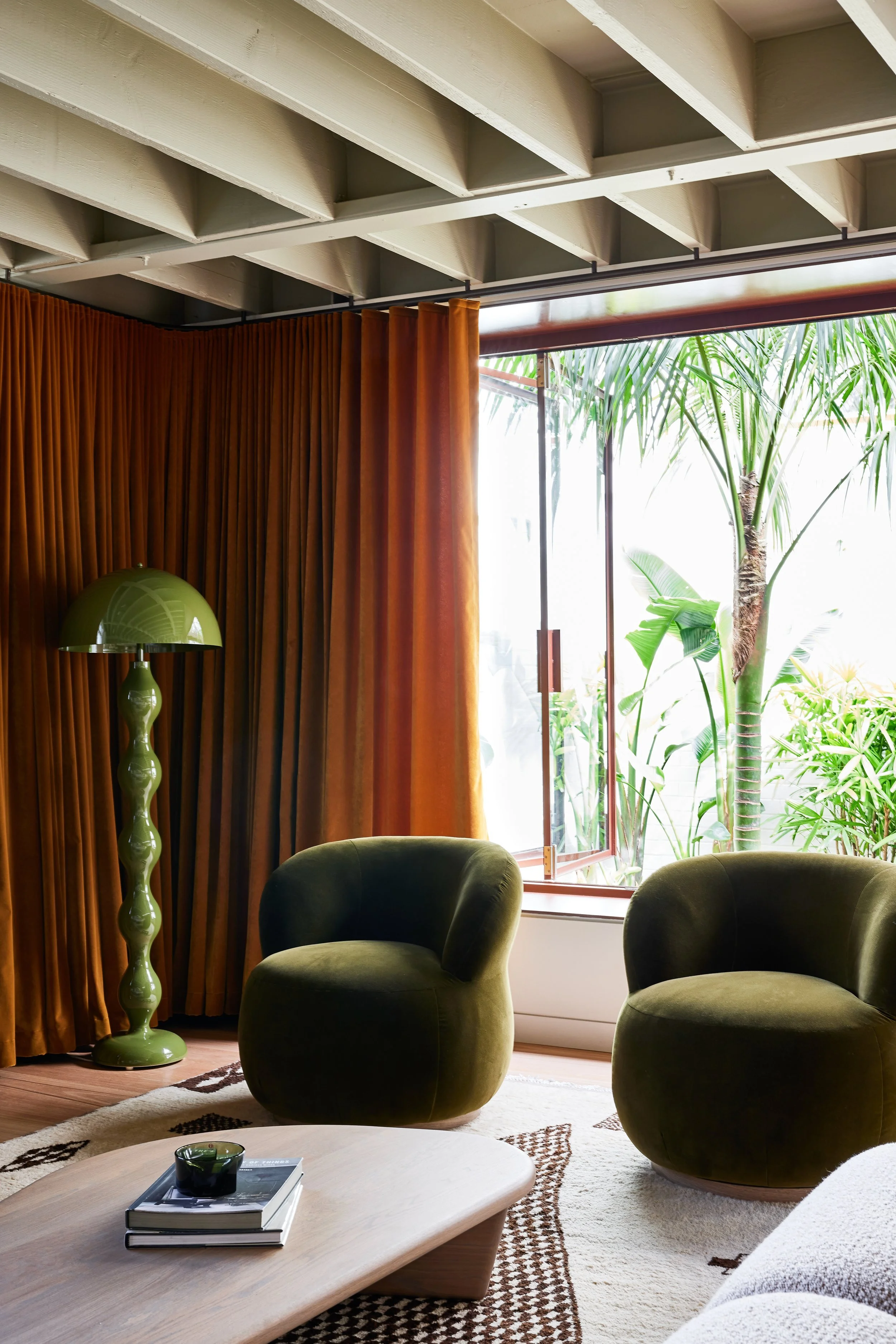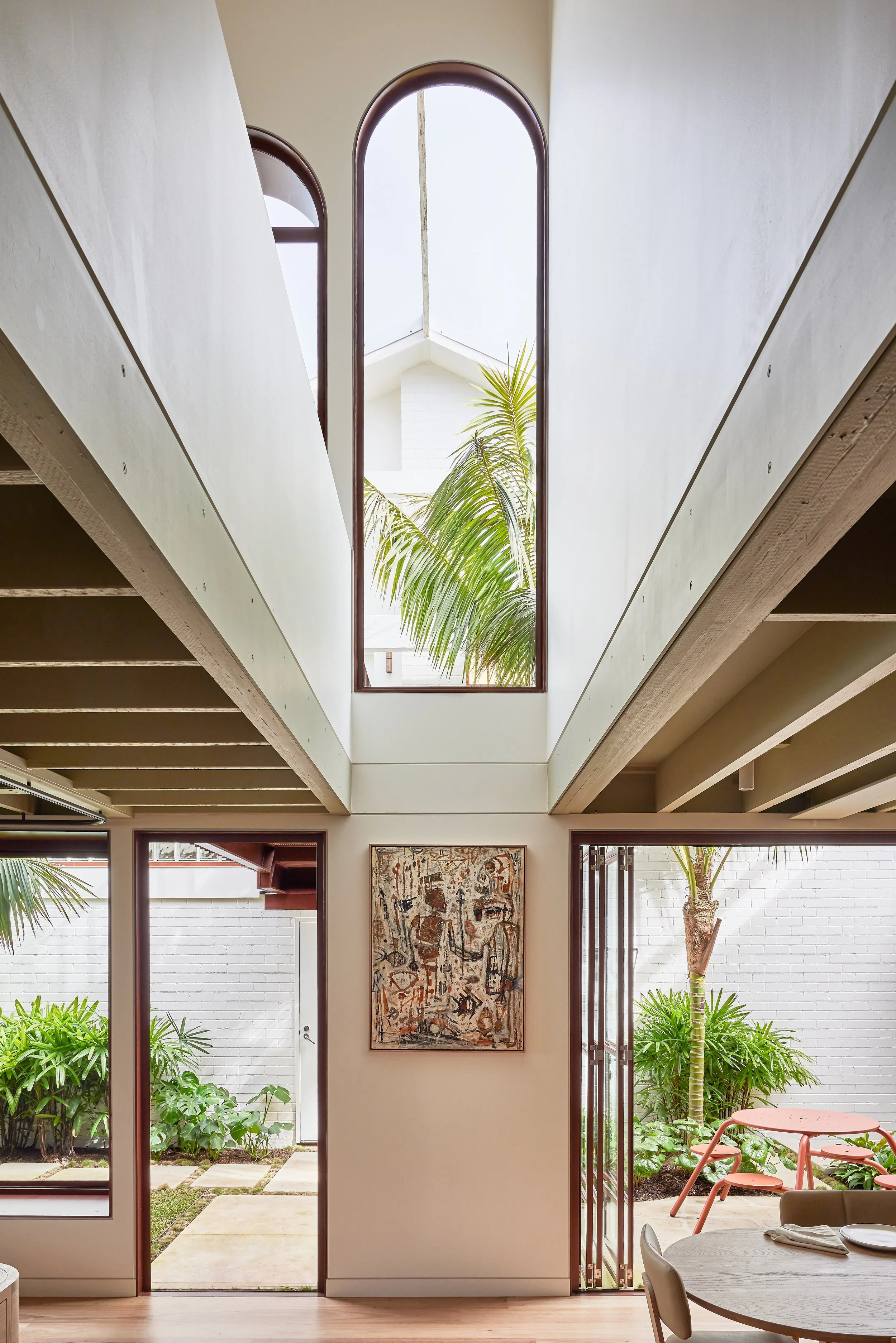 Once you step inside Rosso Verde, you’re immediately struck by a large curved opening in the ceiling. It spans a significant portion of the depth of the home – one of the four subdivided within a historic industrial factory, each of which adjoin a central communal pool.