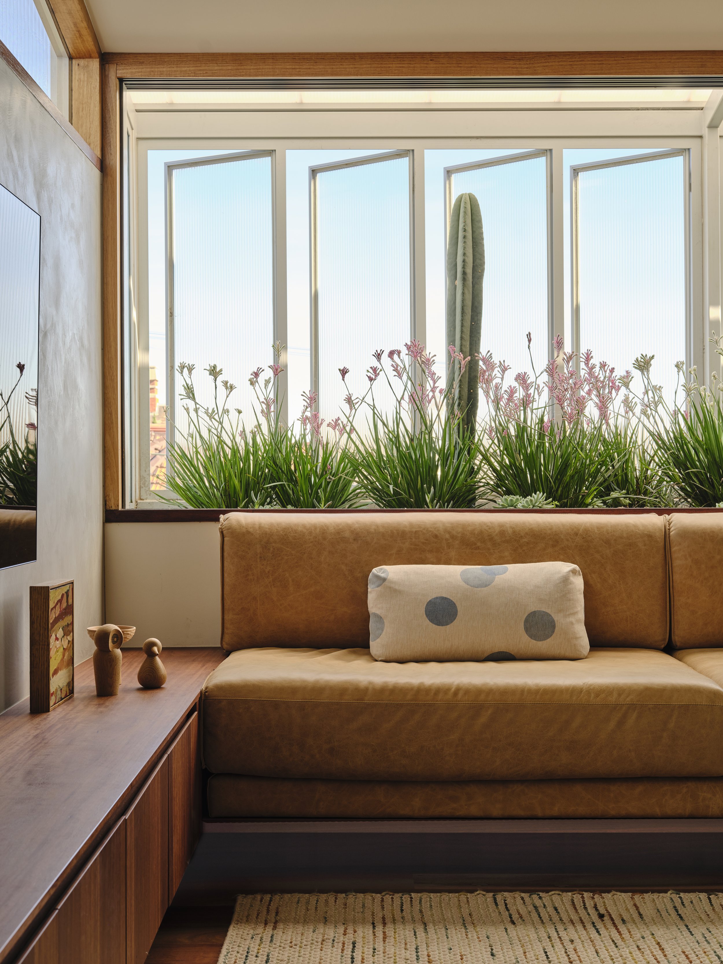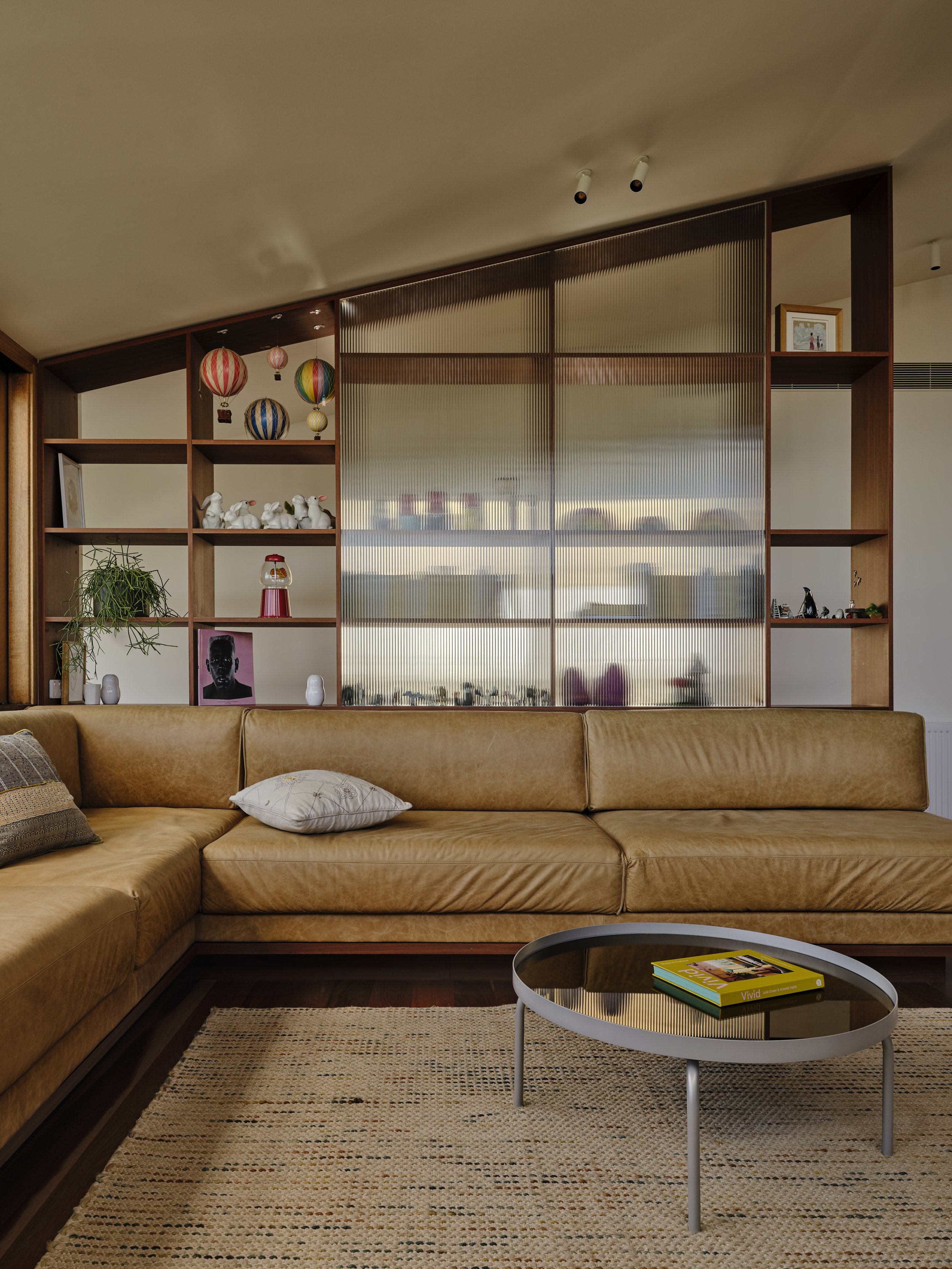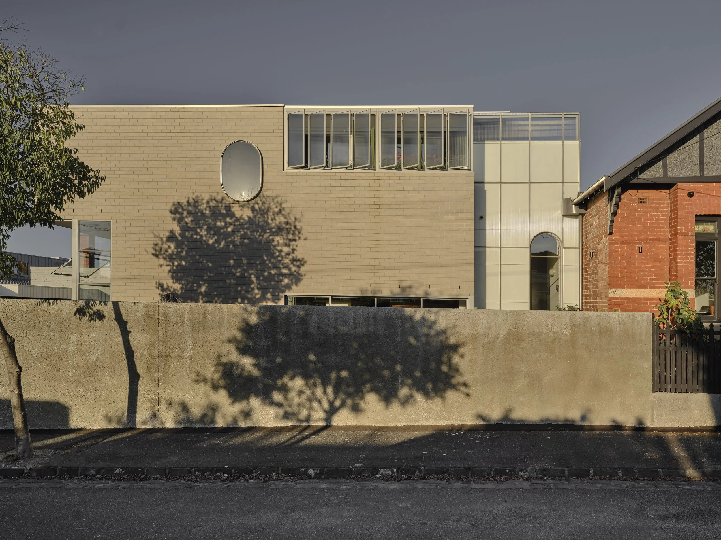 Council heritage requirements shaped the building’s form and materiality, encouraging a respectful dialogue with its surroundings. ‘Being such a prominent corner location and very much in the public eye, local Council, or more specifically their heritage advisor, were quite firm in their direction in regard to the design complementing the local heritage fabric,’ says Dan. The solution was a recessed junction between old and new, clad in narrow reeded glass, softening the transition while brickwork on the western façade referenced the original house and neighbouring properties.
