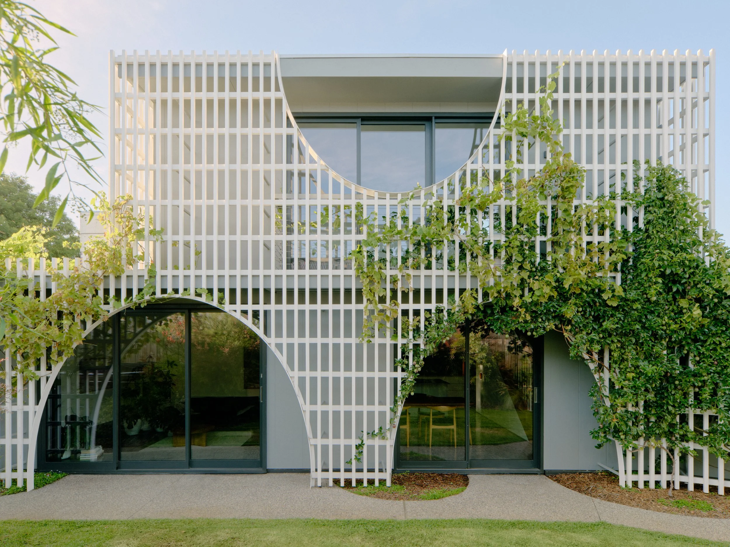The screen is an over-scaled garden trellis to support a productive garden, which is a staple in many neighbouring backyards. The screen design allows the family (who are avid gardeners) to grow their garden upwards, over, and around the house. The screen references classic garden arbours, trellises and lattice structures yet extends to the size of the whole façade to support a productive garden including passionfruit, kiwi, and grapevines, while also providing an architectural element that ties the old and new together.
