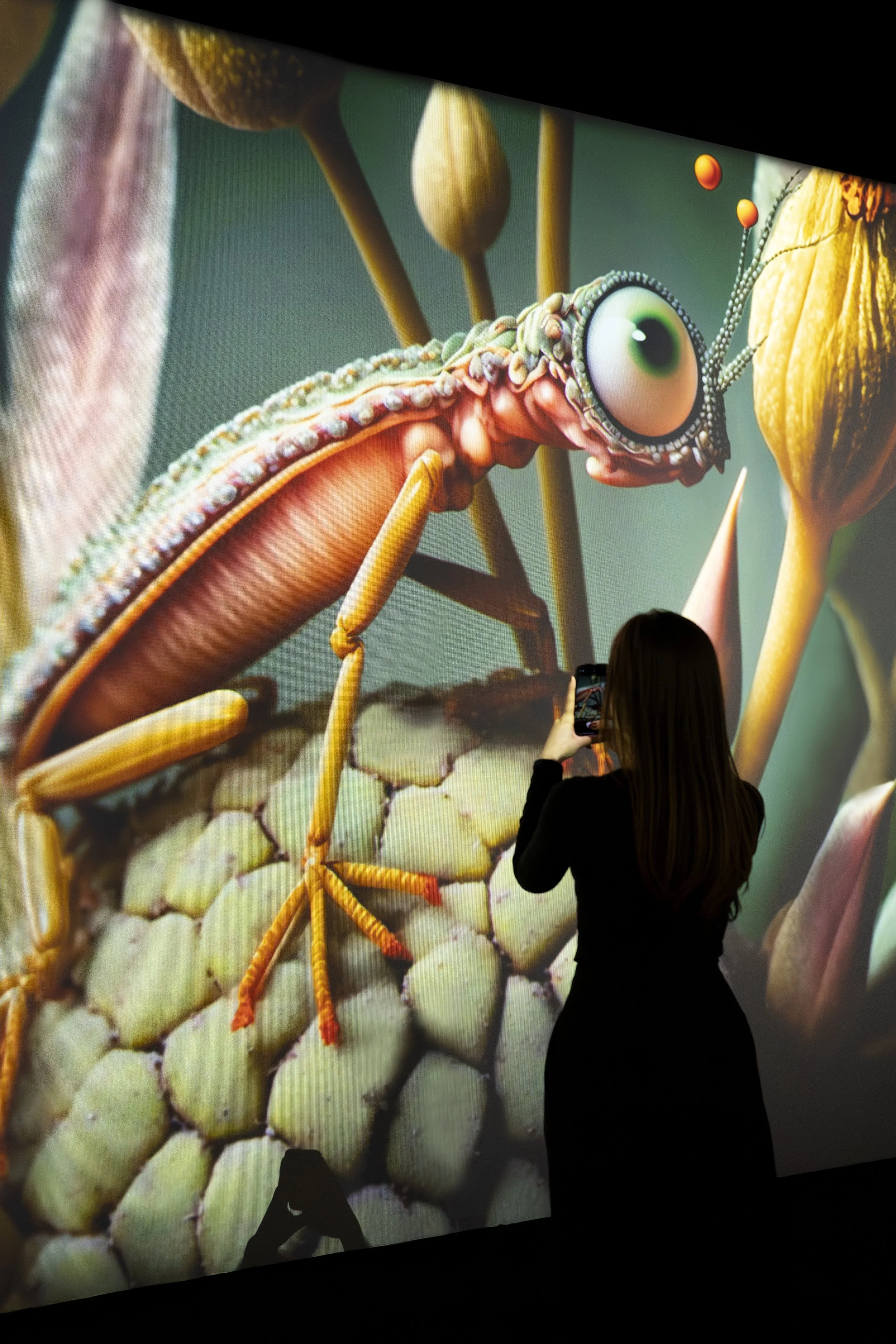 The spaces inside the surreal world take visitors on a transcendent linear journey through the senses. There are four different spaces within: the first space is The Formations Space, which envelops its audience using mirrors, light, sound and reflection. Complexity Space, including animations depicting the birth of never-before seen environments and lifeforms, with captivating 360° visuals. Agents Space, an intricately detailed series of corridors where the audience becomes a part of the art. And lastly, Breathing Space, an opportunity to reflect on the experience in the company of breathing otherworldly creatures, beamed in circular projections within an meditative garden environment.