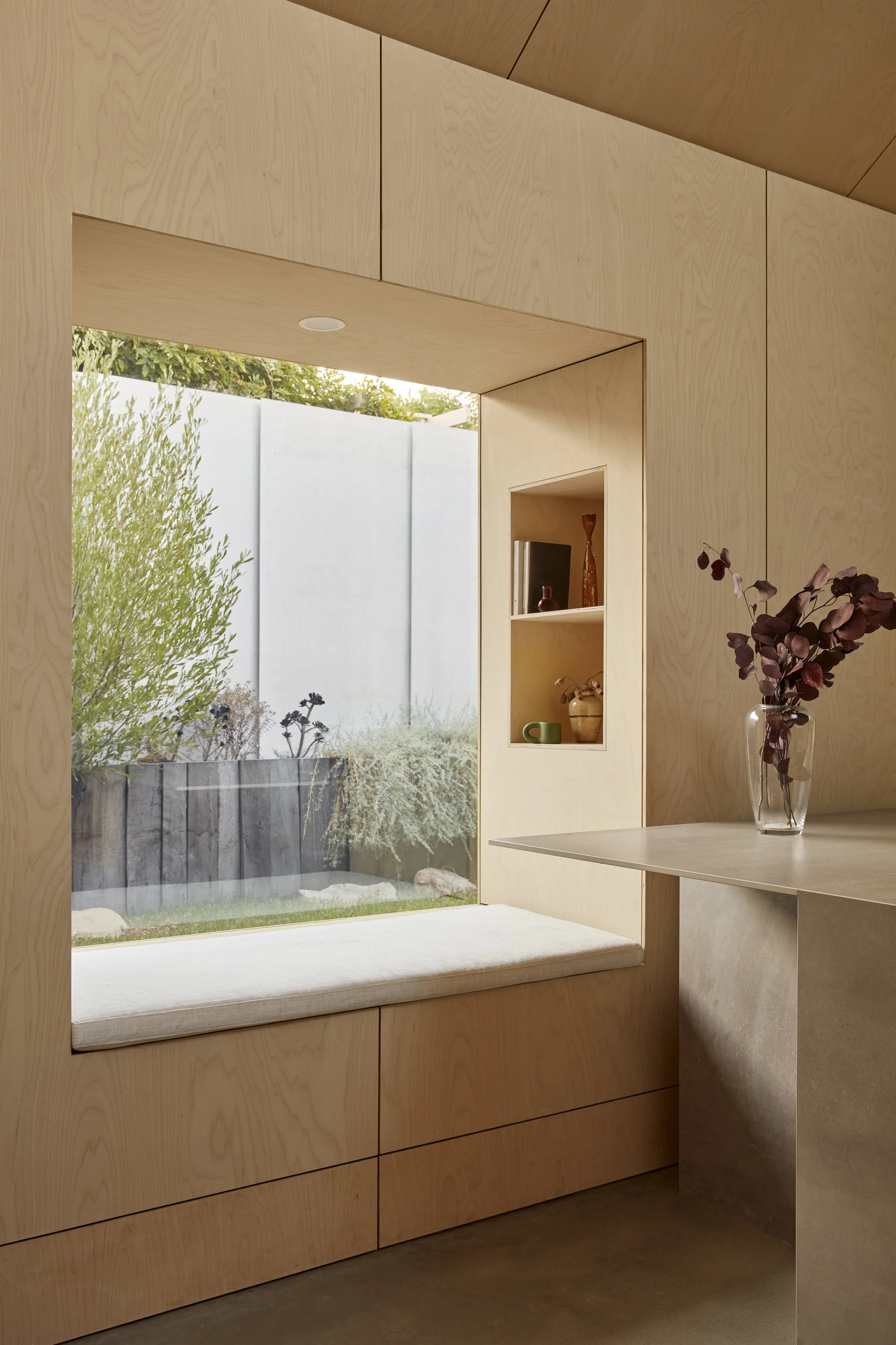 A window seat frames the backyard view. Photo: Jack Lovel