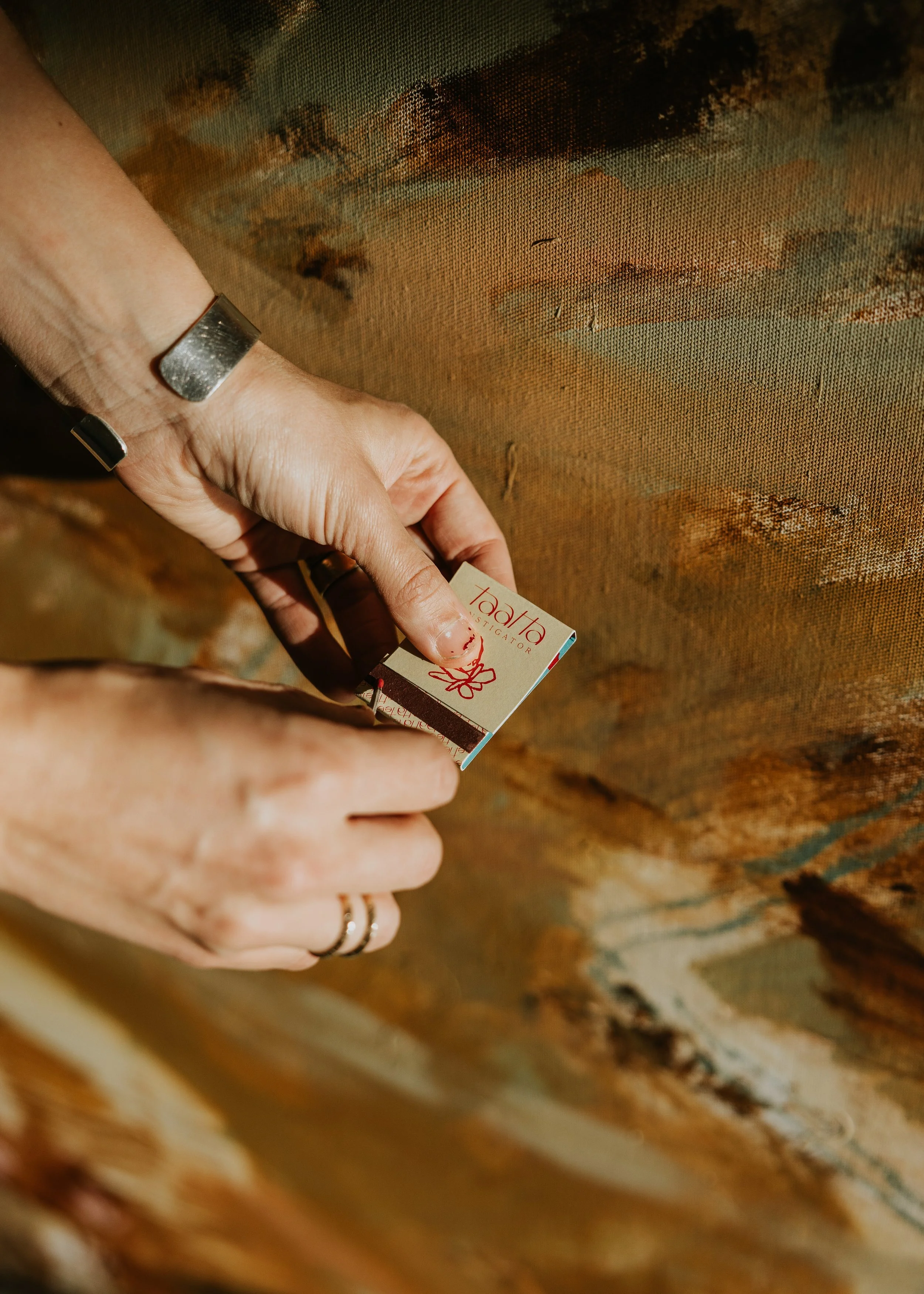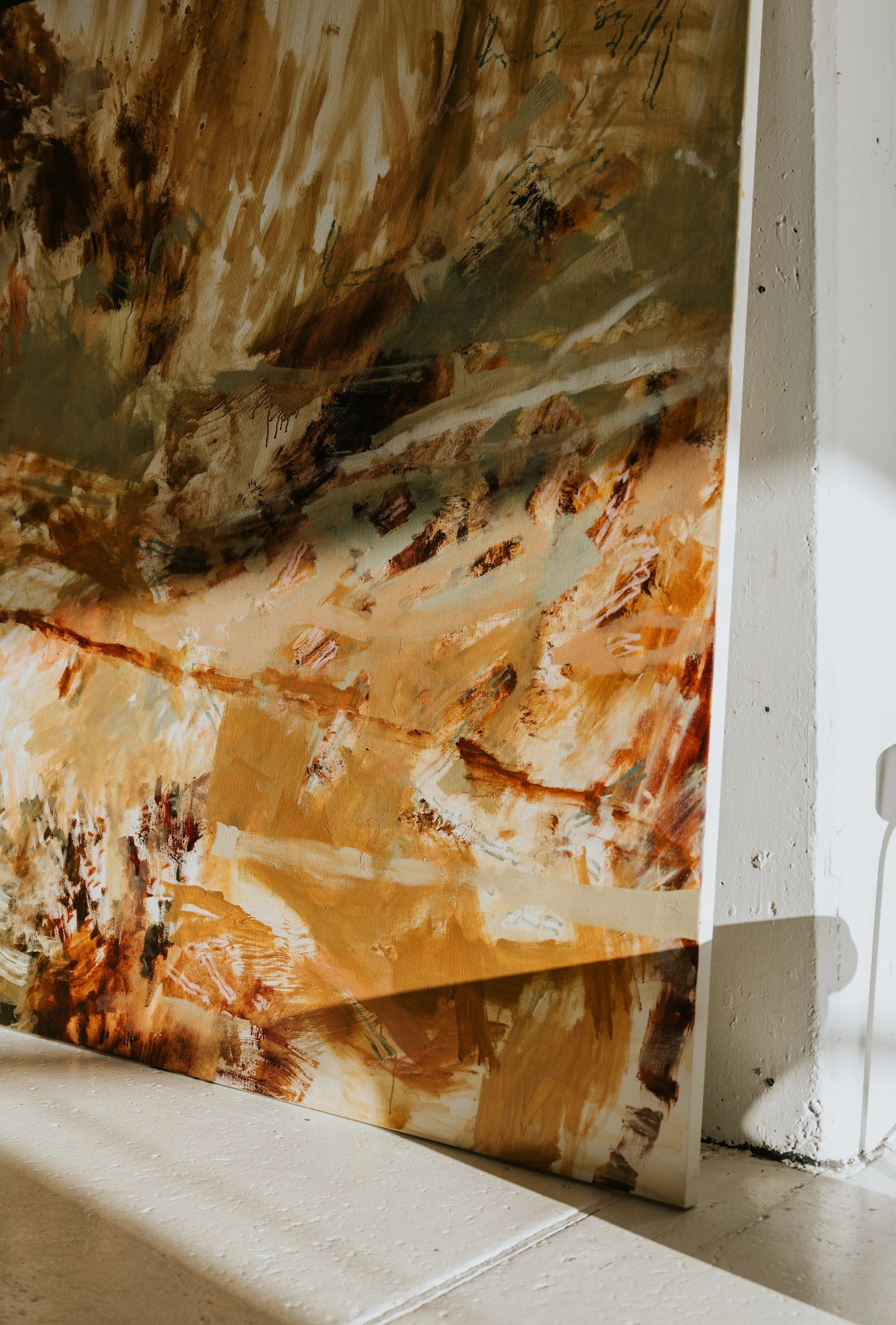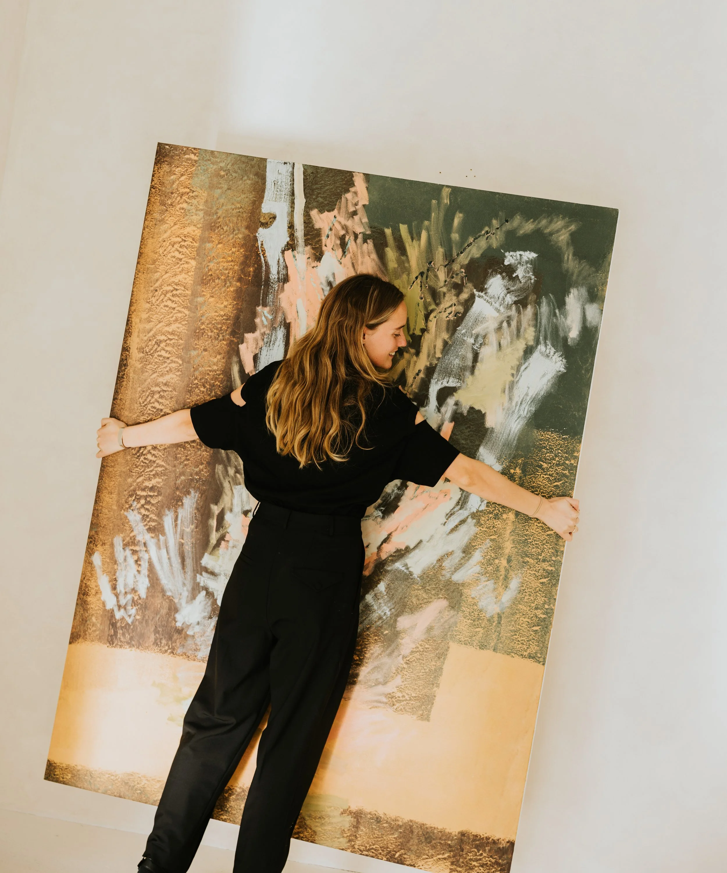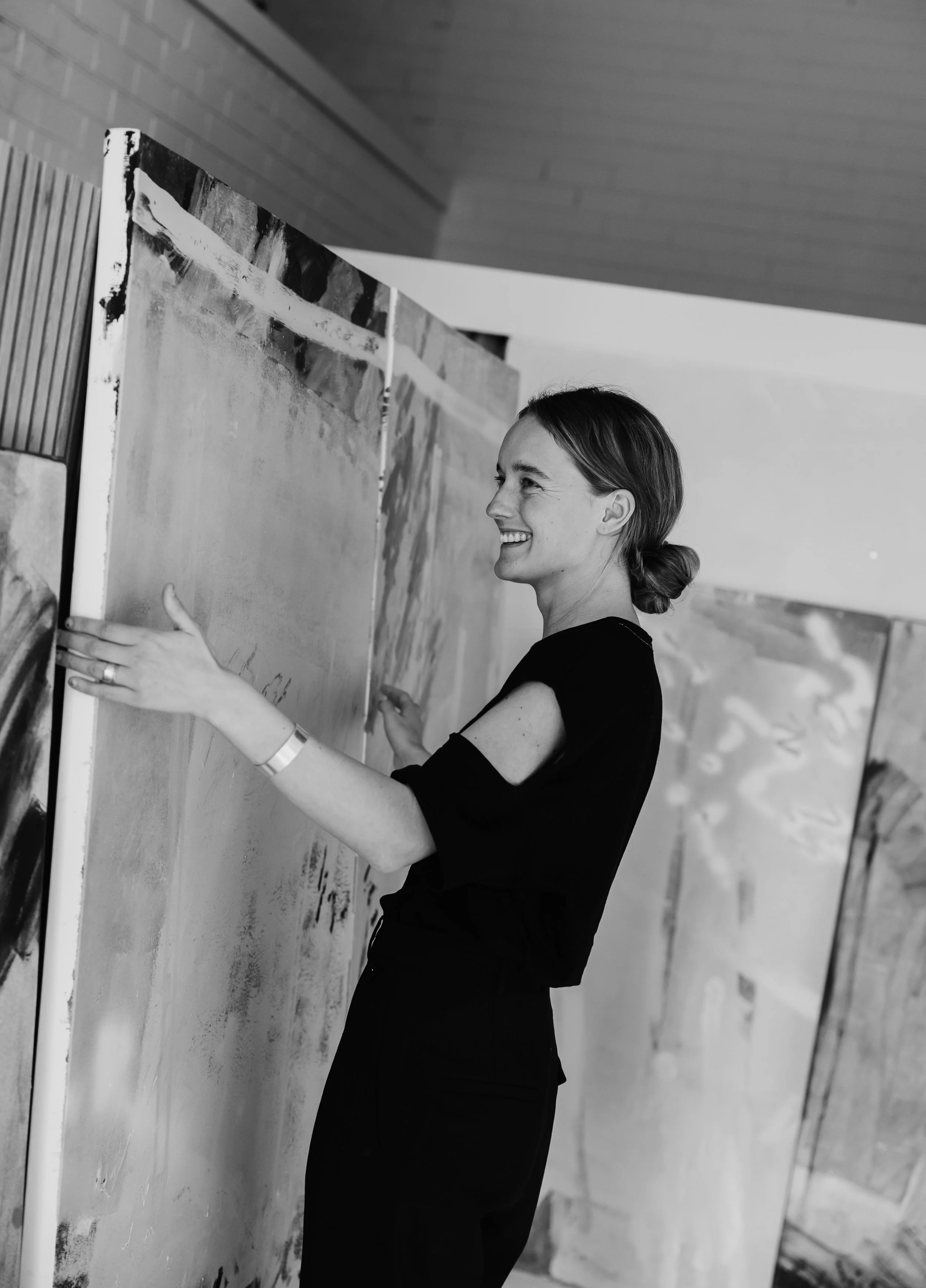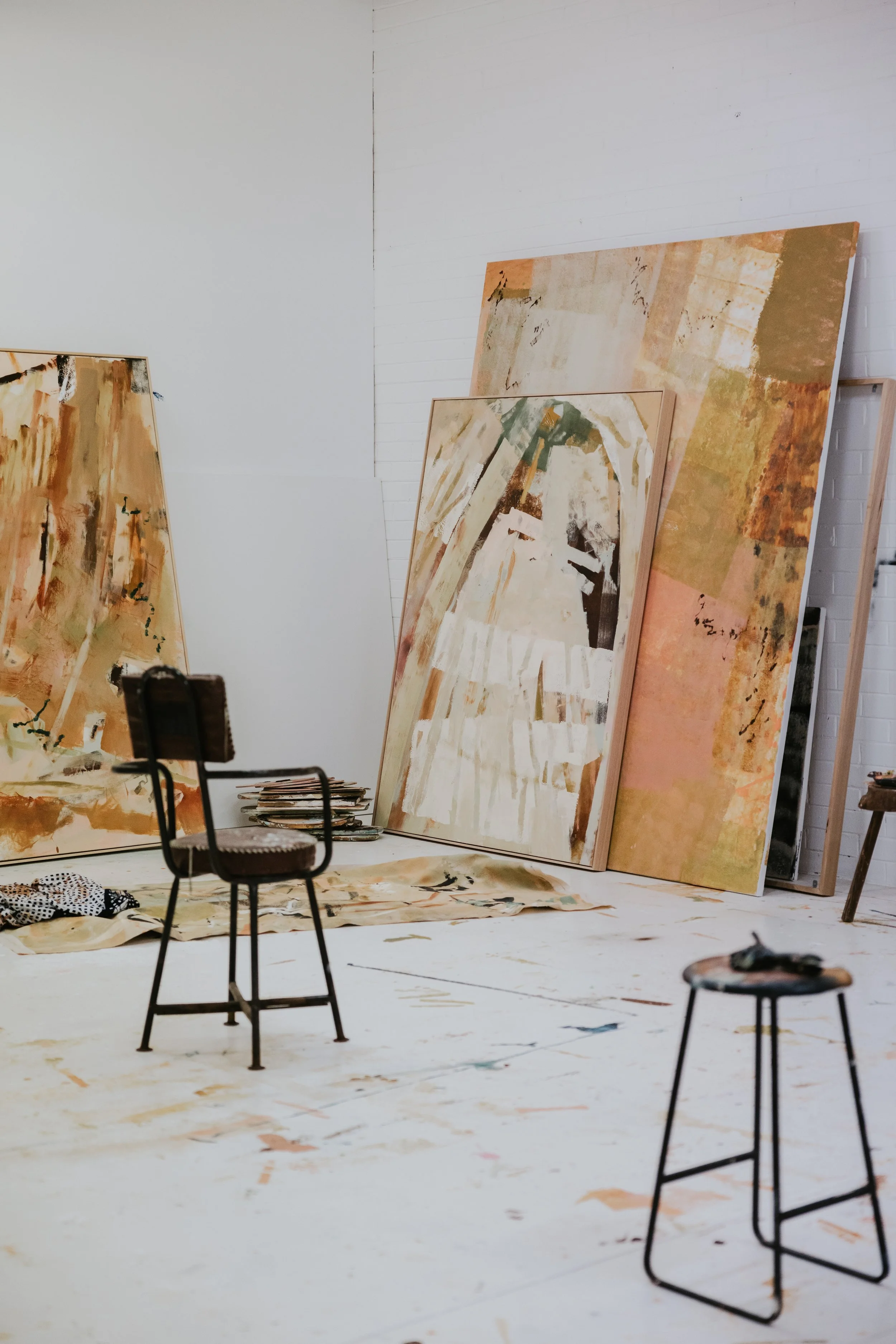 The series was conceived from her studio in the Northern Beaches, a former warehouse drenched in natural sunlight, which filters through its expansive windows – the shadows and reflective gaze were a building block for her abstract large scale works.