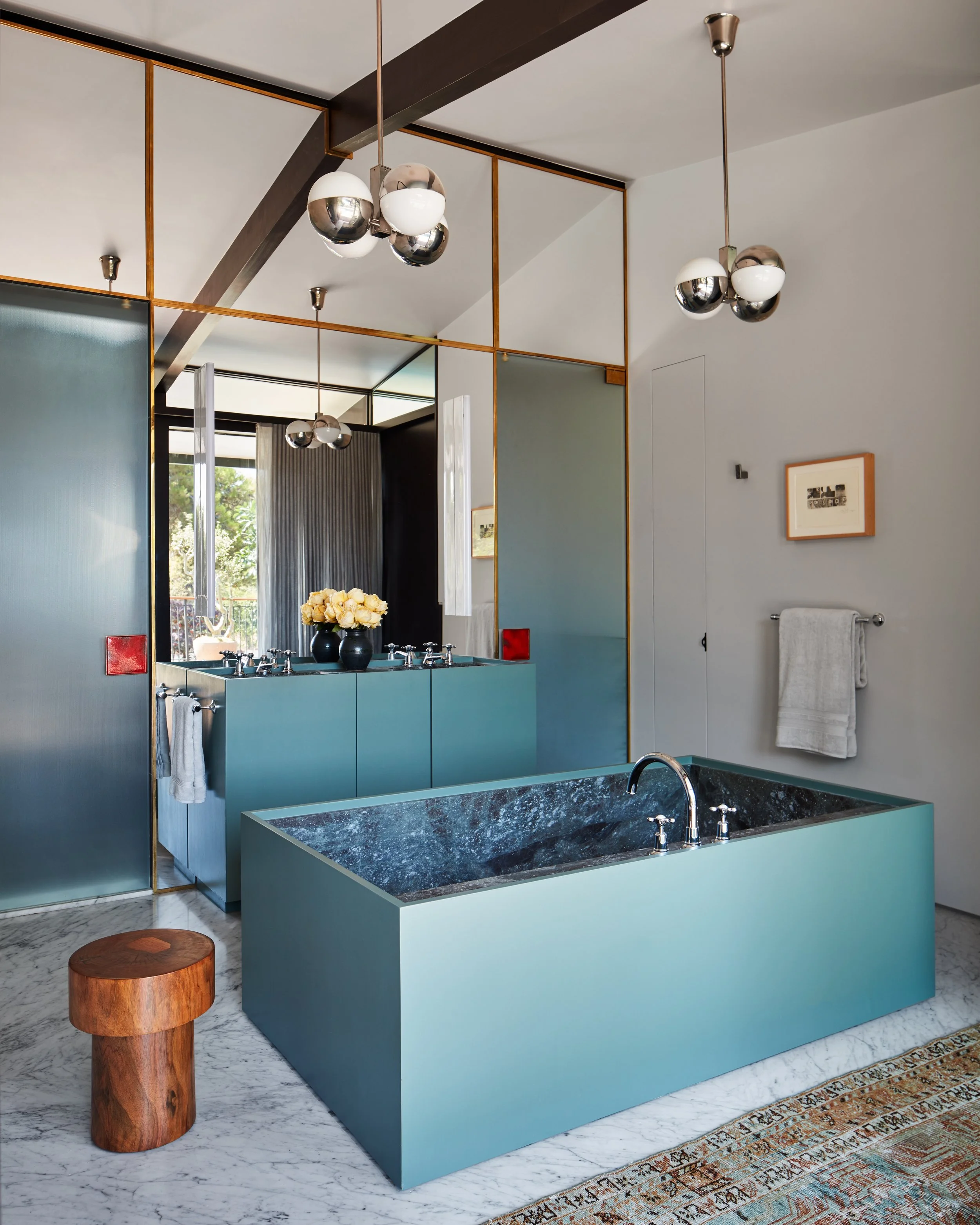The custom bathtub in the main bathroom in West Sunset home is lined in granite. Fluted glass doors with vintage handles. Photo: Stephen Kent Johnson