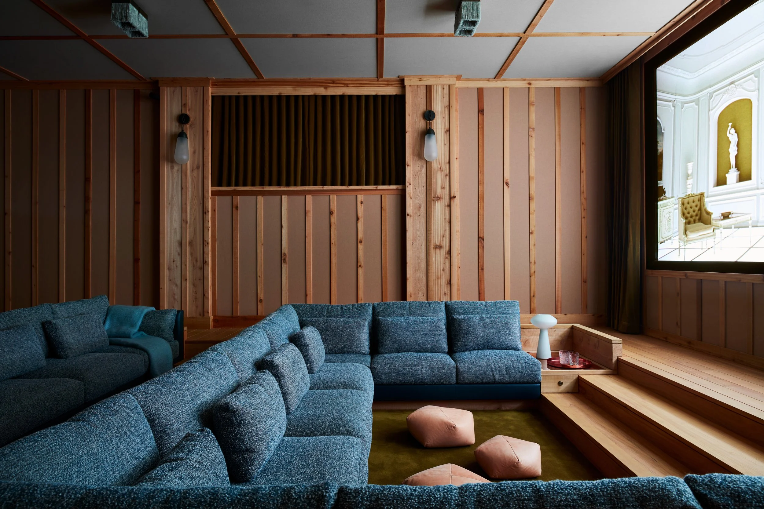Libbey Estate home – the screening room is filled with custom sofas. Sconces are by Apparatus and the ceiling lights are made by Lumfardo with Samuel & Sons fringe. Photo: Stephen Kent Johnson