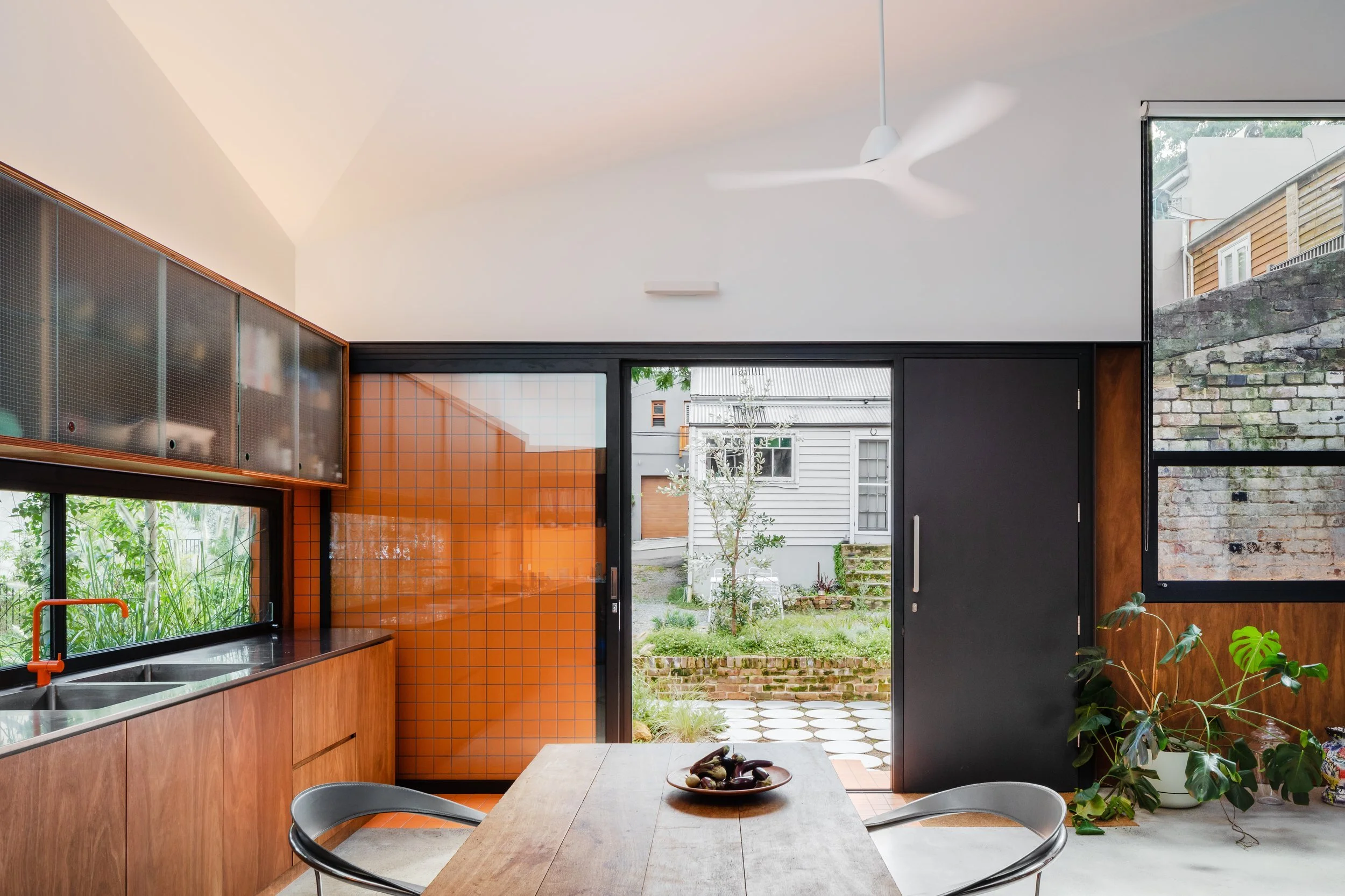 The application of papaya-coloured ceramic tiles also draws inspiration from Asian homes and seamlessly complements the integrated heritage stable brickwork. Spotted gum ply is extensively used in the interiors, creating a contrast against the white ceilings, while the double-height tiled blue walls surround an internal courtyard, enhancing the overall aesthetic of the interior.