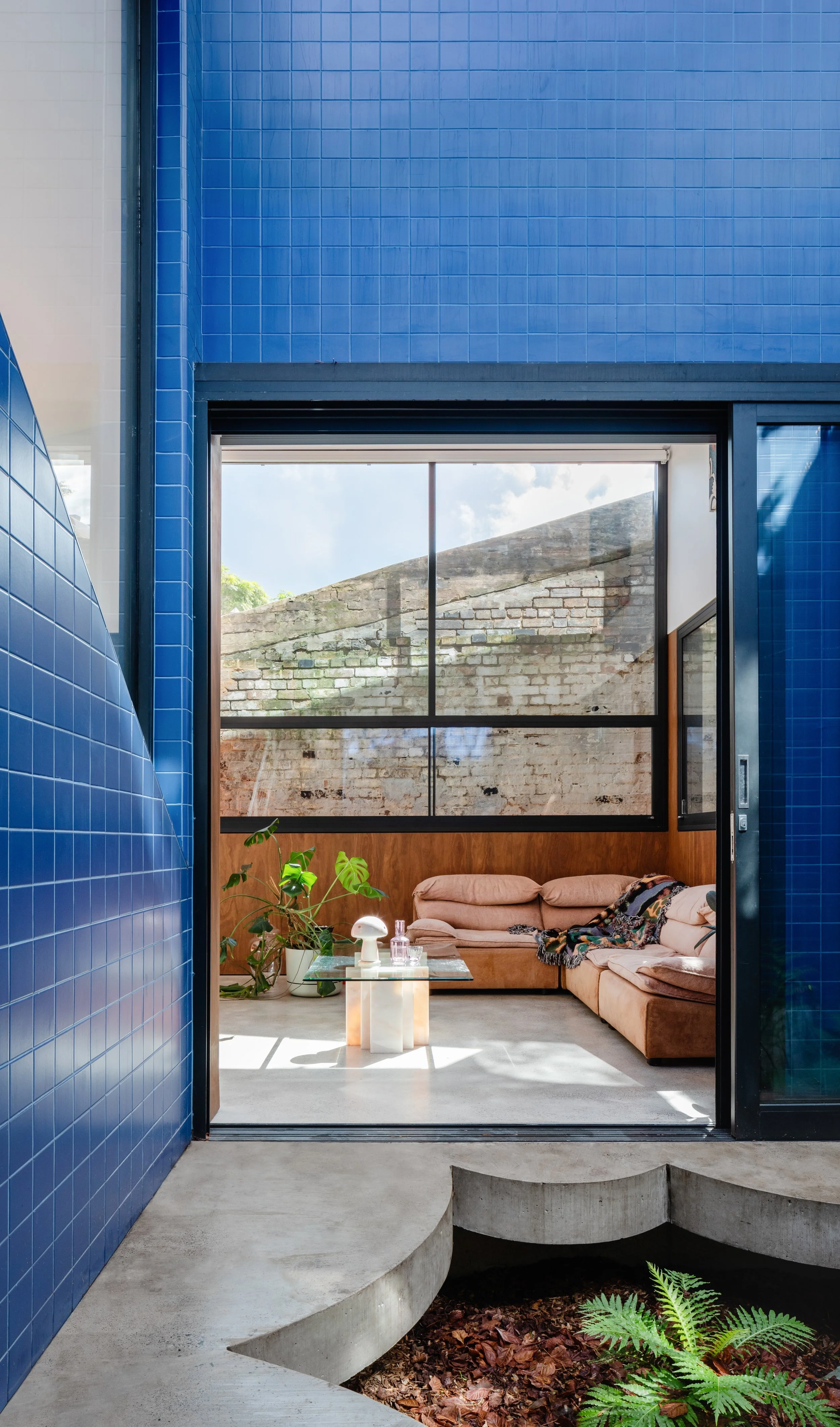Double-height blue tiled walls enclose an internal courtyard. Photo: Katherine Lu