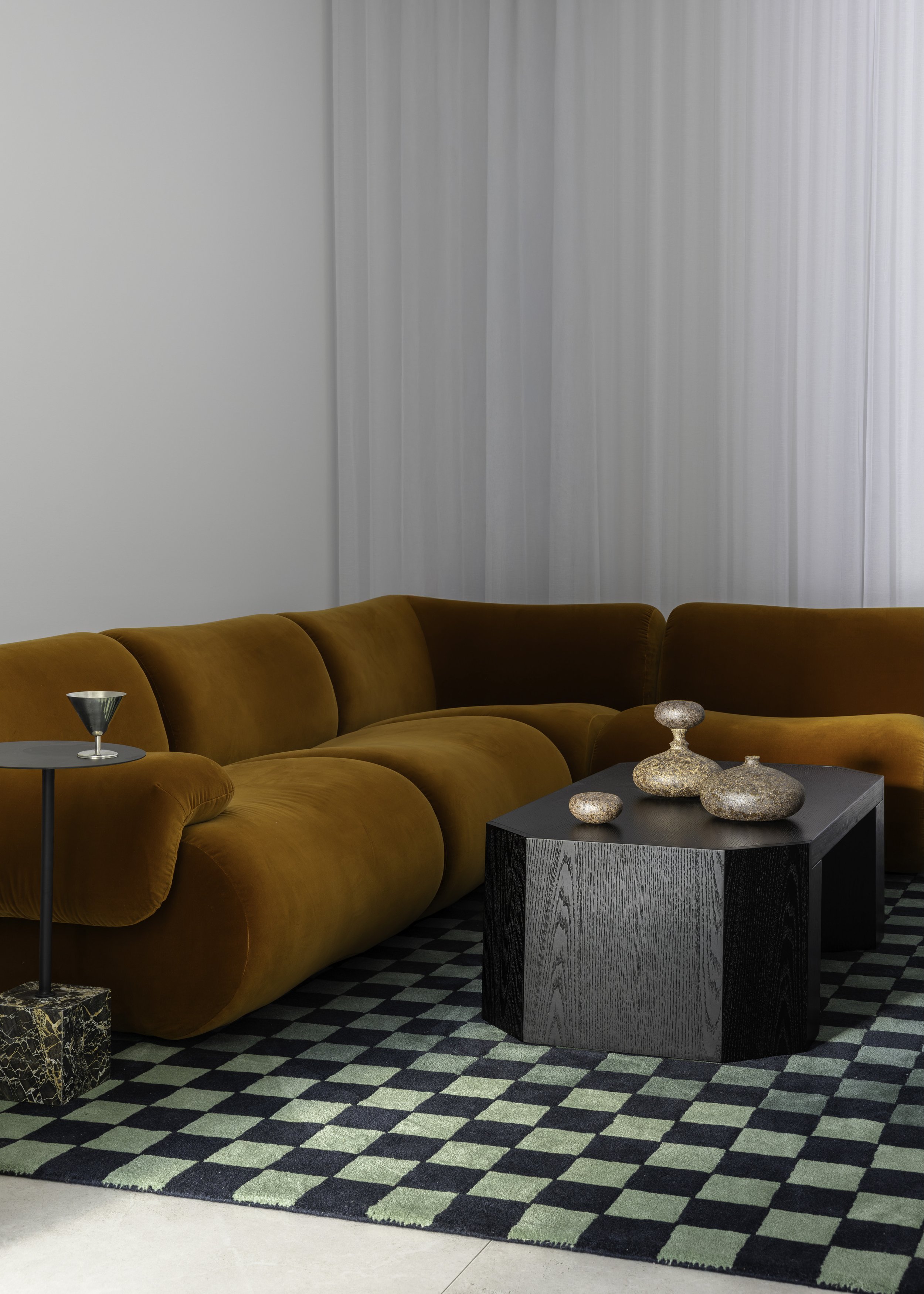 I introduced a sculptural, oversized sofa in a deep crimson to anchor the open-plan living area; bold in tone, generous in scale, and soft in form. In the theatre room, we had some fun: a golden velvet sofa paired with a checkered rug brought a hit of character and contrast, layered to make the space feel playful yet grounded.