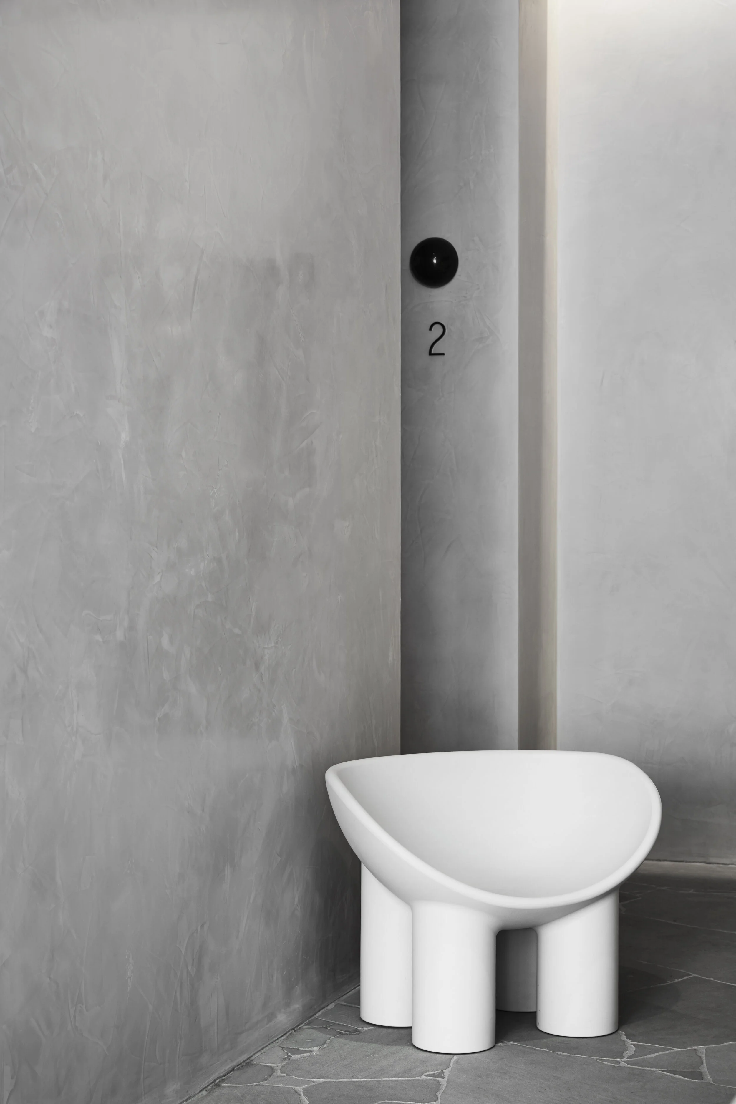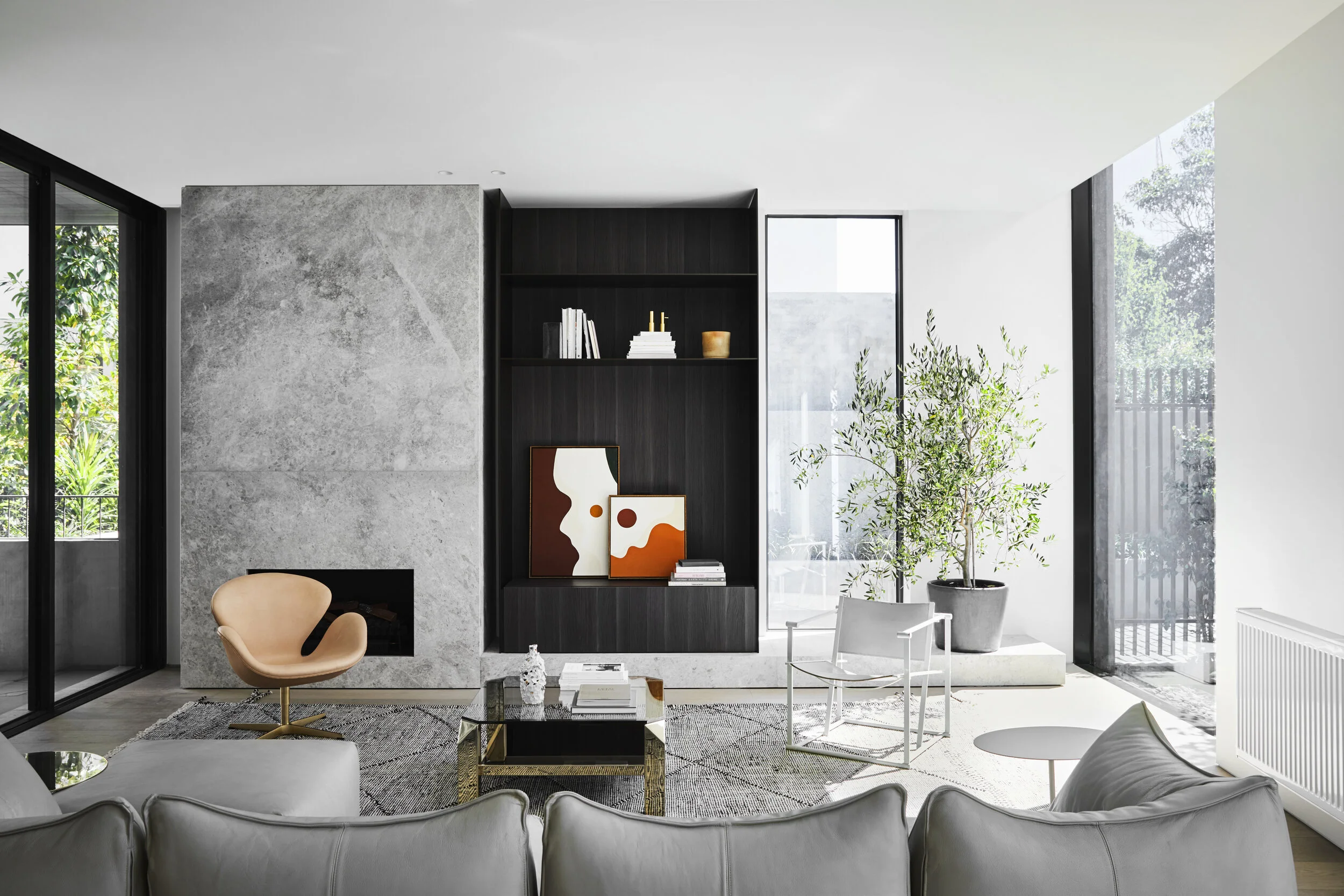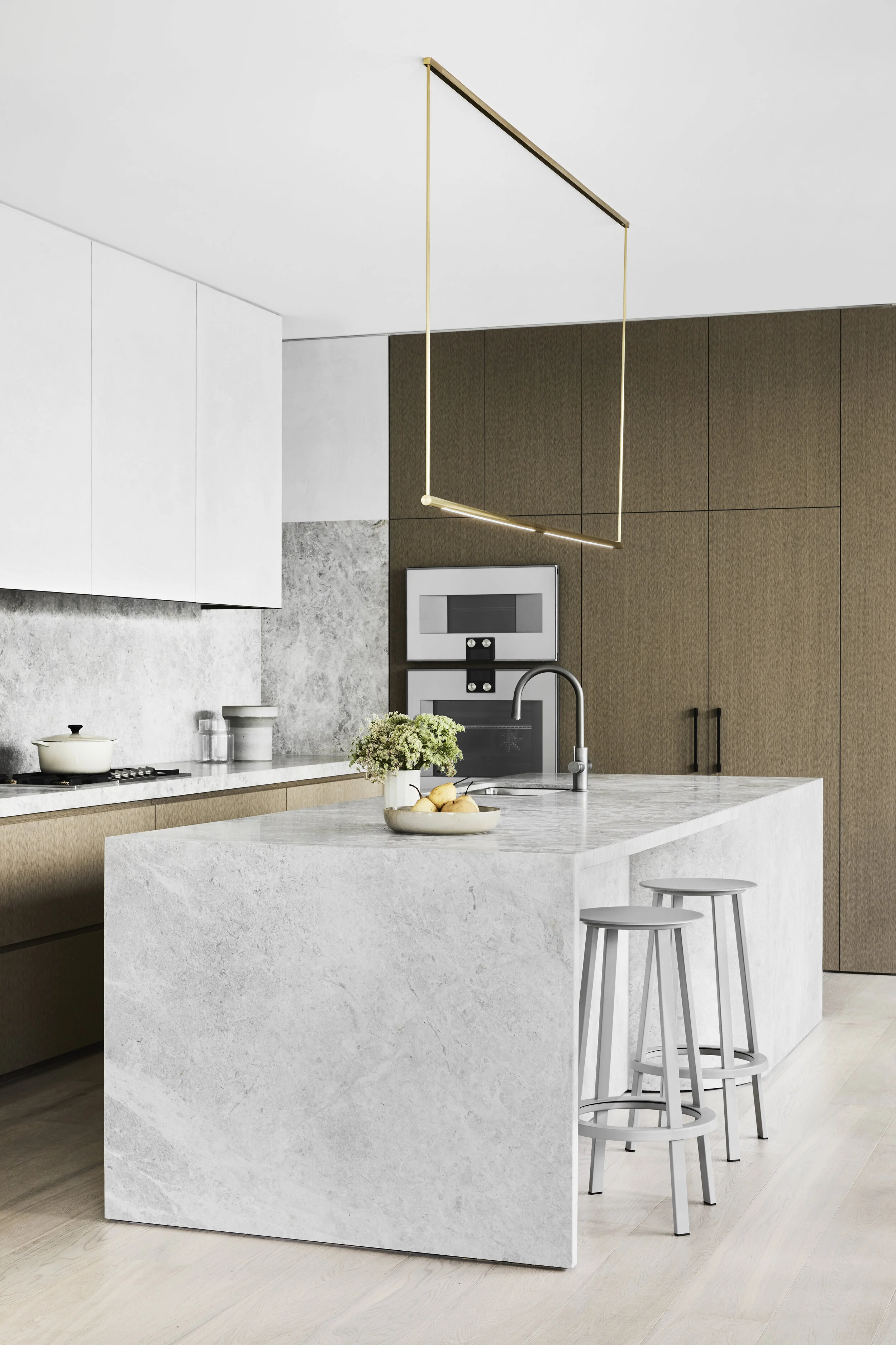 Subtle and tonal finishes comprise the apartments, the main feature - an uncomplicated grey palette bought to life with monolithic slabs of limestone, mixed metals and warm timber. Injections of earthy colour work as an accent, restrained to furnishings and artwork sourced from local vintage furniture retailers. Inlaid brass, nickel and blackened bronze fittings commissioned specifically for the space add a luxurious sheen and floor to ceiling blackened steel windows invite both the bay and cityscape inside, connecting the outside to the interior.