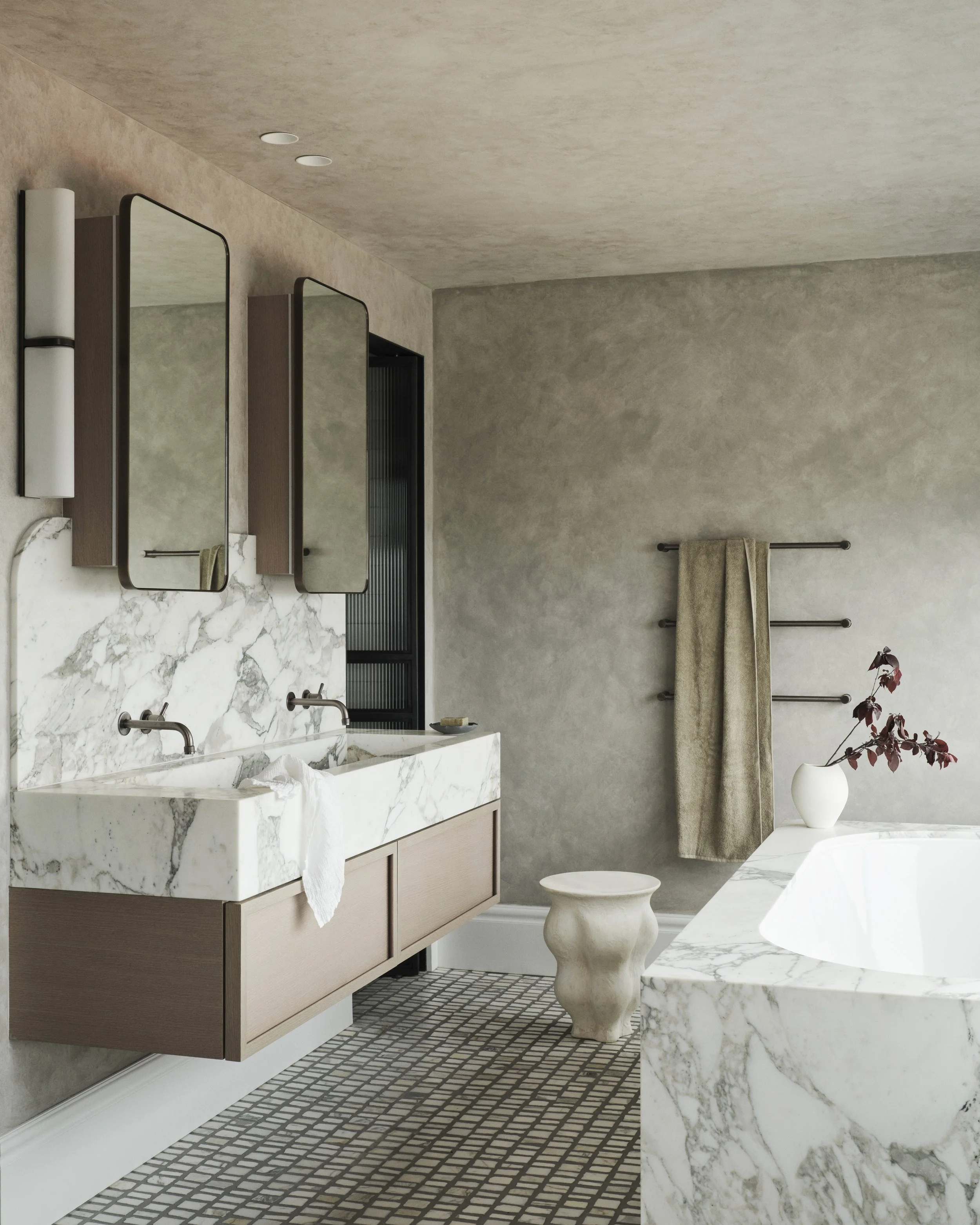 Tamarama Penthouse balances femininity and boldness throughout the spaces. ‘Upstairs to the master suite, the palette transforms into a moody and masculine interior with deeper tones and richer materials, creating a more sultry space predominantly occupied at night time,’ shares Samantha.