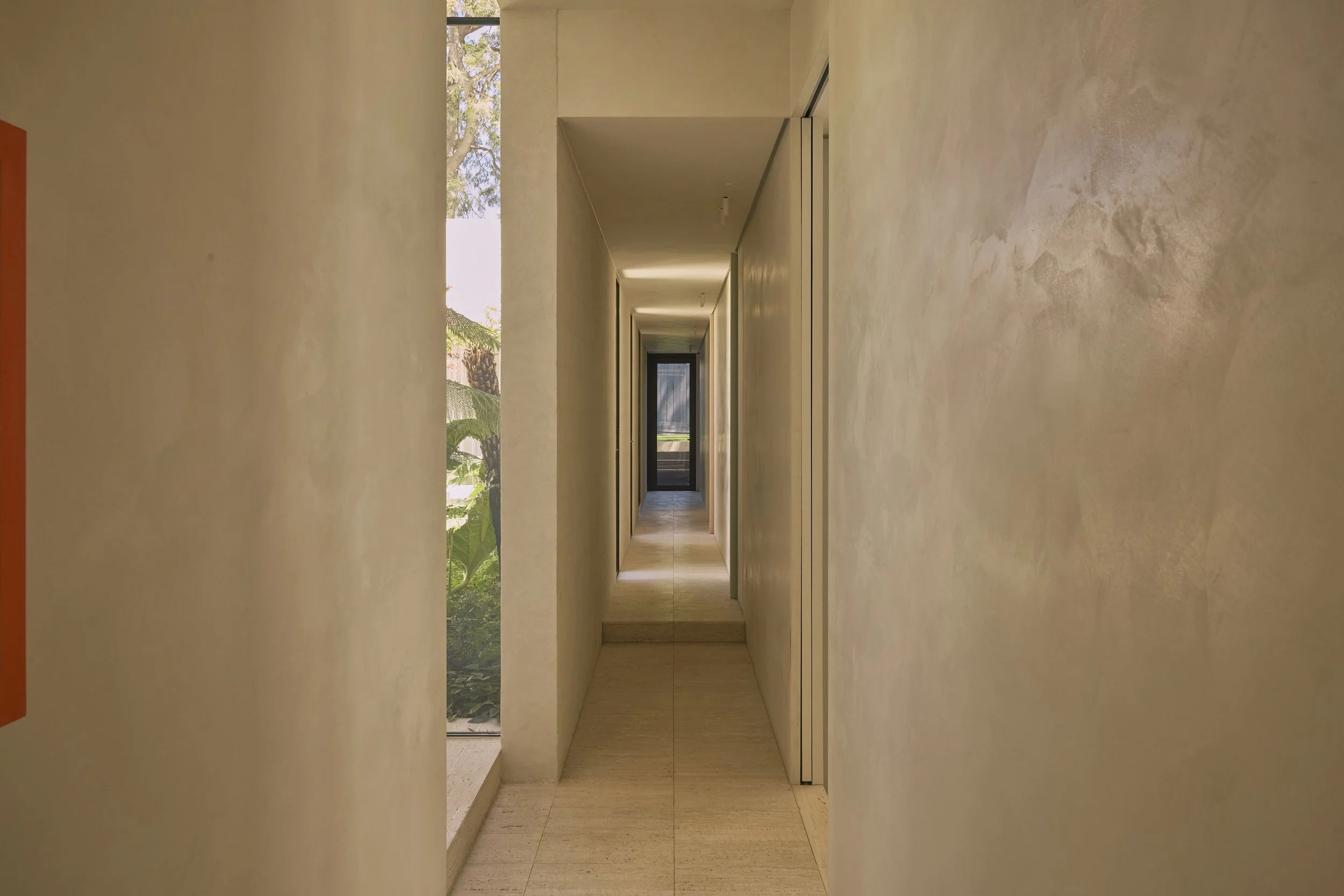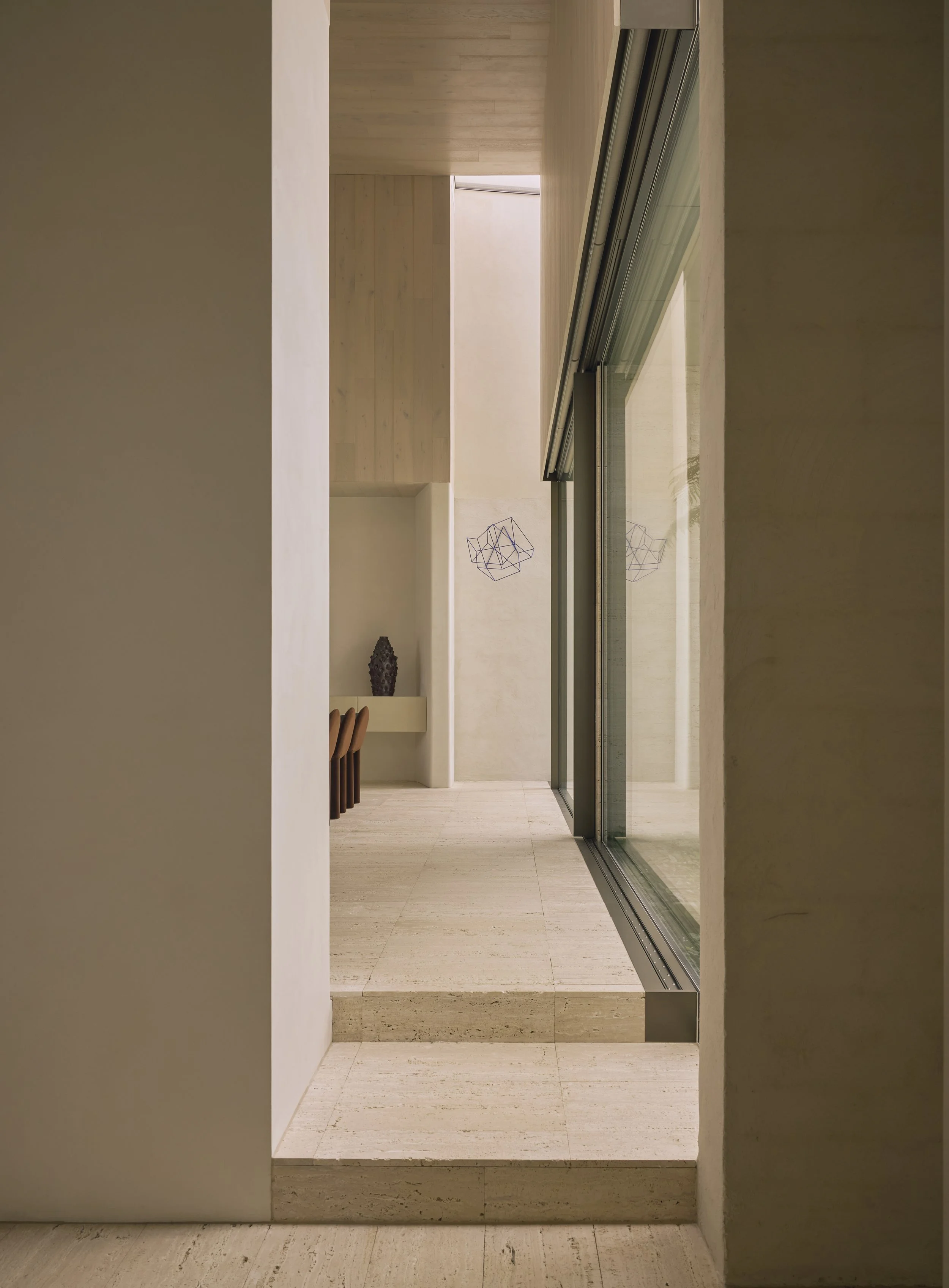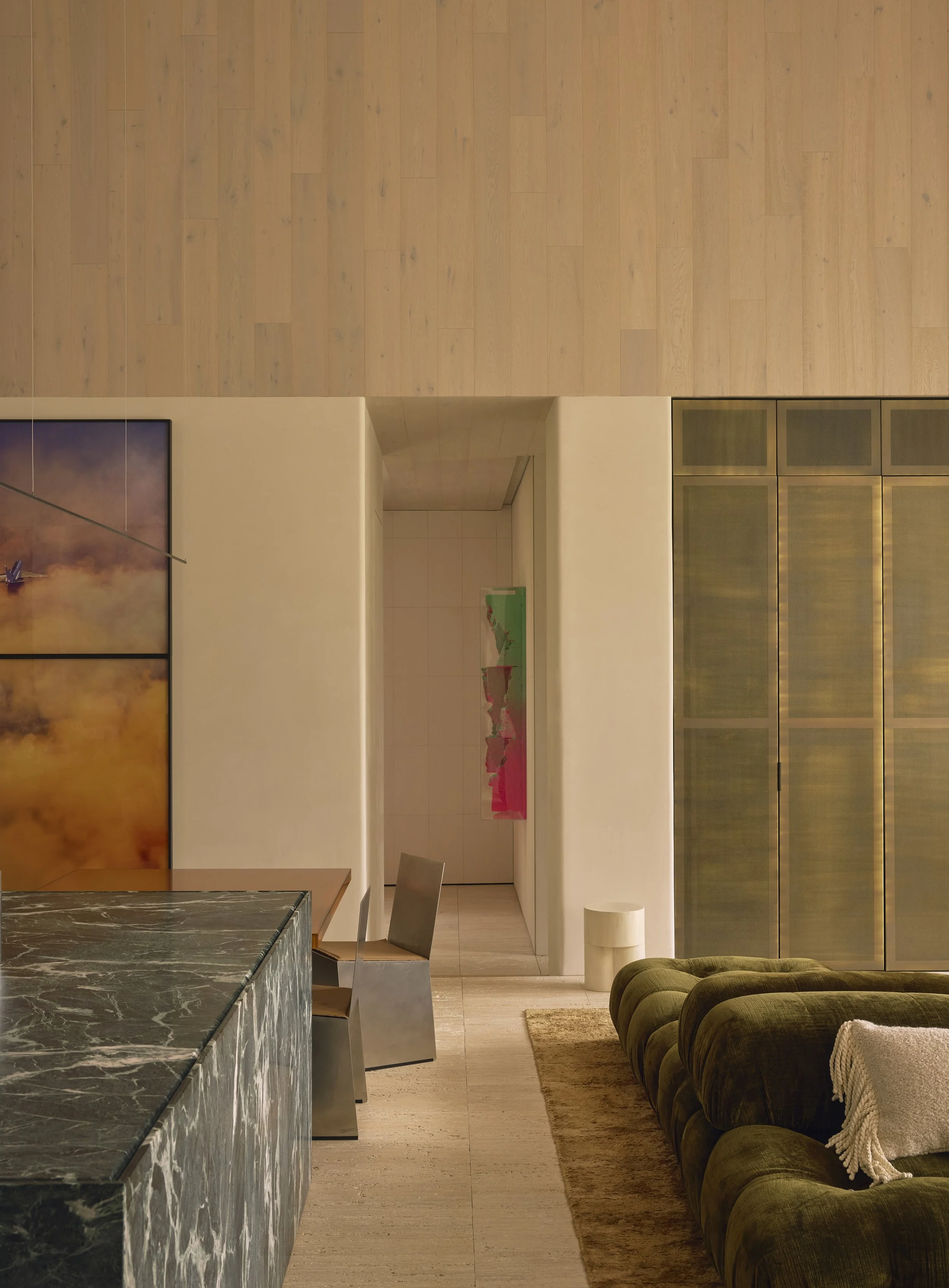 Arrival is reset from the start. Rather than a front door reveal, guests are guided along an intimate landscaped path to a side entry. A large door opens onto a vestibule lined in silver travertine and combed limestone, a compact prologue where curated artworks set the tone.