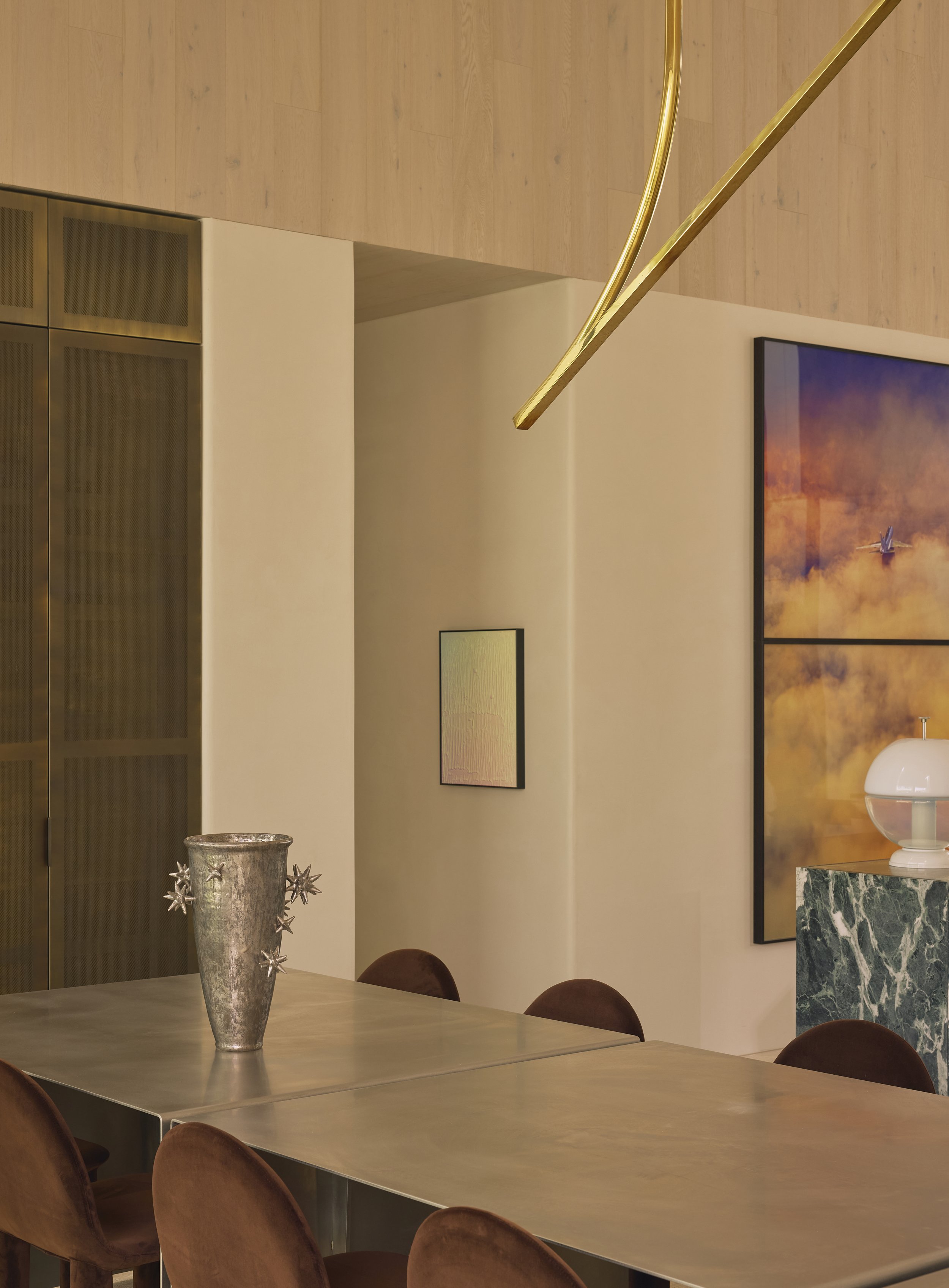 Details are handled with restraint. Leather-wrapped consoles sit flush in niches. A perforated bronze bar, each panel individually patinated, acts as a counterpoint to the custom dining table. The main ensuite centres on a cylindrical vanity within smoked-glass screens and connects to a bespoke wardrobe. In the children’s bathrooms, Bisazza Opus Roma tiles run wall to ceiling and across the vanity for a continuous finish.