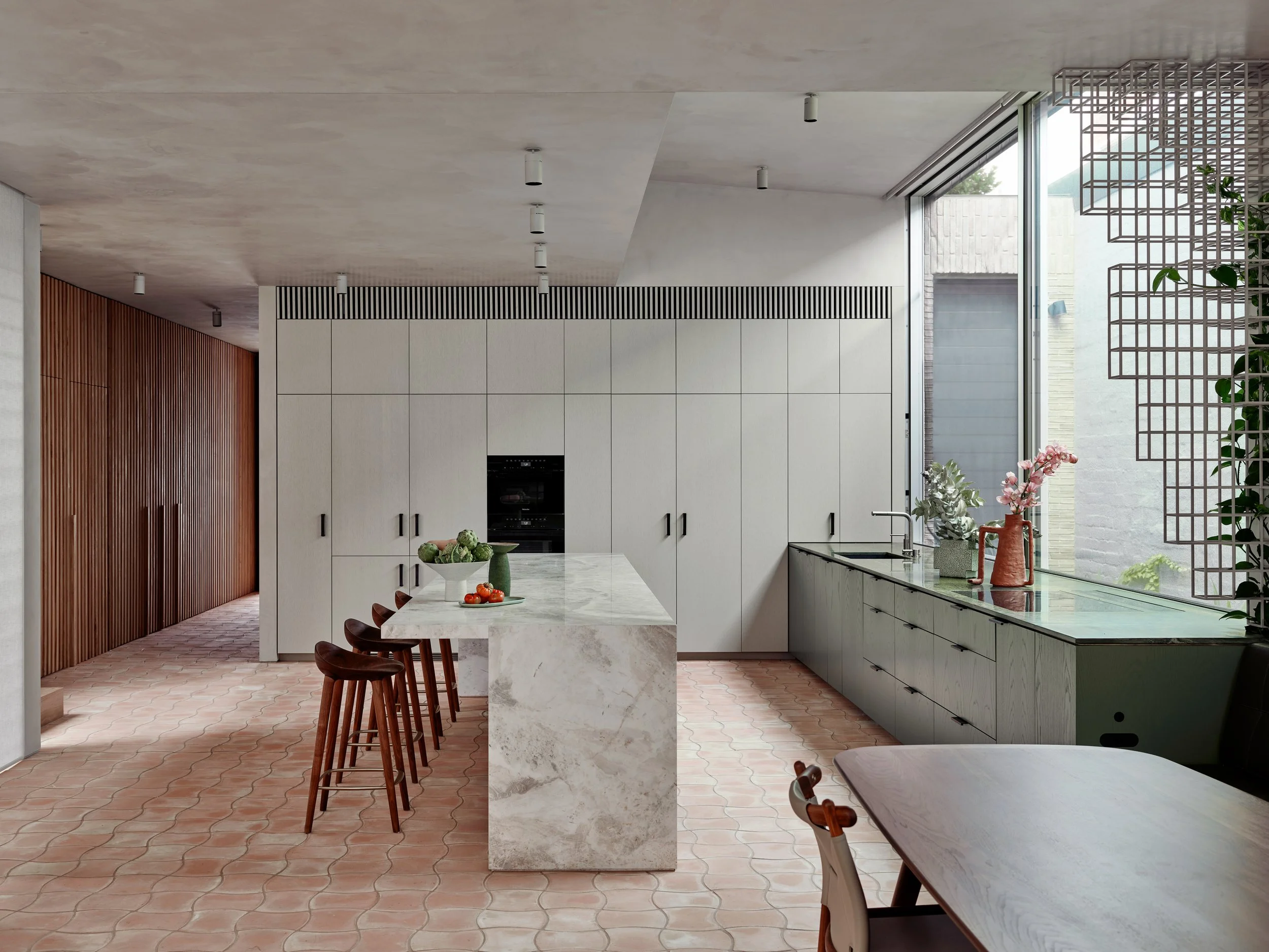 The kitchen features green-stained timber veneer cabinetry, a marble kitchen island and squiggly-shaped terracotta floor tiles.