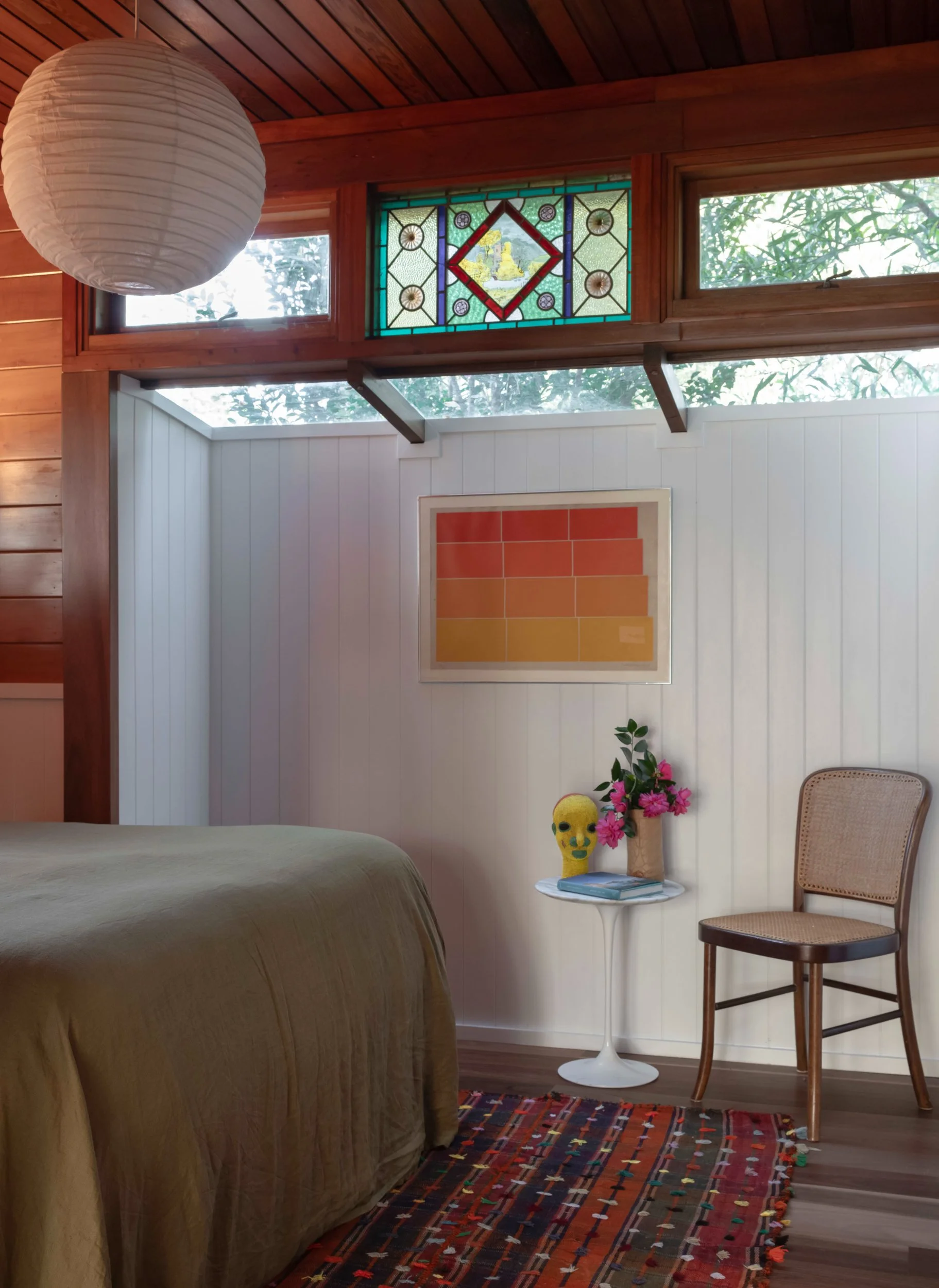 The warm main bedroom space includes a feature stain glass window, which pick up tones within the space.