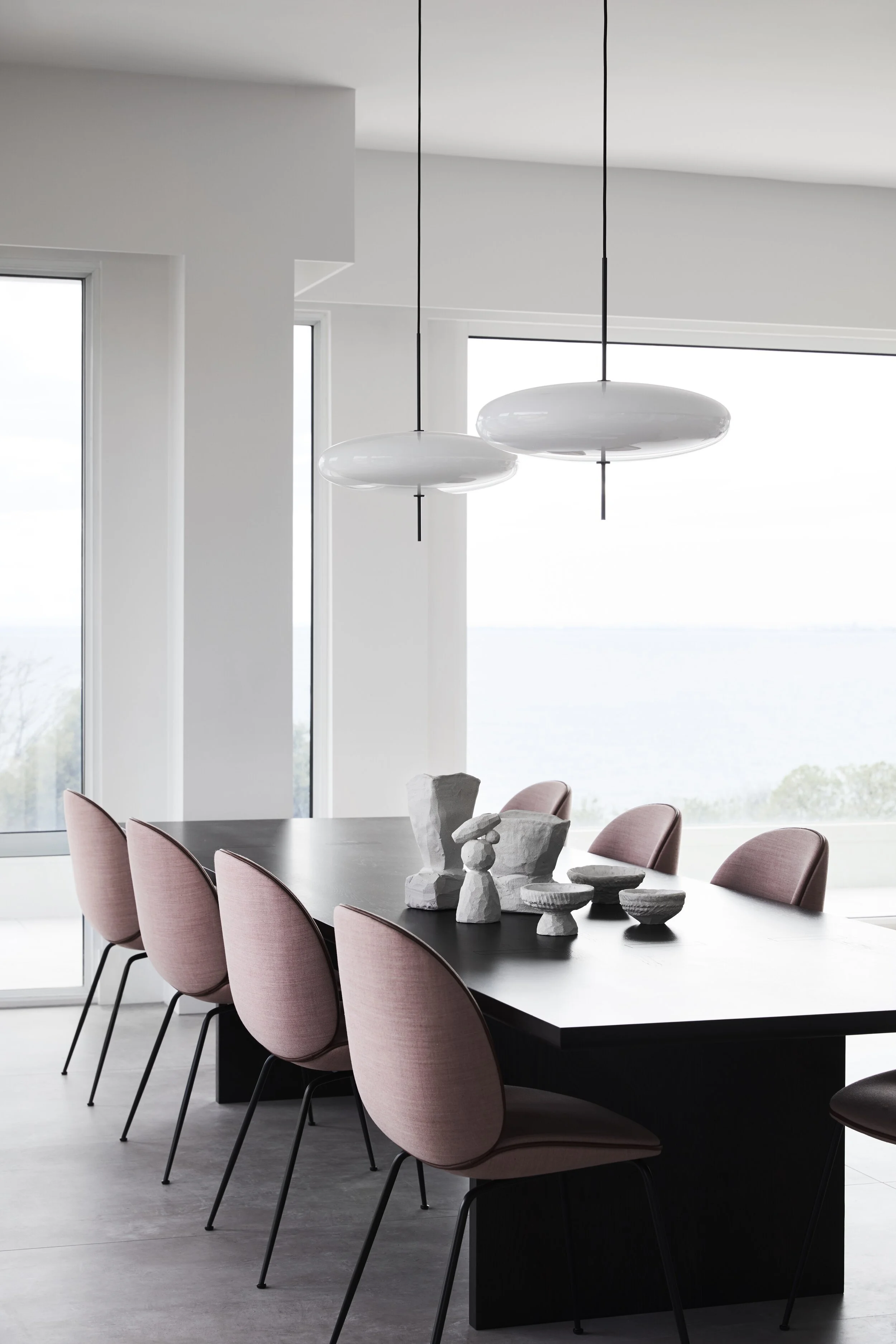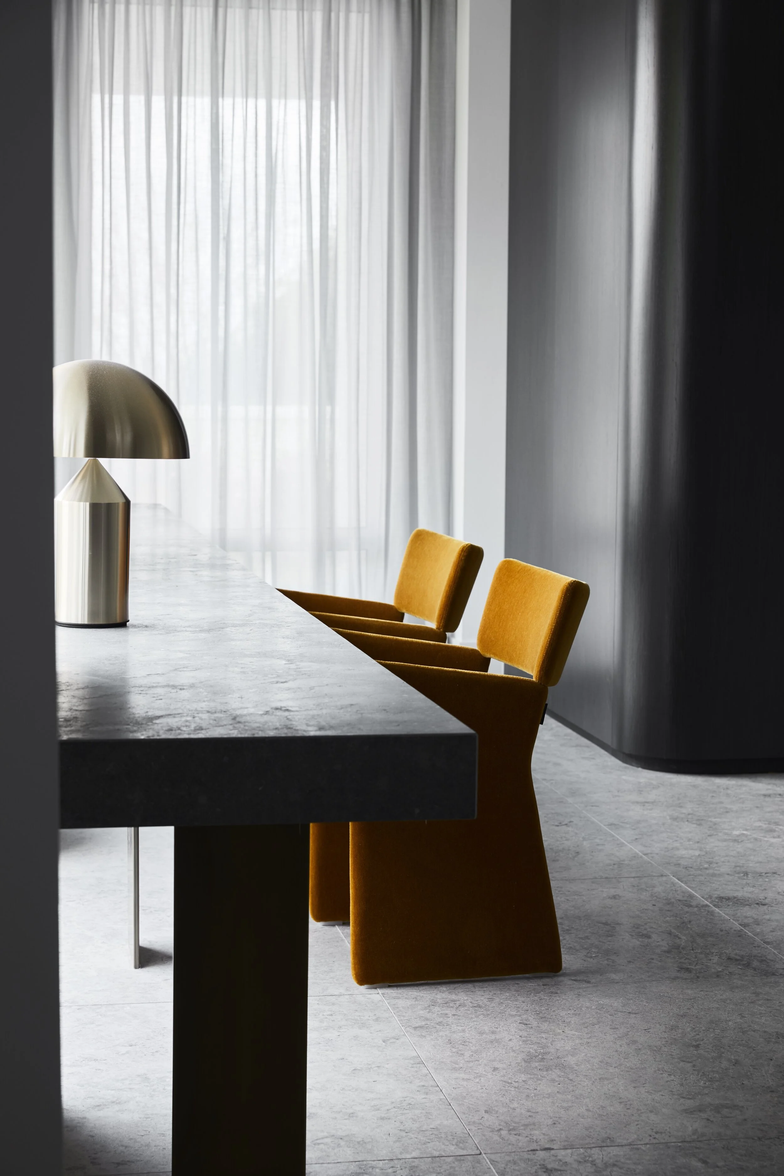 The large Living Divani sofa is an iconic addition to the living space while a custom rug by Halcyon Lake provides scale for the four metre long bespoke dining table designed by Lowe Furniture. A diffused pendant lighting by Flos illuminates touches of brass and highlights textured linens to create a softness that tempers the large space.
