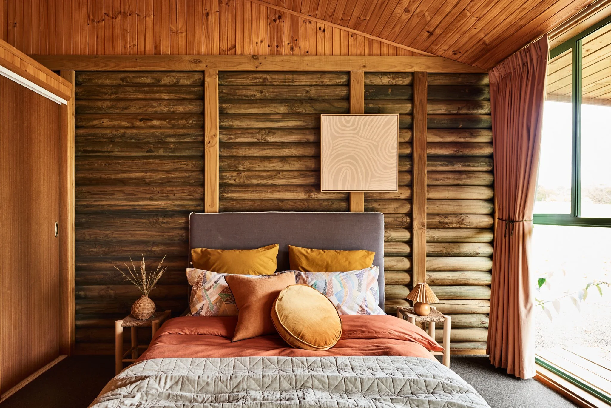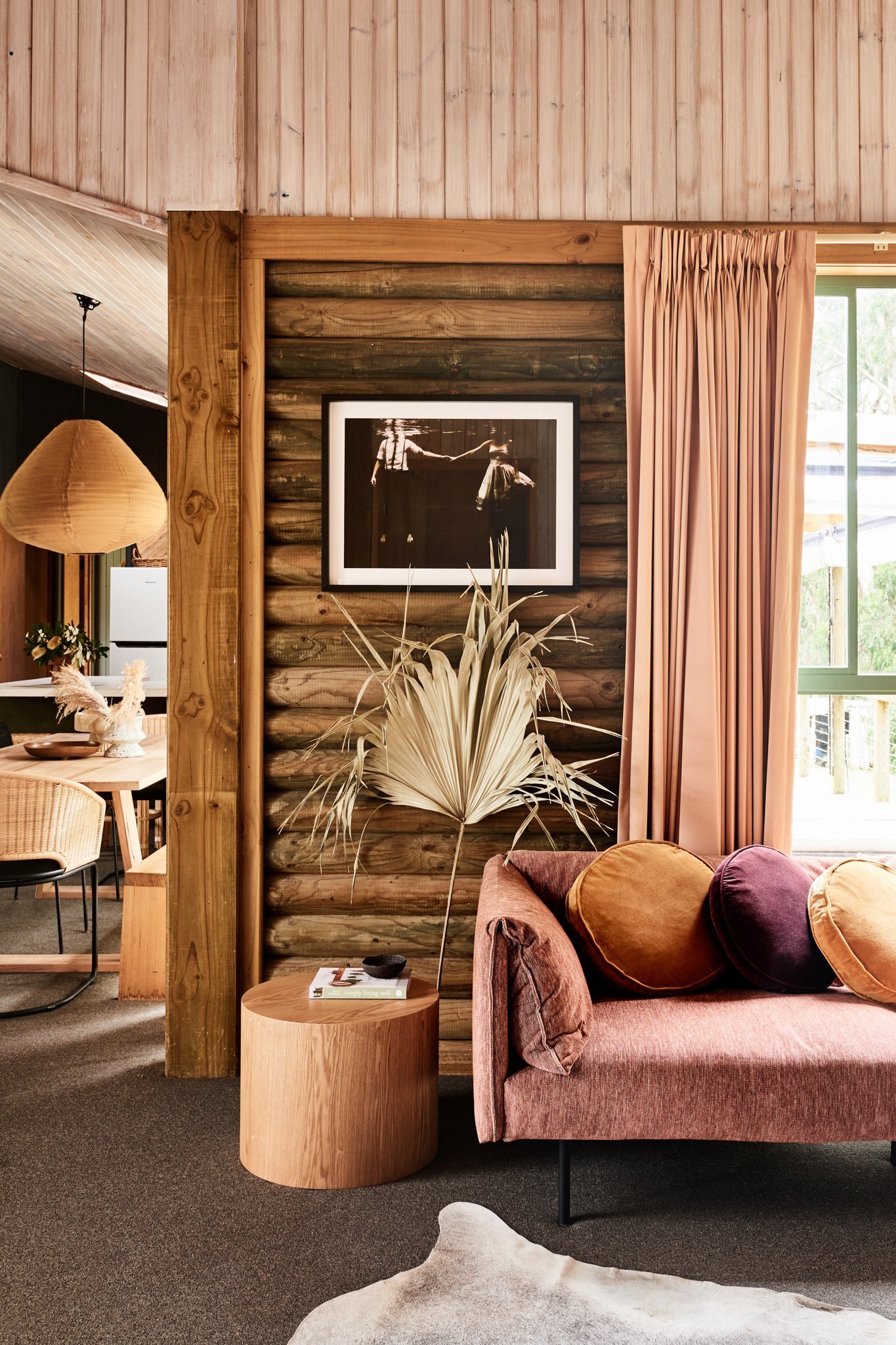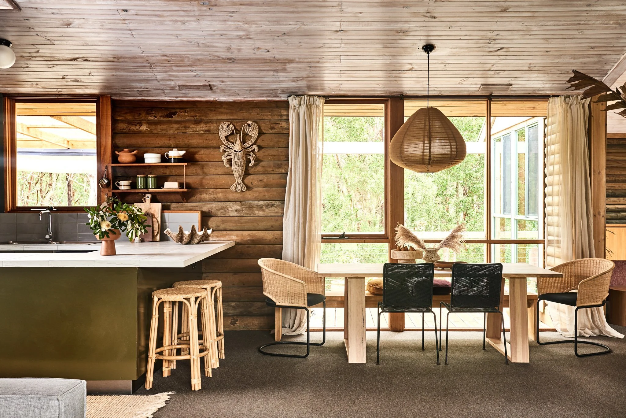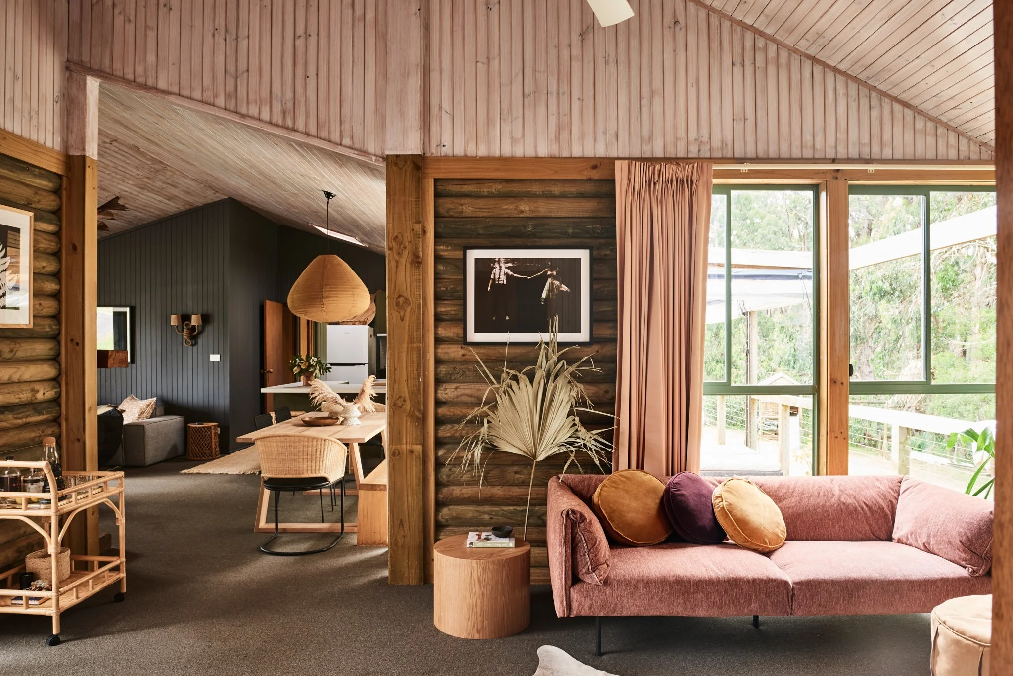 Furthermore, having taken inspiration from the surrounding lush greenery of the Otways, the pair worked with the apparent characteristics of the home. The rustic wooden walls were the motivation for the interior furnishings and finishes. By upgrading the kitchen with a new benchtop, painted joinery, cabinetry, and new curtains, achieve a quirky yet calming feel.