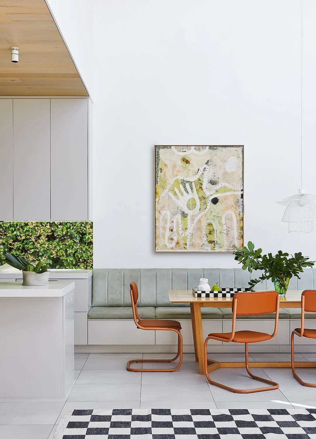 Sensitively working with the architecture and the home’s original 1950s era, Lucy chose accents of vibrant colour and minimal, modernist furniture to complement the timeless structure. For the dining room, the Strut Chair was selected for its metal cantilever frame upholstered in Italian terracotta leather.