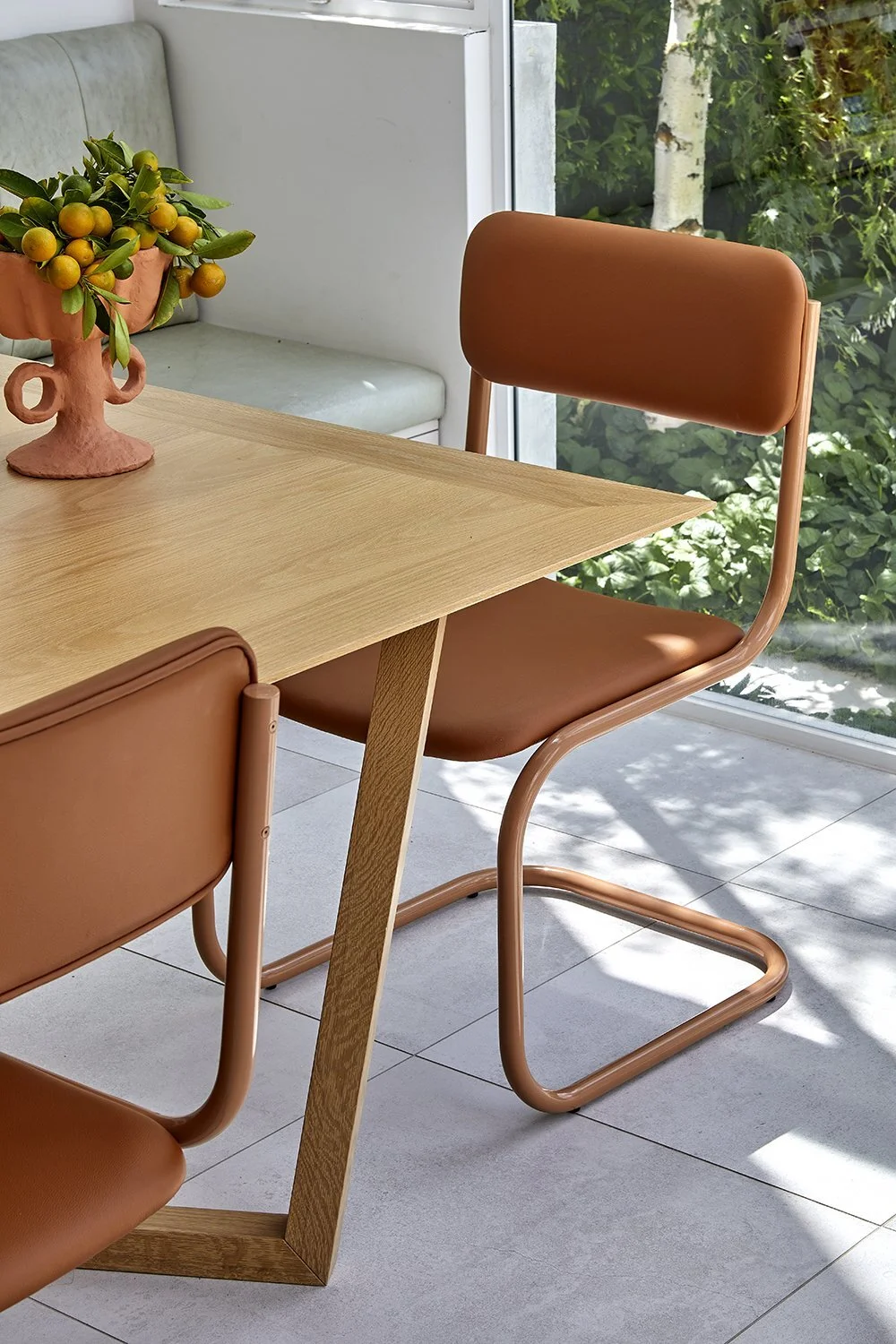 The Strut Chair was selected for its metal cantilever frame upholstered in Italian terracotta leatherPhoto: Dave Kulesza. Styling: Fenton & Fenton