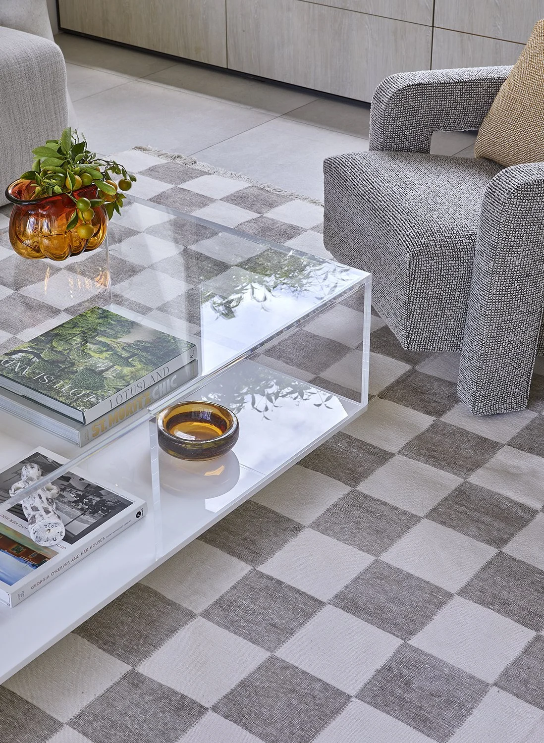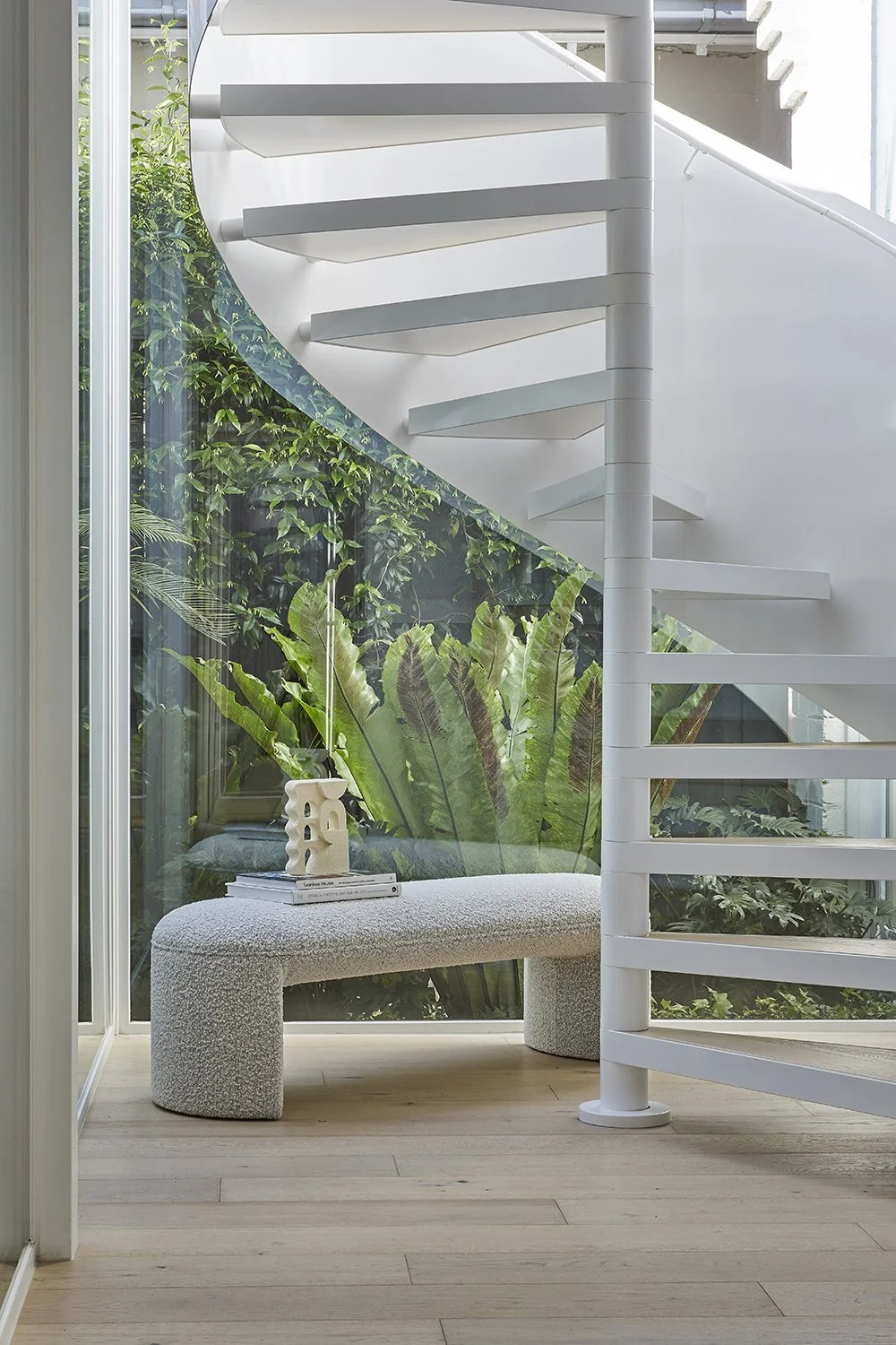 ‘The pale and calming palette of raw materials set the tone for this sunny and invigorating family home,’ Lucy shares. ‘From the grand double height voids to the internal atrium garden, the furniture, artwork, and homewares selected inside and out were chosen to invite a sense of calm.’