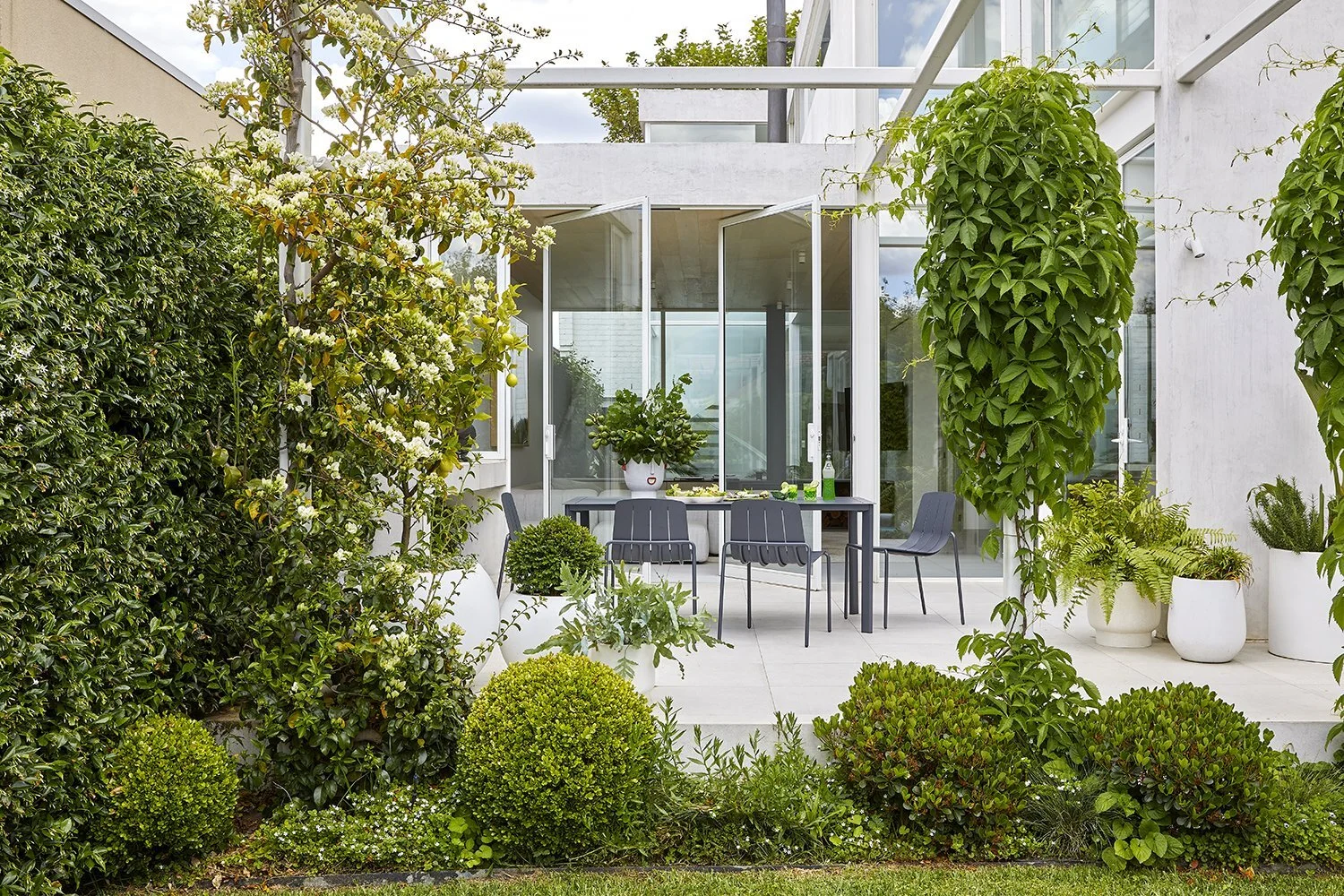 Floor-to-ceiling windows open the lounge out entirely to the courtyard, where retro dining furniture complements the clean, modernist aesthetics within. A minimalist aluminium Sundowner table matched with low slung slim chairs in white and charcoal creates an alfresco zone that is private and inviting.