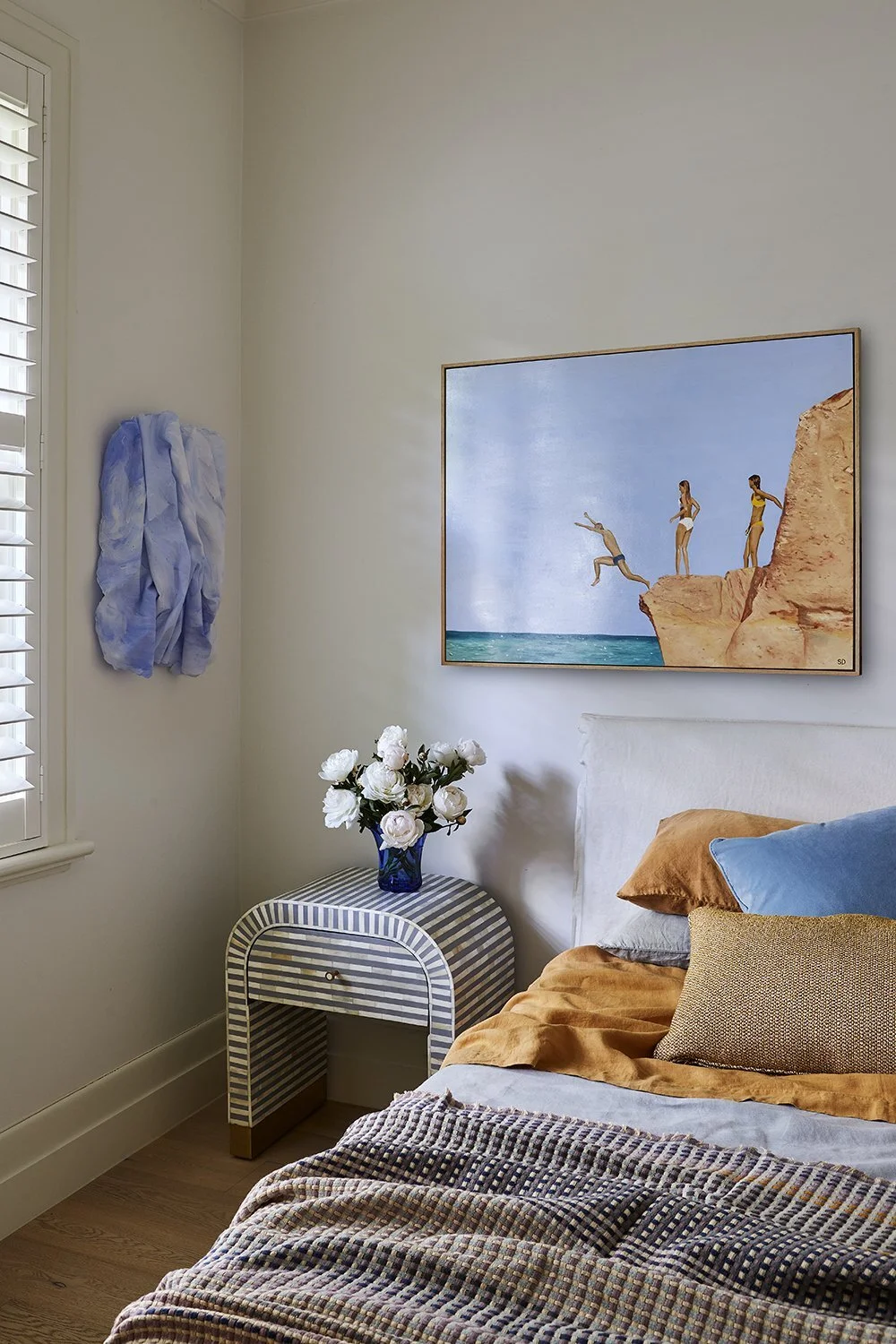 ‘Combine texture, colour, and pattern to create a bedroom retreat that makes you feel like you are staying in a contemporary hotel. Introduce summery artwork and hues that take you to faraway places. A mix of textures add interest to this soothing palette.’ Photo: Dave Kulesza. Styling: Fenton & Fenton