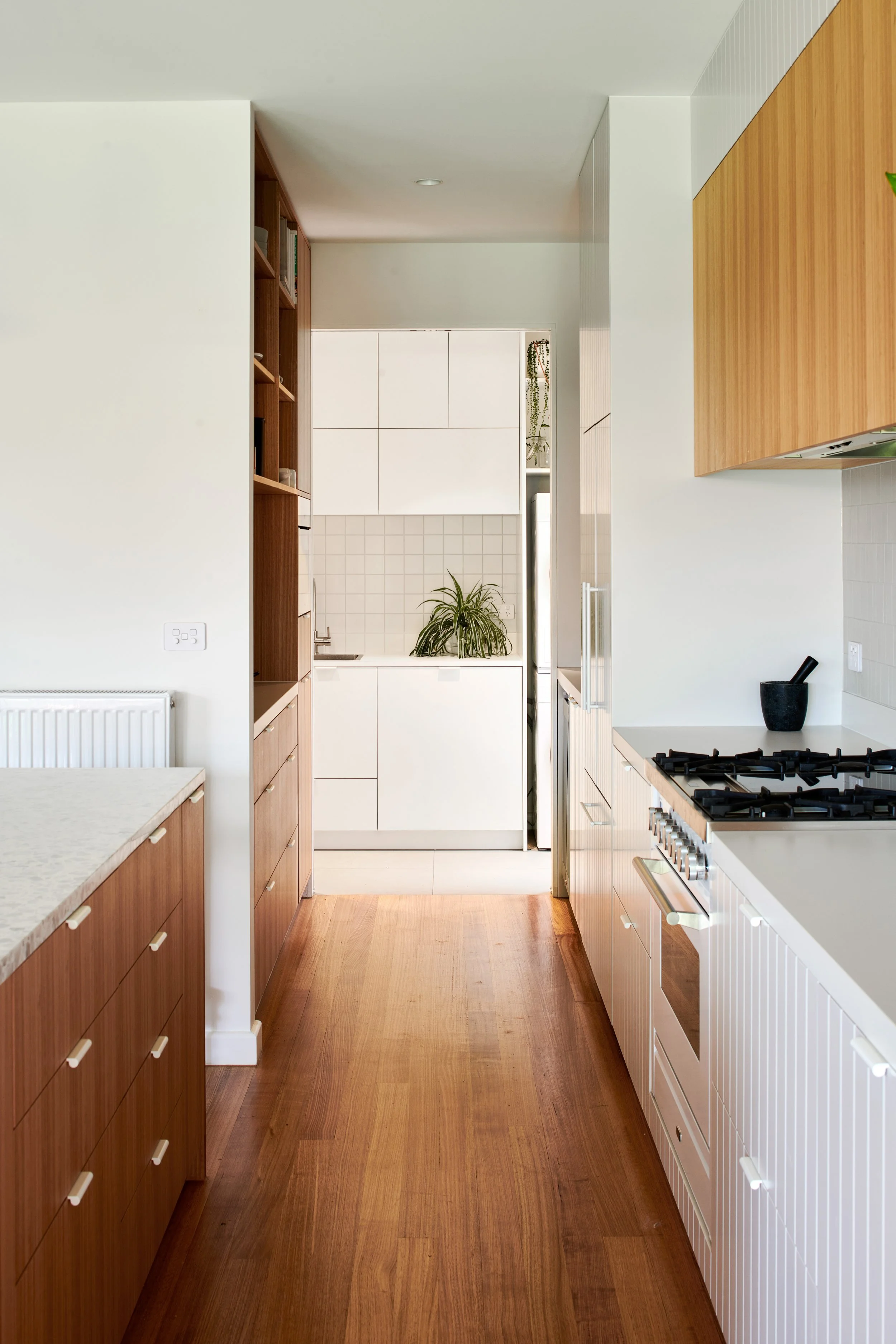 The open plan kitchen features blackbutt timber veneer, which is also found in the living space. Photo: Dean Bradley