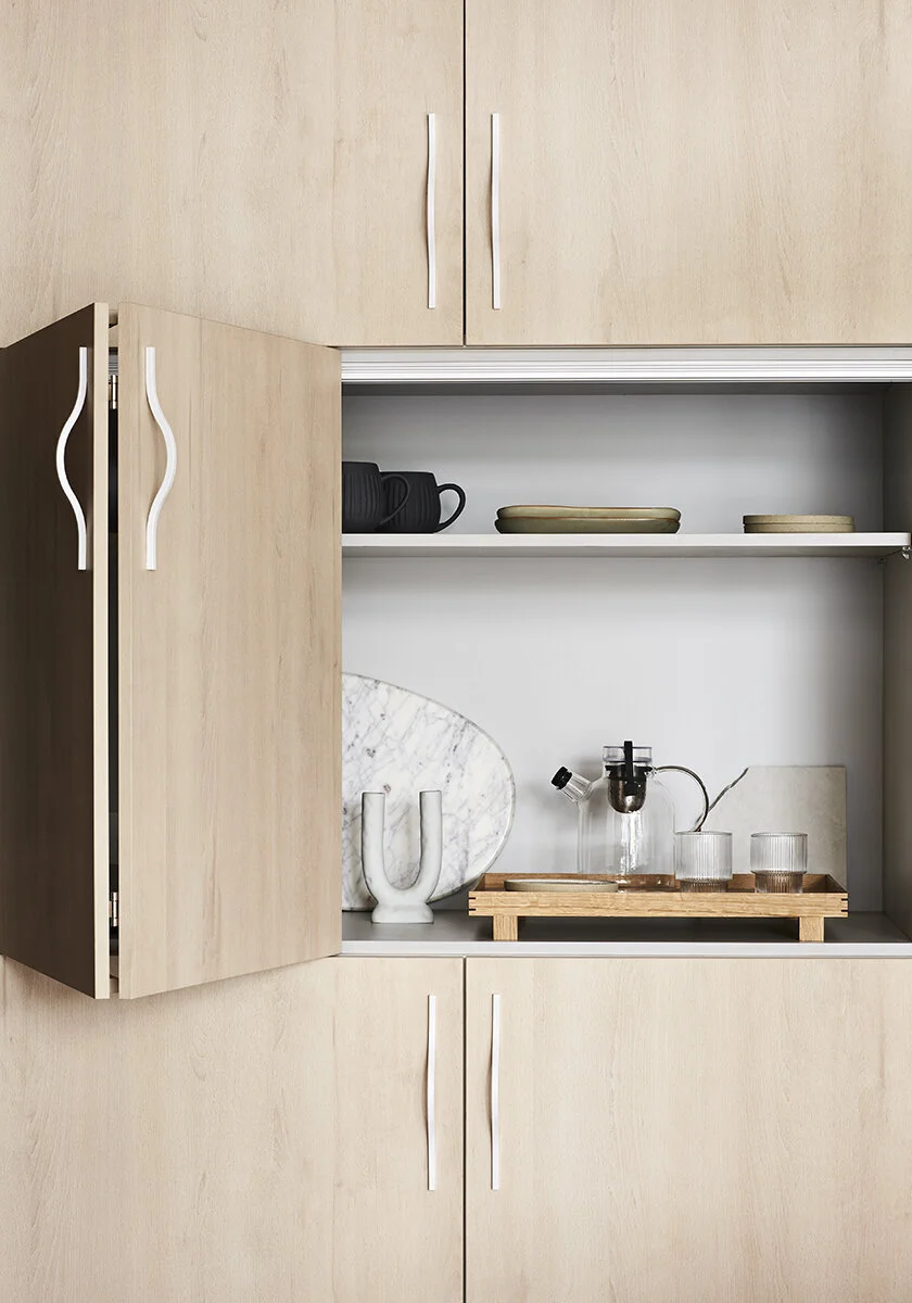 Clever storage reveals an all-important coffee and tea station. Photo: Tess Kelly