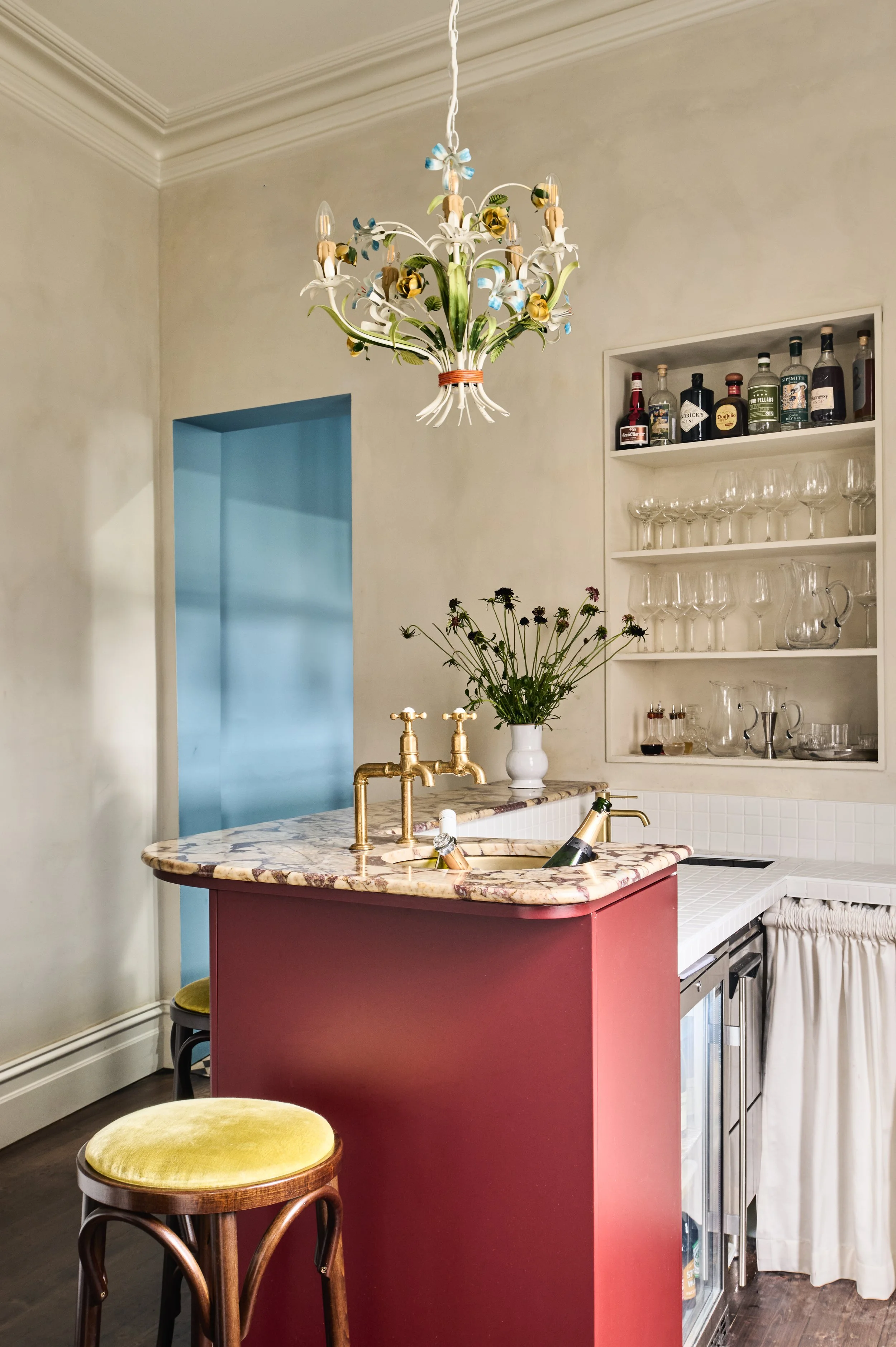 ‘Each vantage point was considered in the design, so that a sense of exploration and discovery is encouraged for its patrons, as it is in travel,’ says Anouska. Windows are framed by short floating curtains, a small marble ledge beneath a wall light hangs off a wall offering a place to wait for a table with a drink, a red waiter's station is designed like an antique armoire, a vintage floral steel pendant blooms from the ceiling and wine shelves draw the eye in, painted in Dulux Post Boy. ‘The blue corridor beckons you with a checkerboard floor and colour-soaked walls, light reflects off brass inlaid tables, and of course—looking above, a glass ceiling mirrors the world around back toward you.’